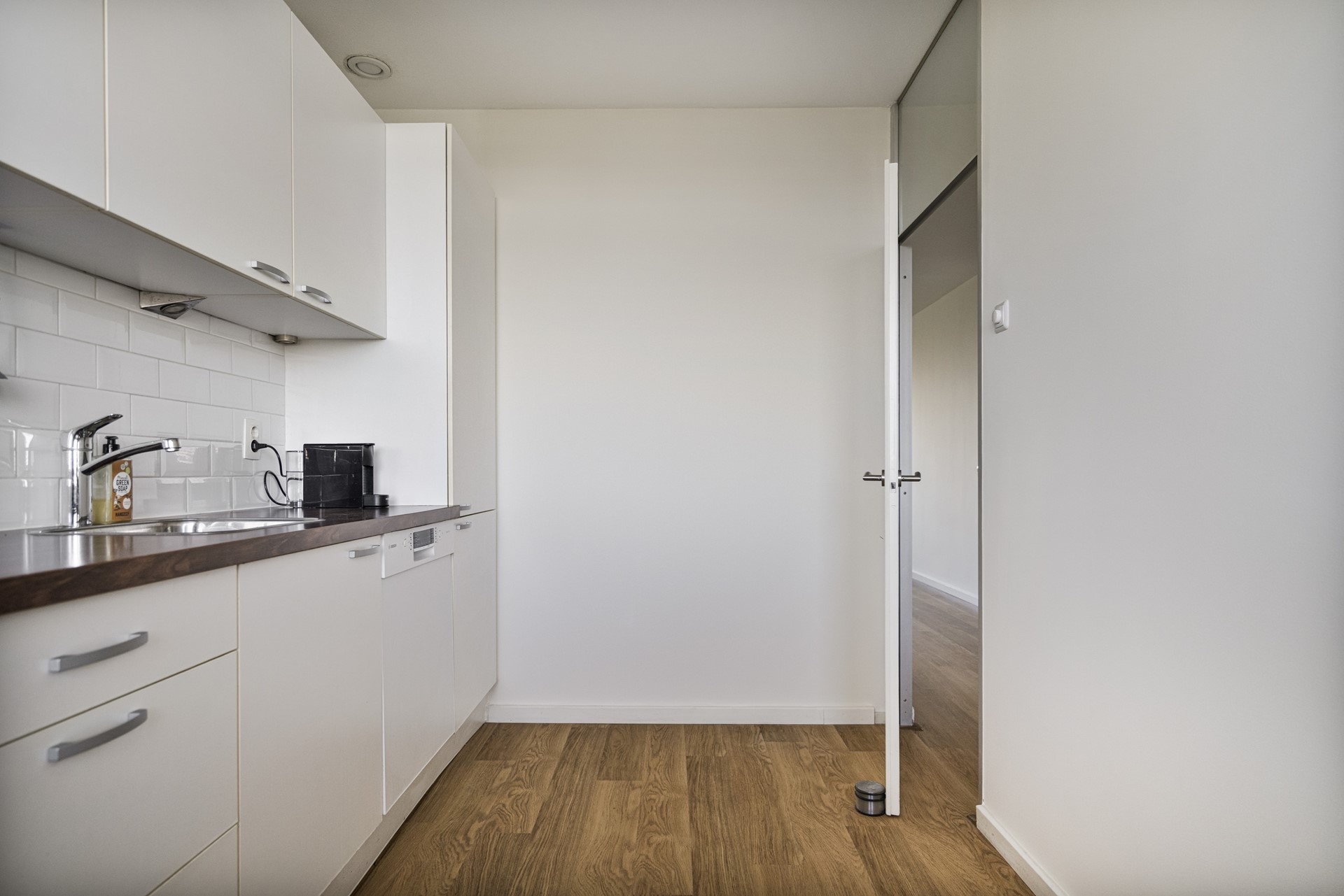 Aan de voorzijde bevindt zich de moderne keuken, praktisch ingericht en voorzien van diverse inbouwapparatuur. Of u nu een snelle maaltijd bereidt of uitgebreid kookt voor vrienden en familie, deze keuken biedt alle ruimte en mogelijkheden.