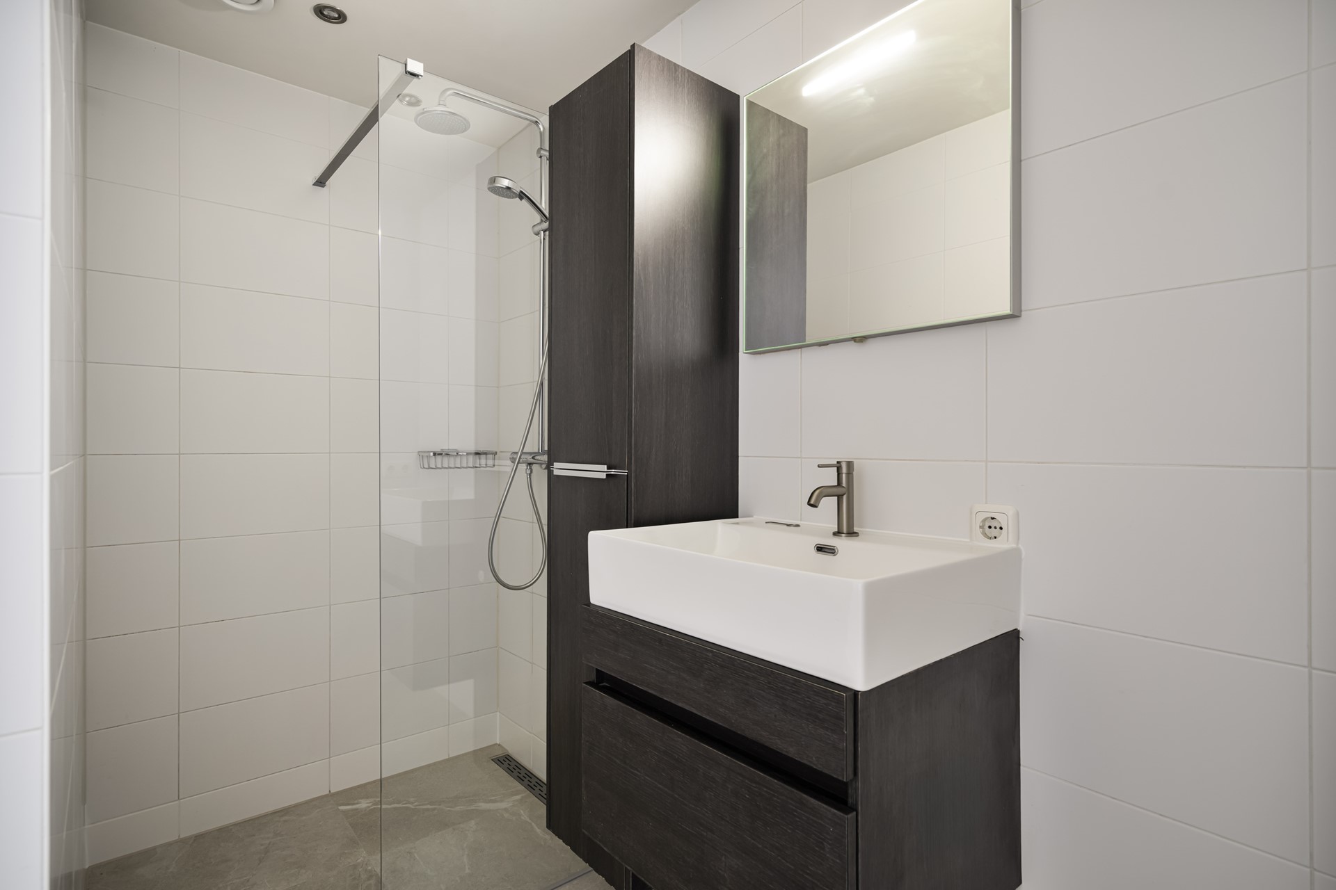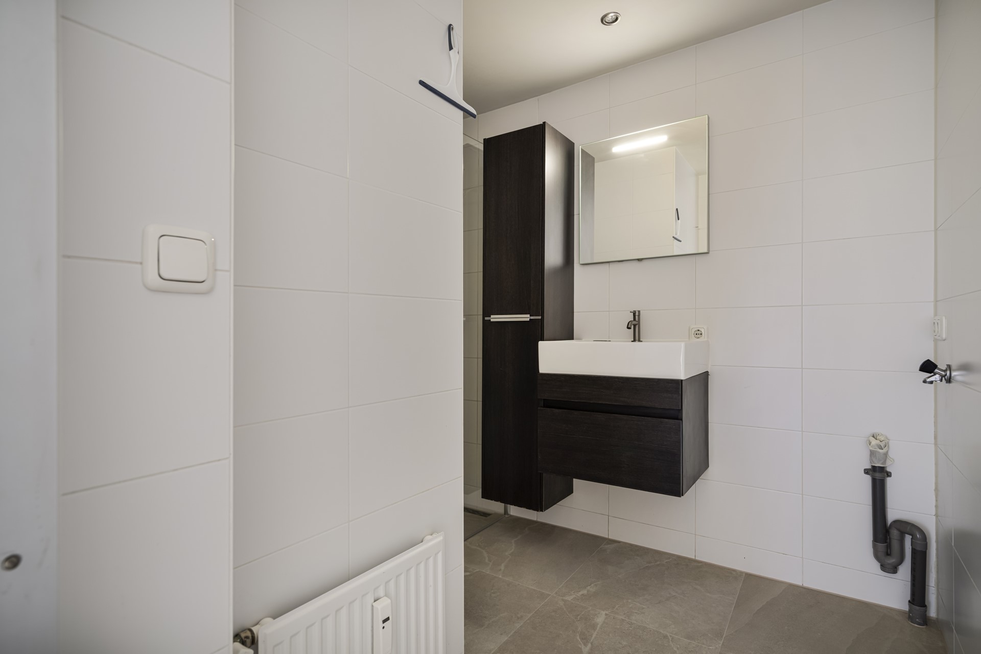 De moderne badkamer is stijlvol uitgevoerd en voorzien van een inloopdouche, wastafelmeubel en aansluitingen voor wasmachine en droger.