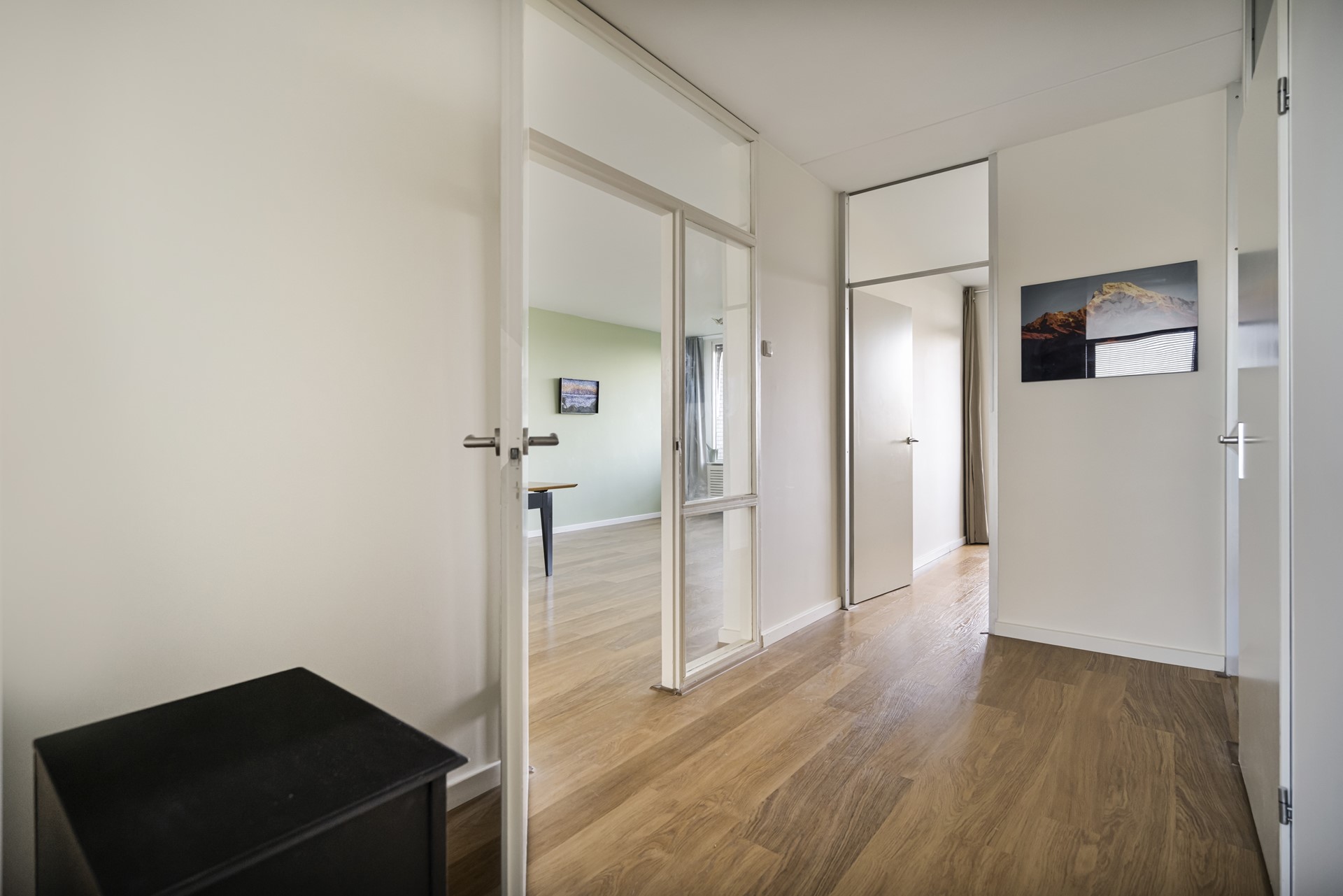 Via de tussenhal bereikt u de drie goed bemeten slaapkamers, ideaal voor een gezin, thuiswerkplek of logeerkamer.