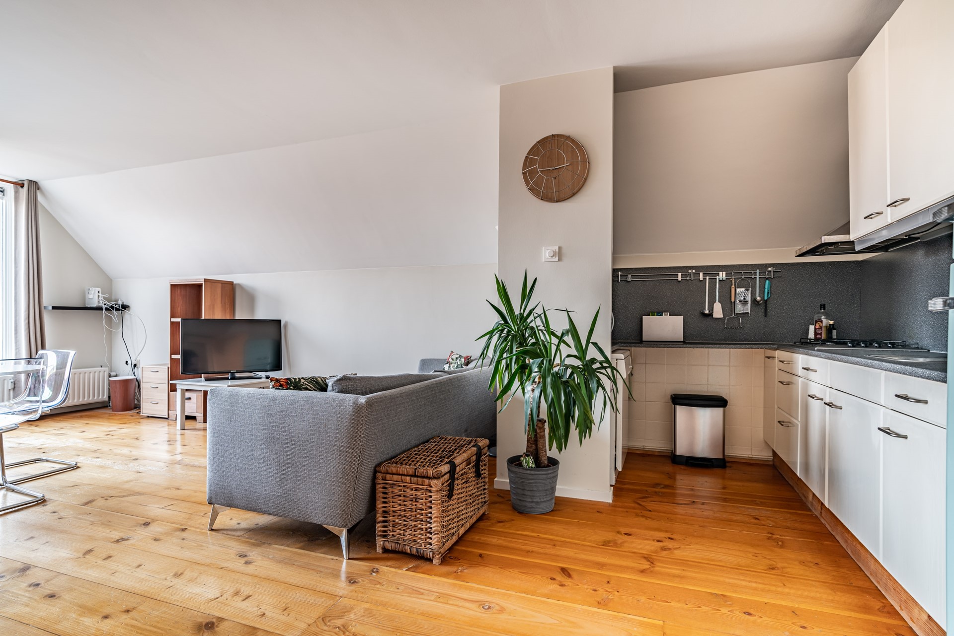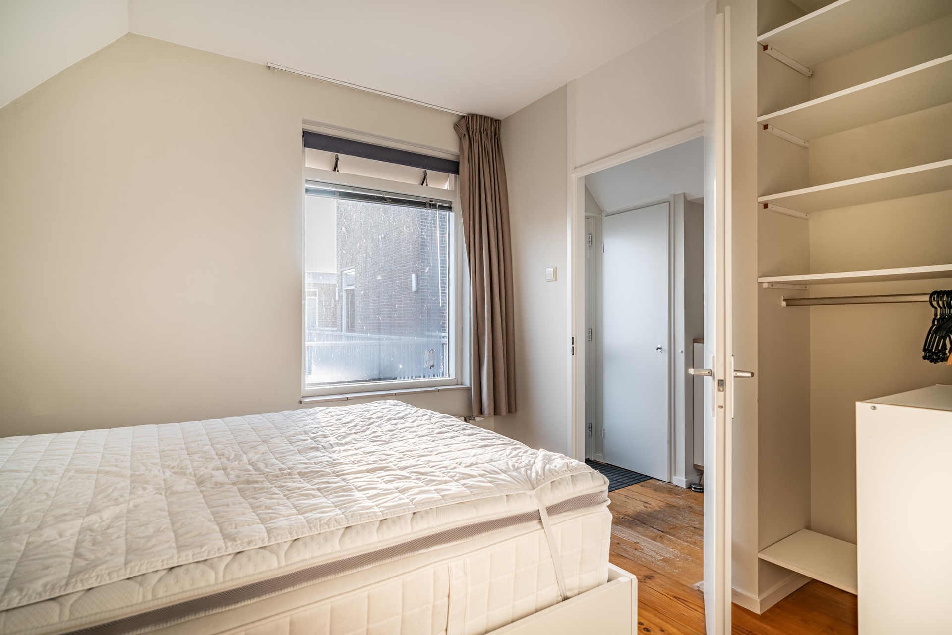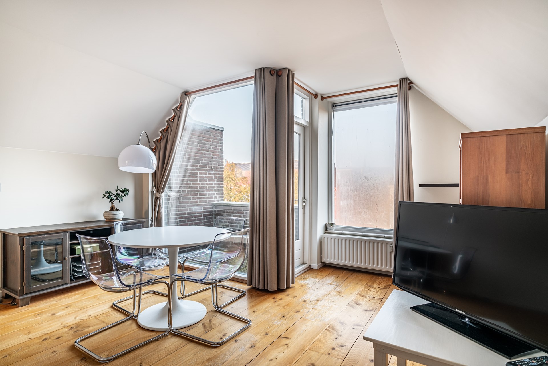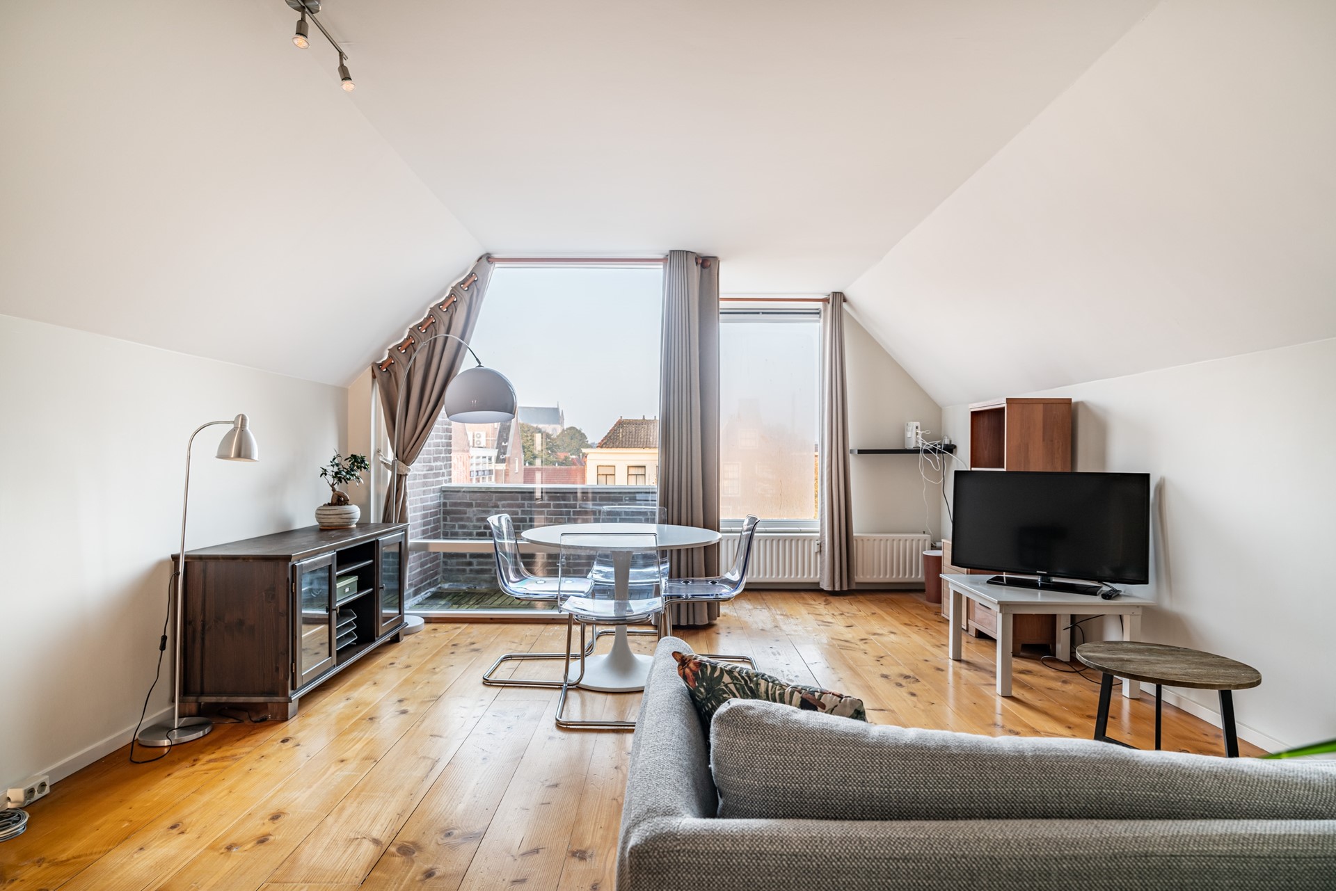 Gallery with a corner seating area for the apartment, hallway, meter cupboard with 5 circuits + earth leakage circuit breaker, and toilet with hand basin. Bright living room with wooden flooring and a stunning view over the Herengracht canal. The living room leads to the west-facing balcony. From this balcony, you can see the Hooglandse Church. The open-plan kitchen is equipped with a 4-burner gas cooktop, extractor hood, fridge-freezer, and dishwasher. The bedroom also has wooden flooring and provides access to the bathroom with a walk-in shower, sink, and washing machine connection.