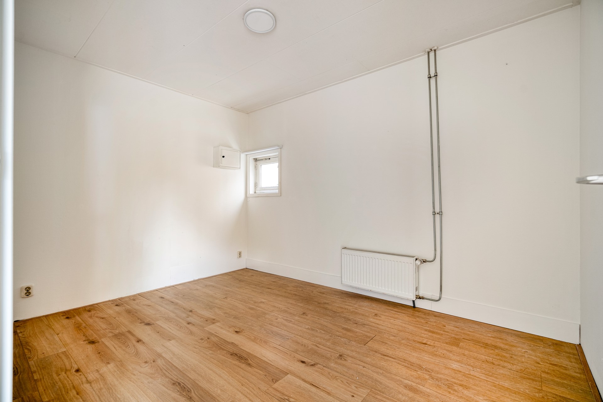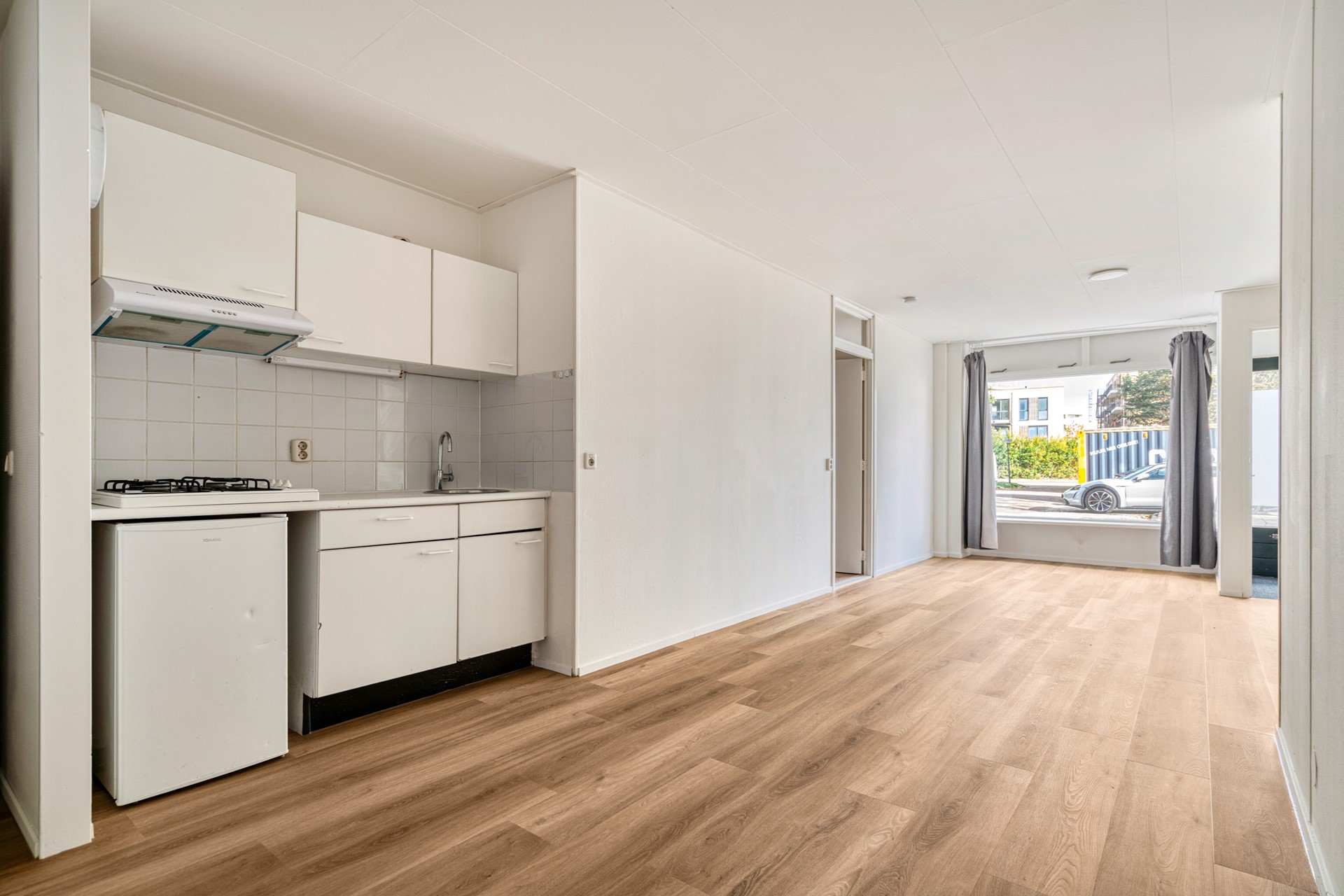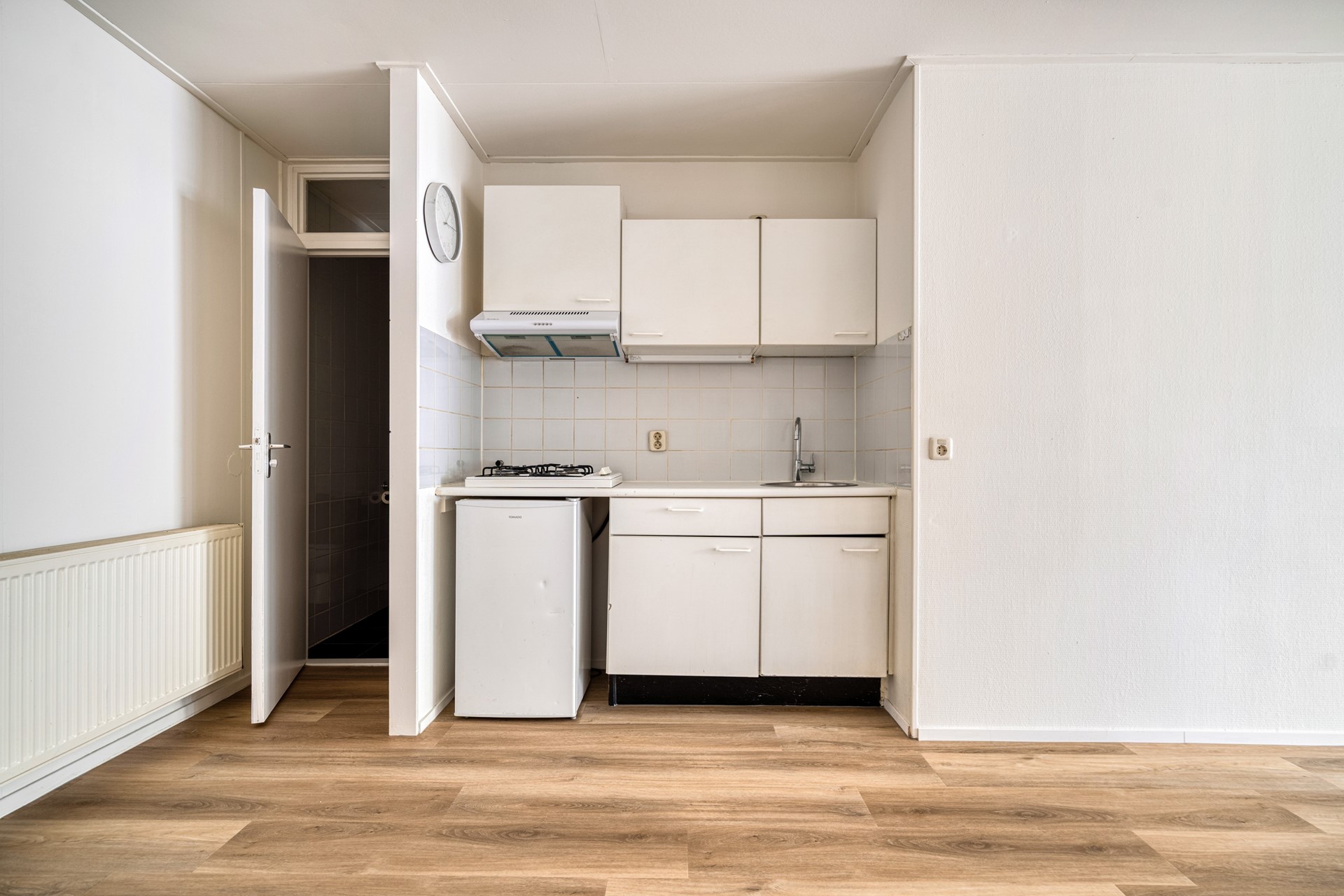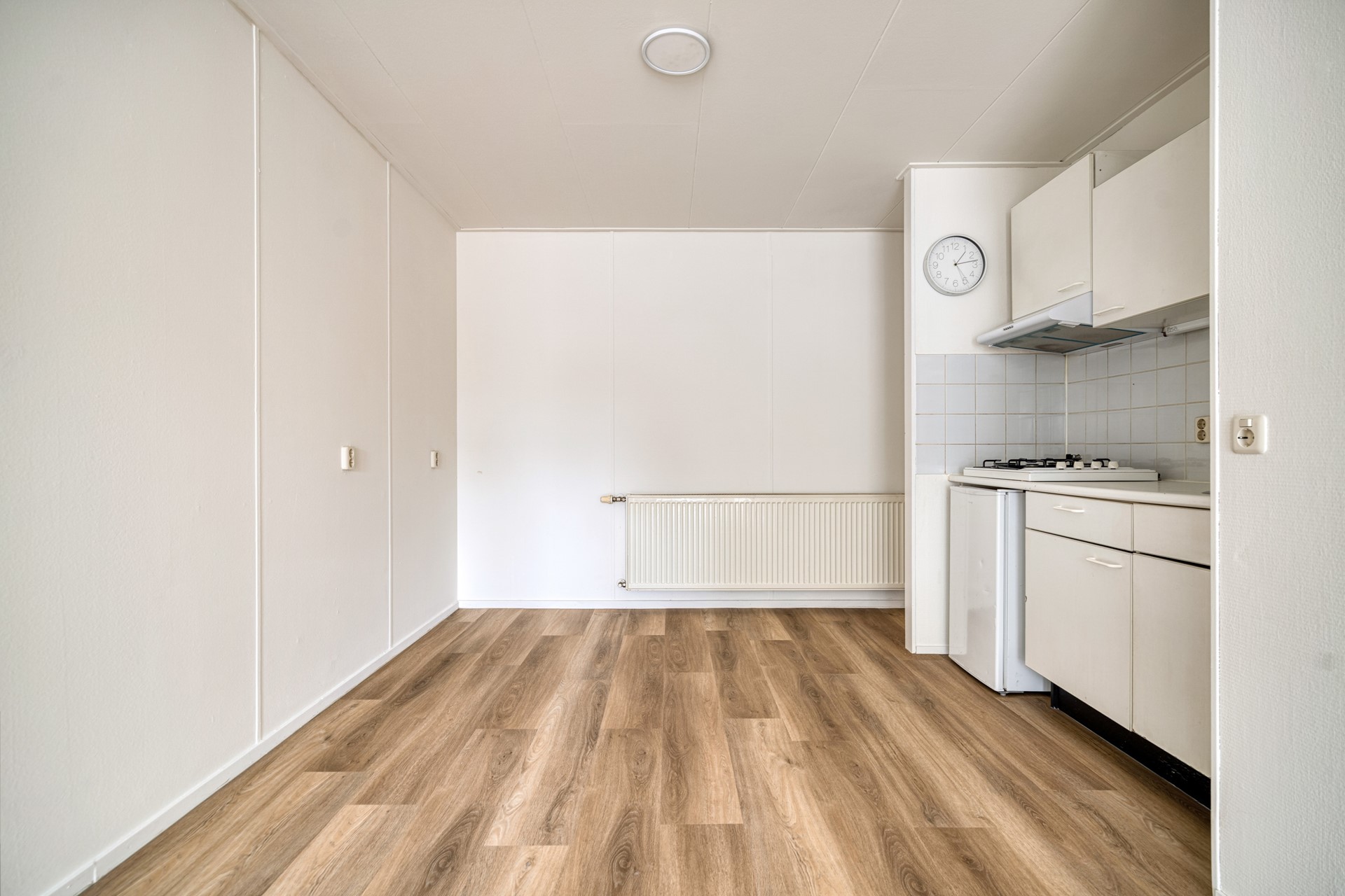 De open keuken is simpel ingericht maar biedt voldoende ruimte voor koken. De slaapkamer voorzien van een laminaat vloer van circa 10 m² is ruim genoeg voor een tweepersoonsbed en een kast.
