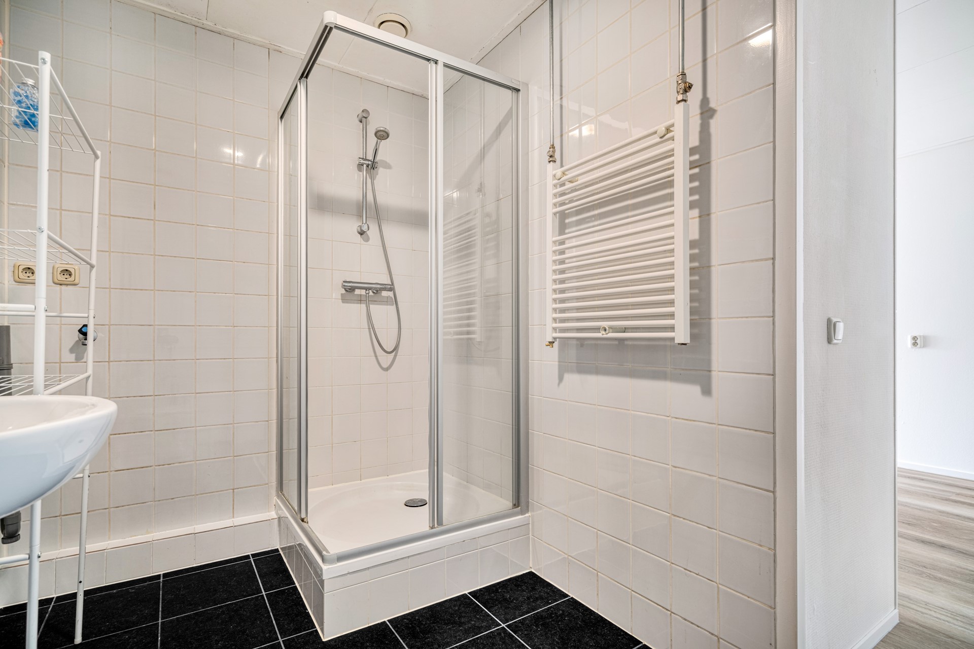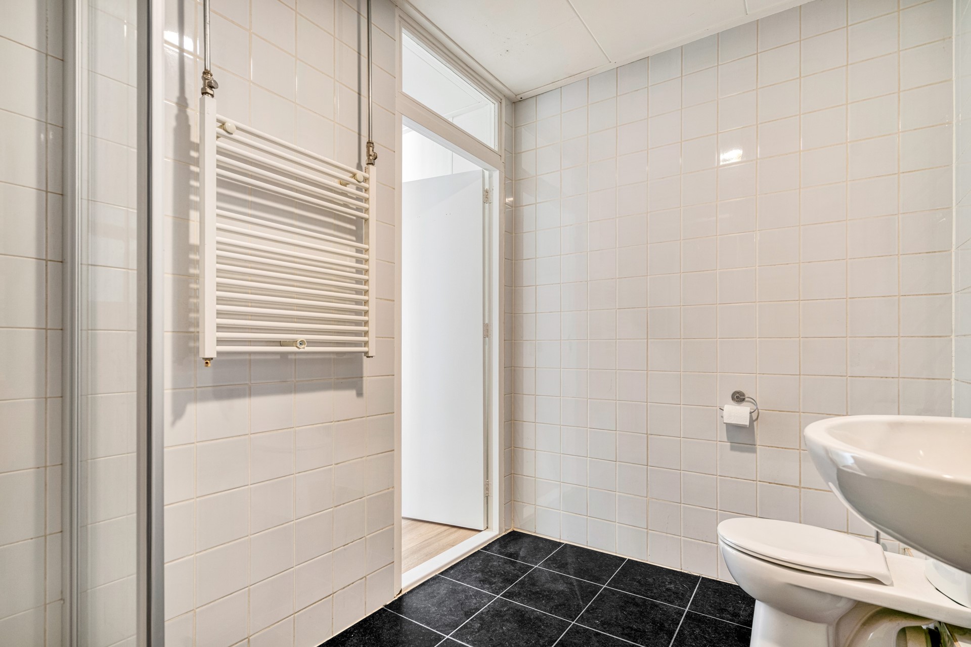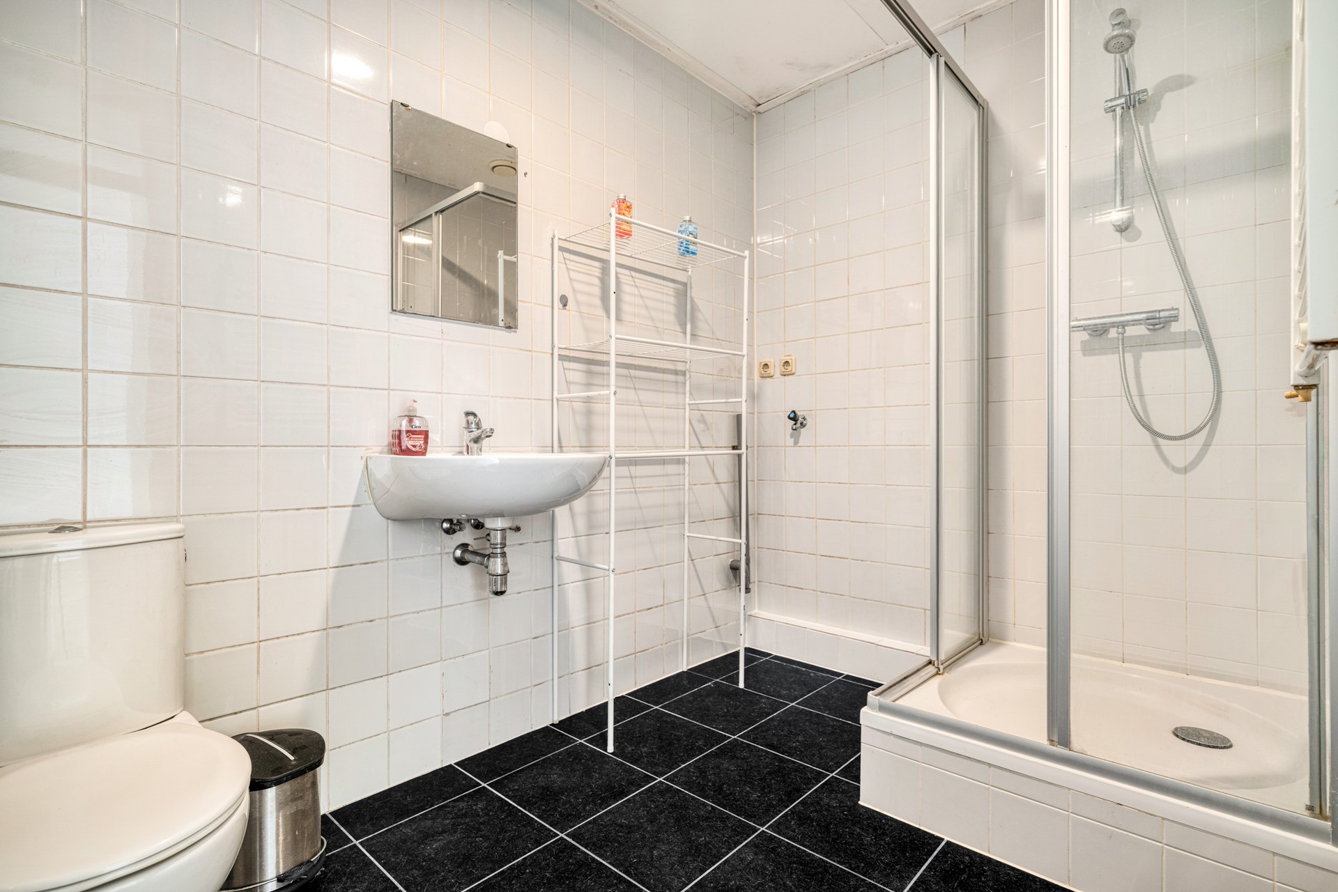 De badkamer is volledig betegeld en praktisch ingedeeld met een douche, wastafel, toilet en aansluiting voor de wasmachine.