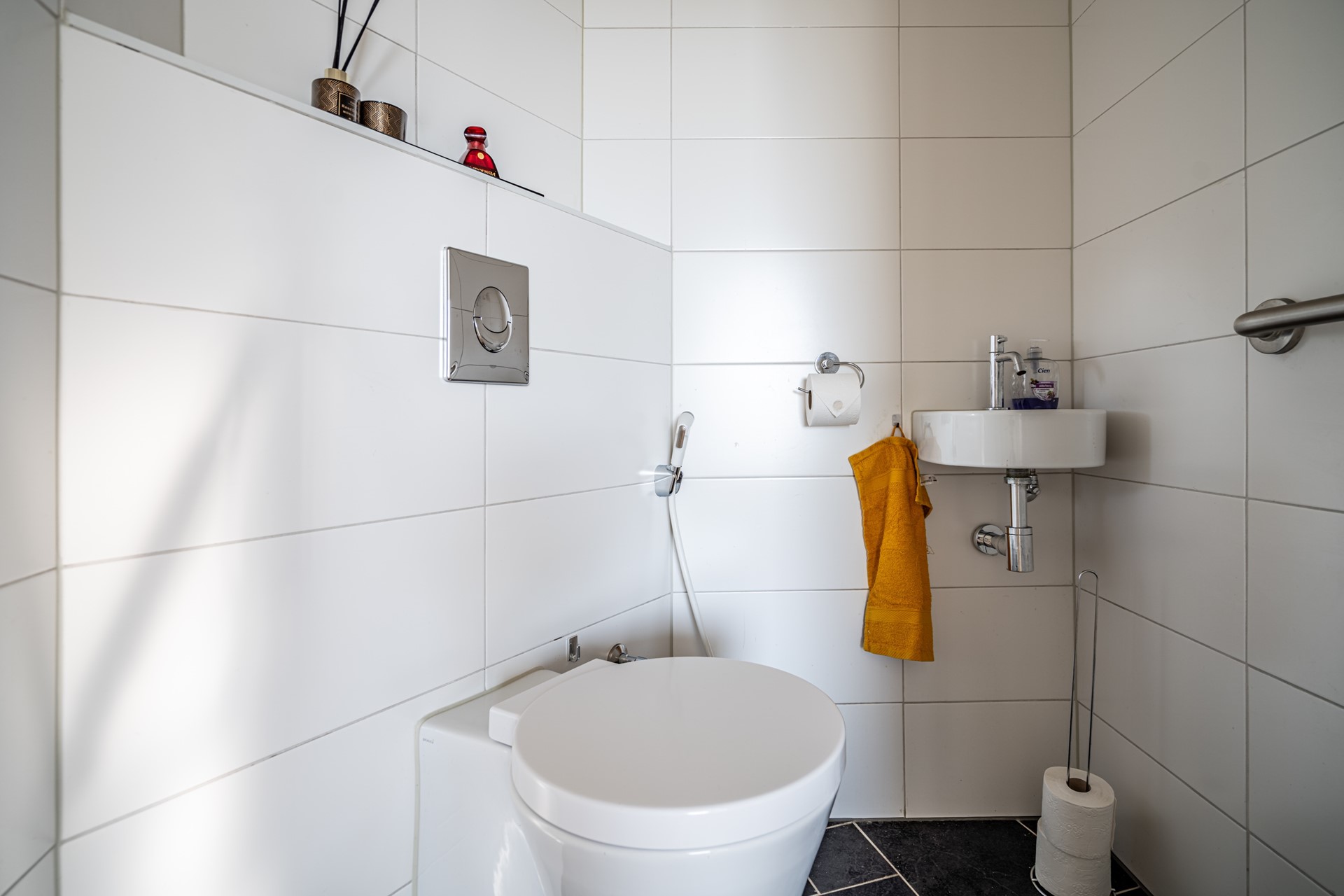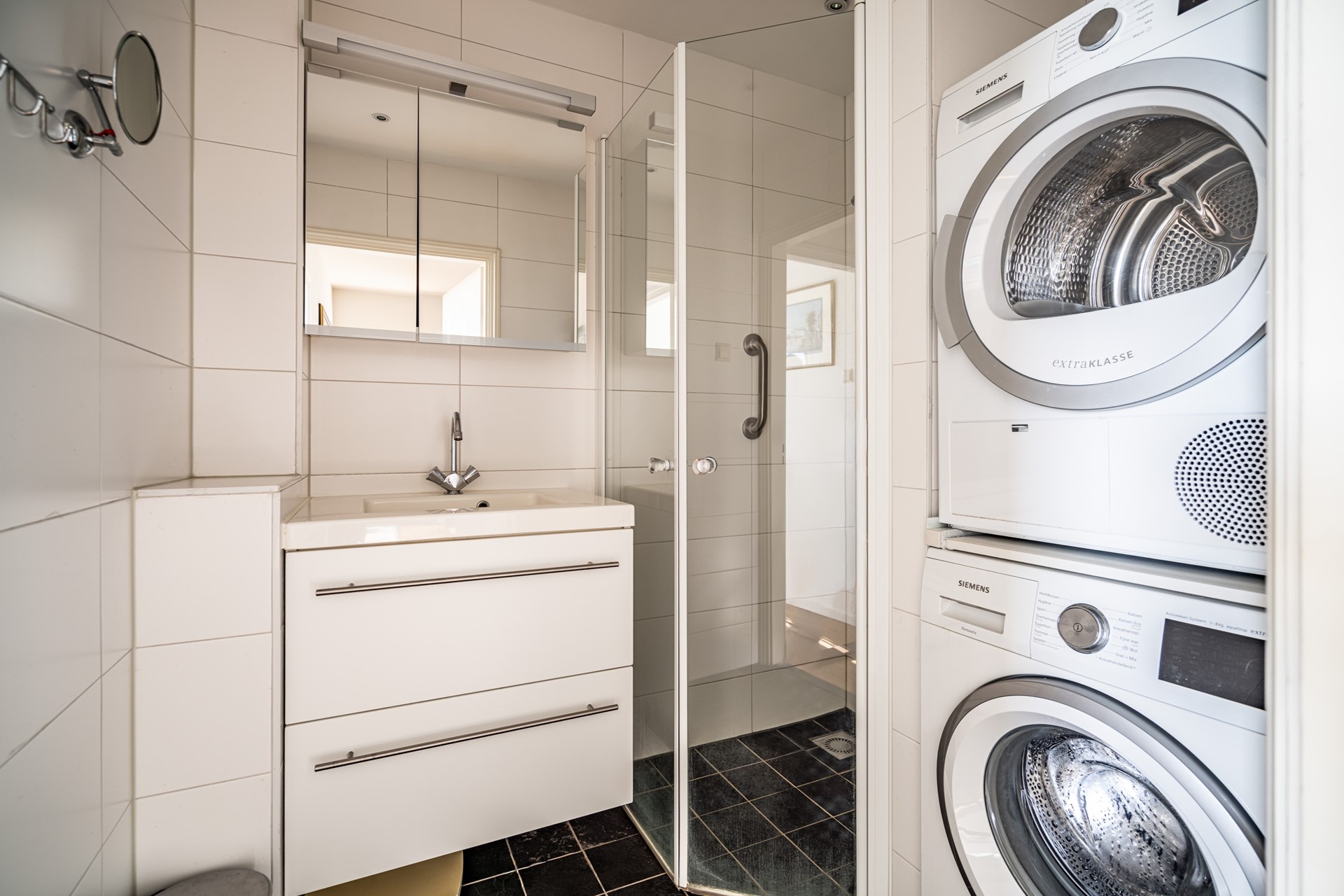 De moderne, volledig betegelde badkamer is praktisch én luxe: een ruime inloopdouche, een stijlvol wastafelmeubel en plek voor wasmachine en droger.