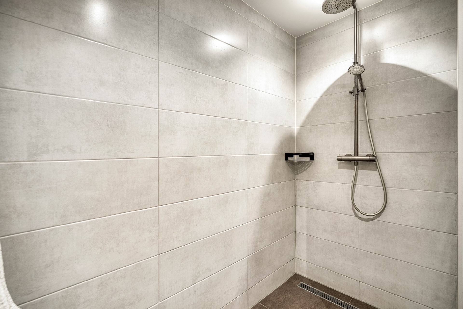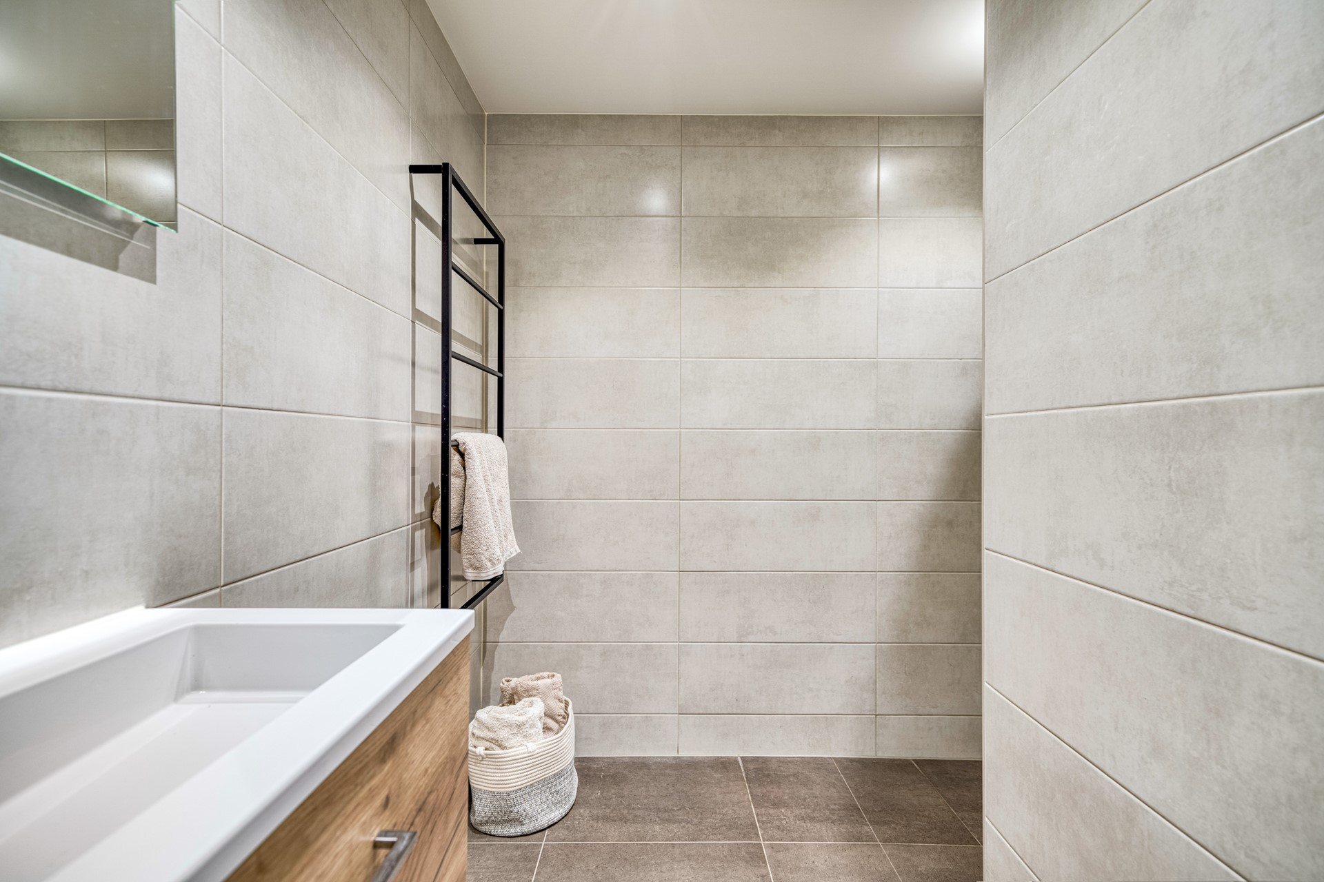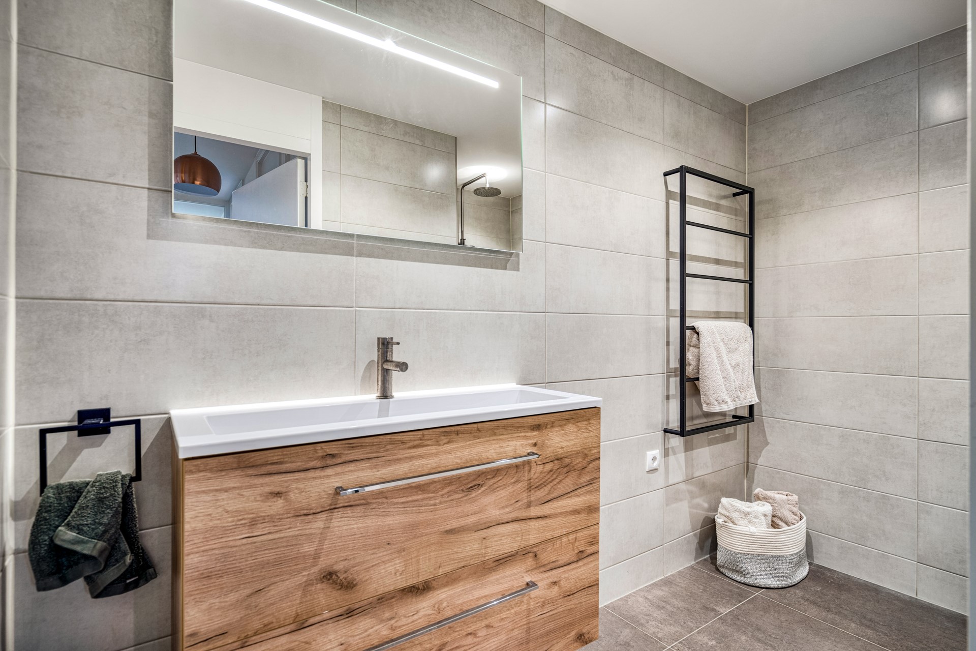 • Nette, volledig betegelde badkamer met douche, brede wastafel en spotverlichting