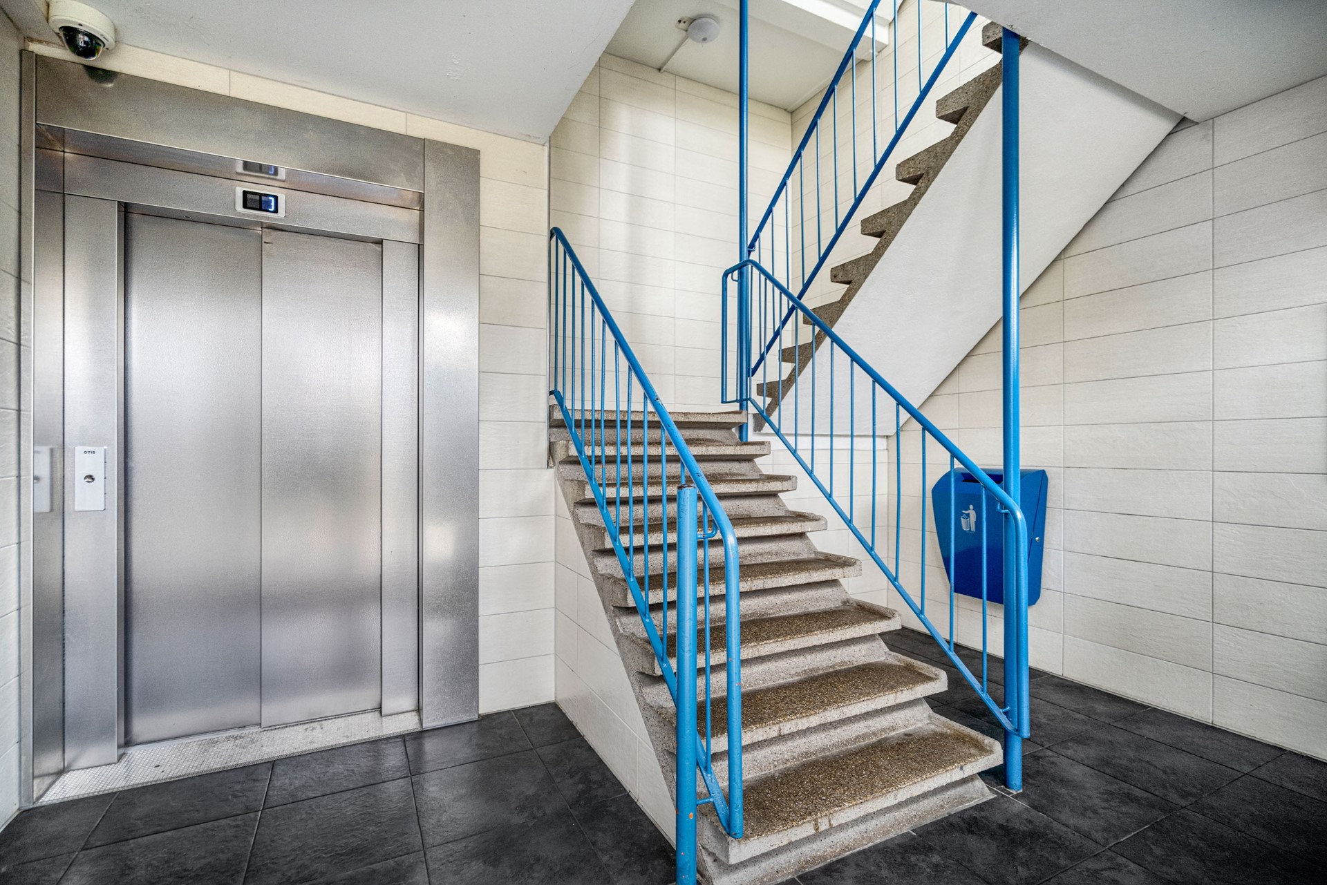 The neat, communal entrance with intercom, mailboxes, elevator, and staircase leads to the apartment on the third floor.