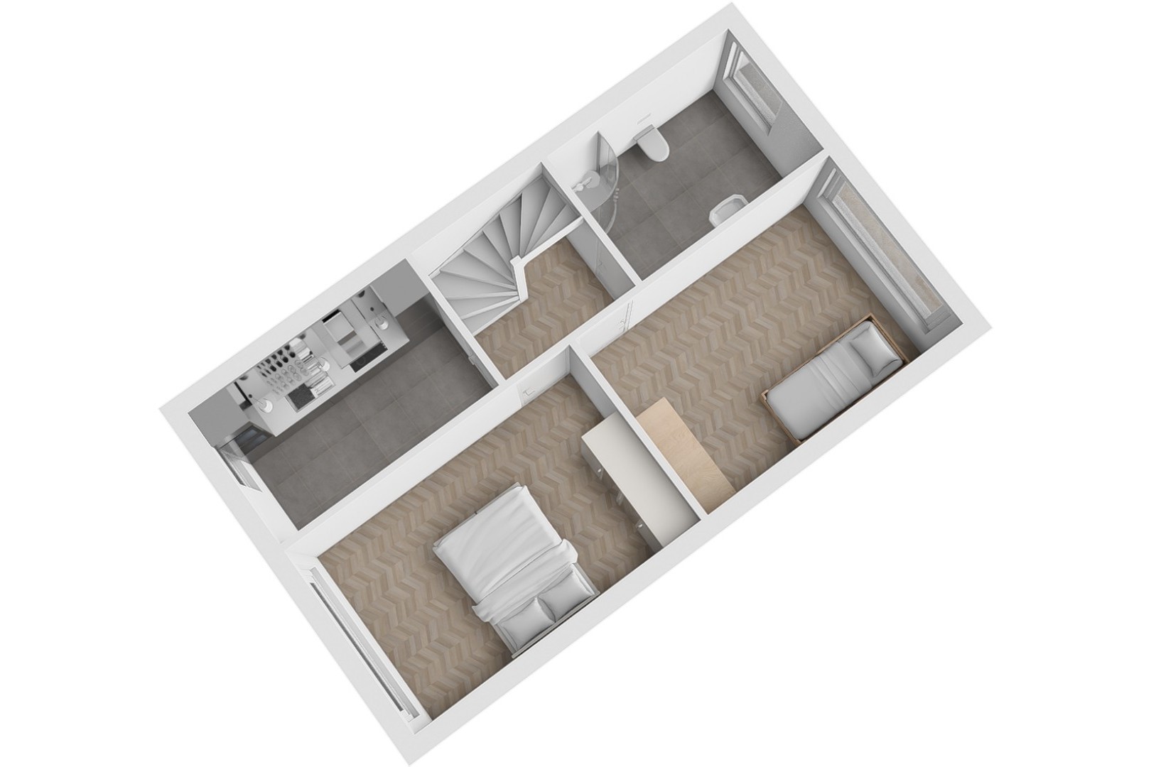 Overloop met ruime badkamer, op deze verdieping zijn 2 slaapkamers aanwezig. Voorheen waren er 3, maar hier is plaats gemaakt voor een extra keuken.