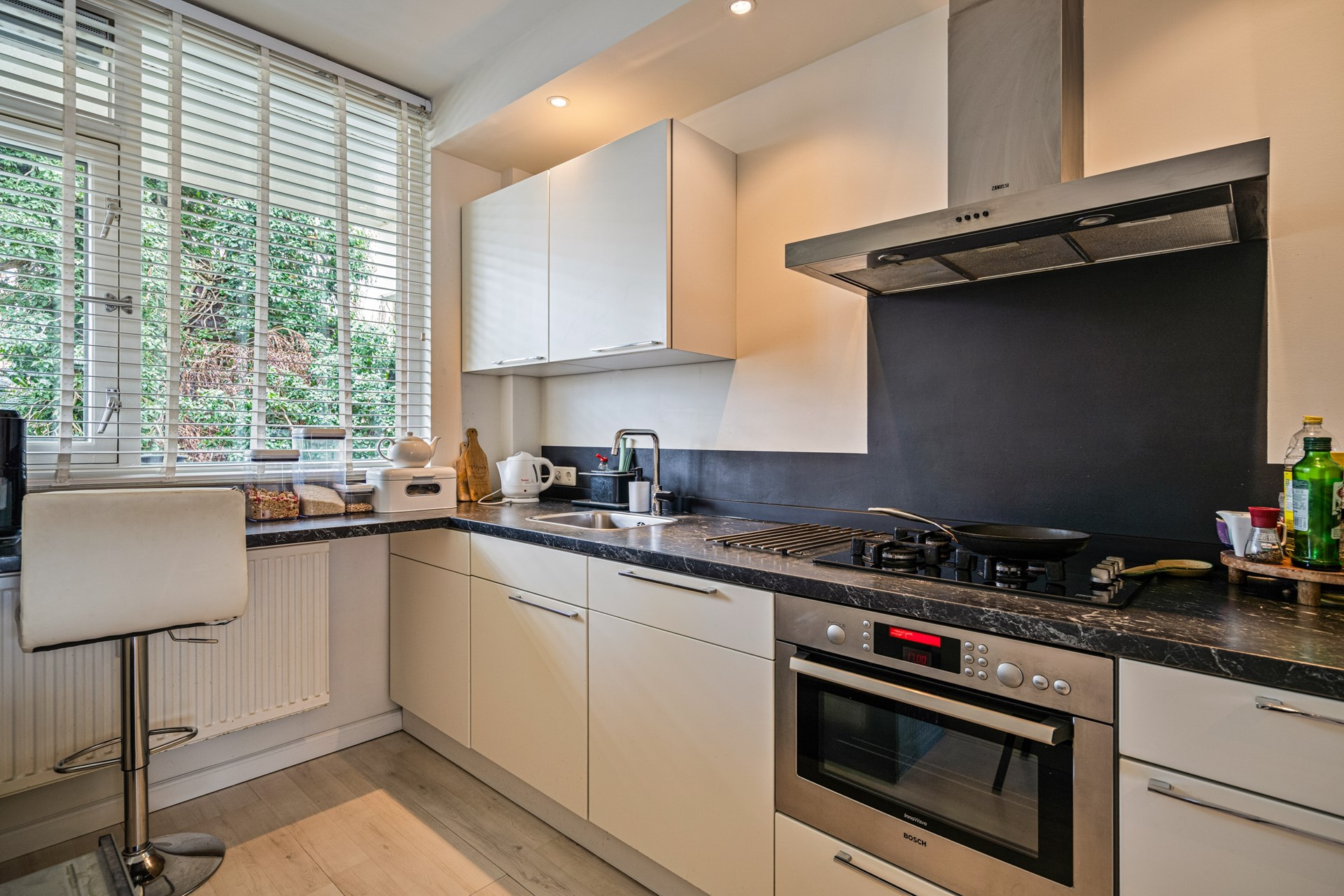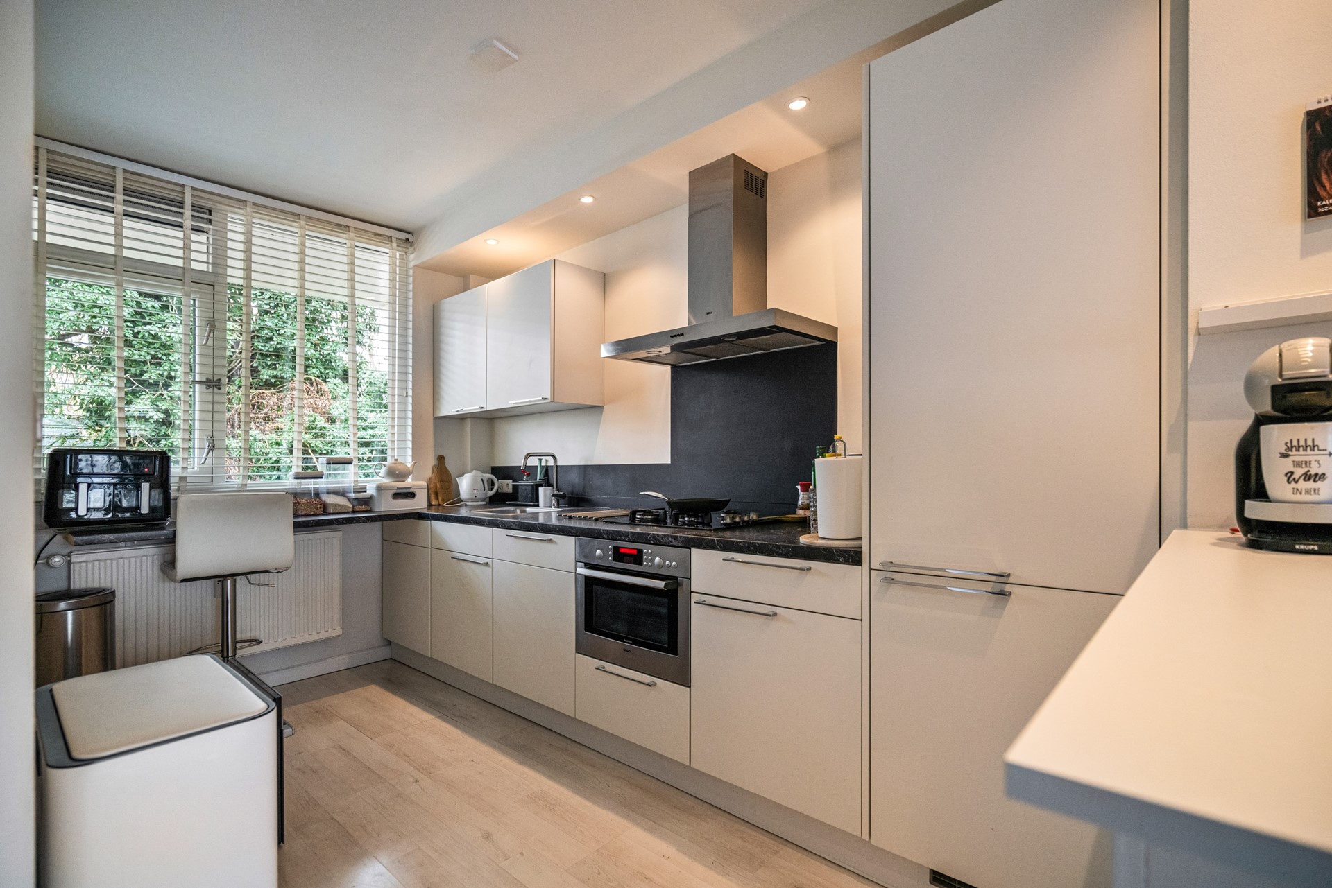 De open keuken is modern en strak uitgevoerd met een gezellige bar en voorzien van diverse inbouwapparatuur, waaronder een gasfornuis, afzuigkap, combimagnetron en koel-vriescombinatie. Een praktische en gezellige ruimte waar koken samengaat met dagelijks gemak.