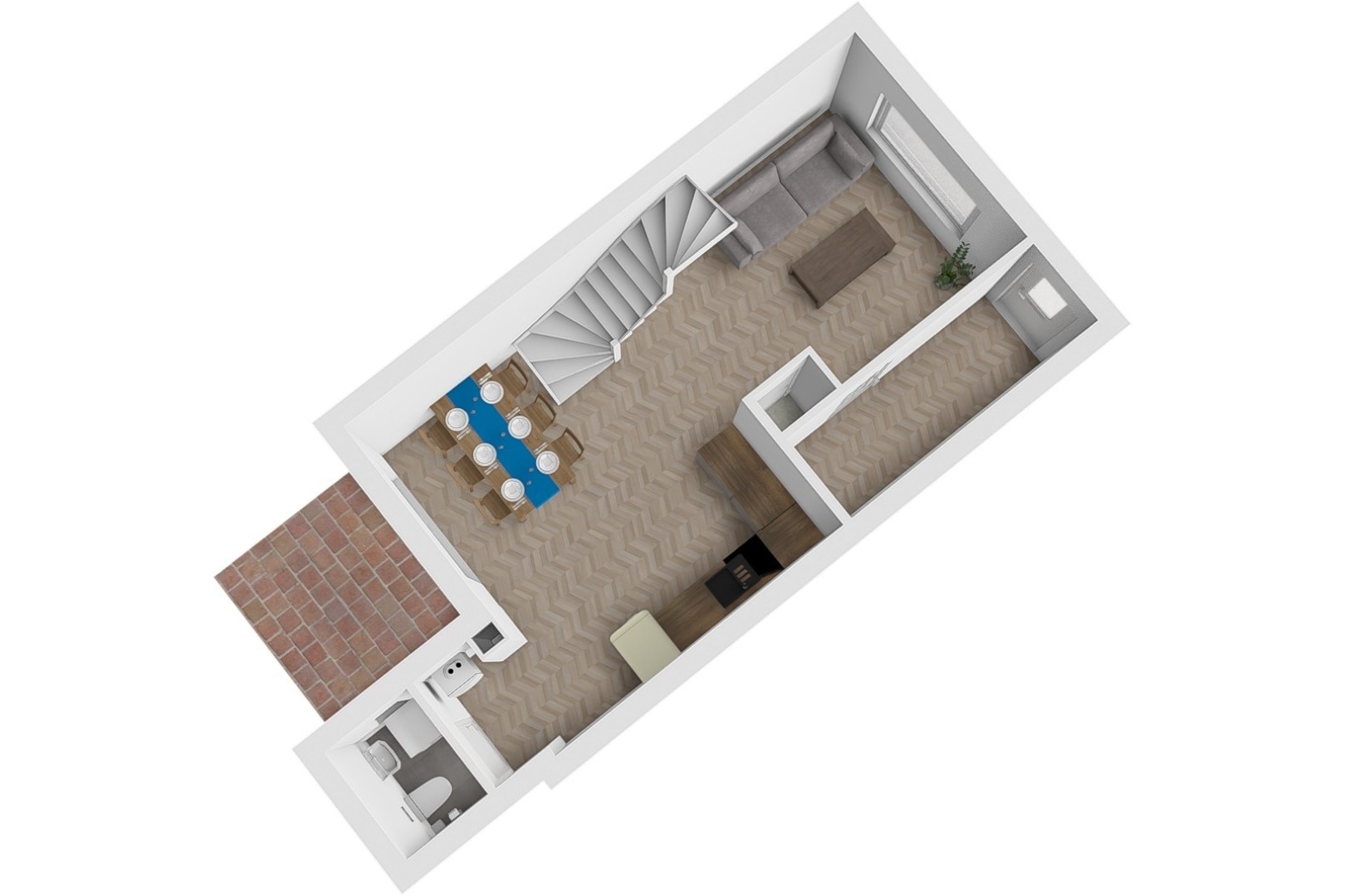 Op de begane grond is tevens een modern hangend toilet aanwezig. Via de keuken heeft u toegang tot de gezellige plaats aan de achterzijde, ideaal voor een zitje, planten of het genieten van een kop koffie in de ochtendzon.