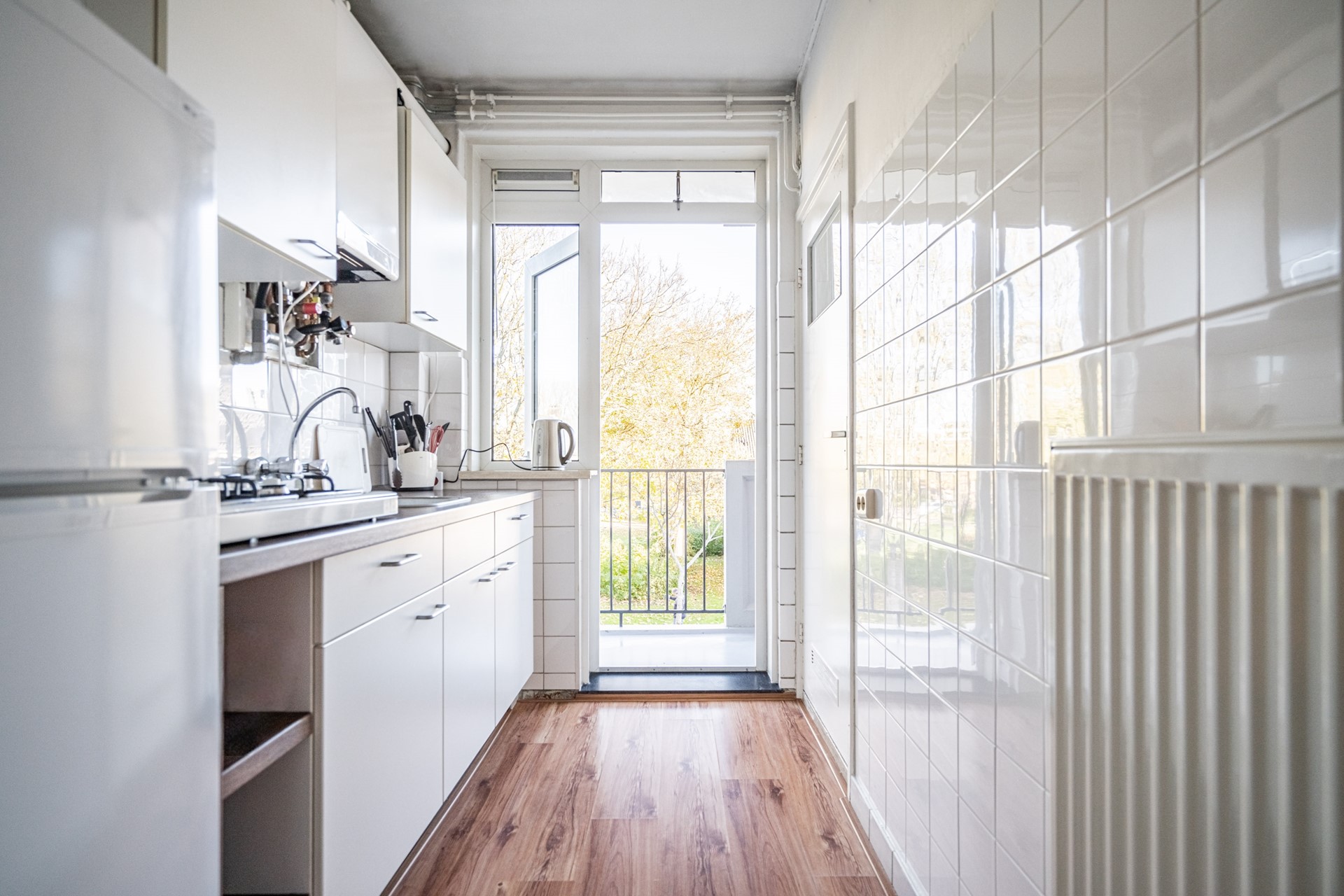 Keuken aan de voorzijde, voorzien van een vierpits gasfornuis, losse koelkast, CV-opstelling (2025) en toegang tot het balkon (noordoosten)