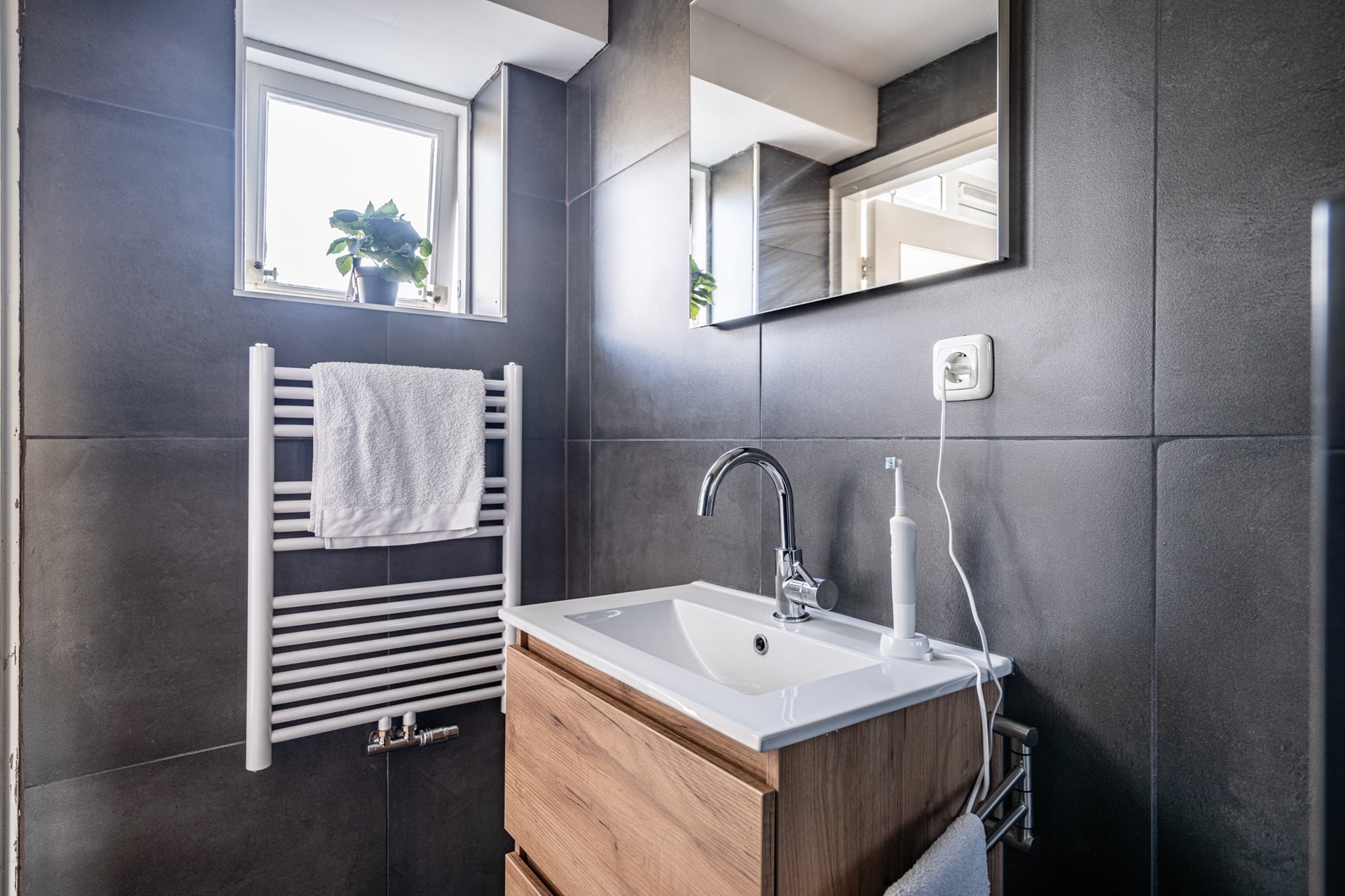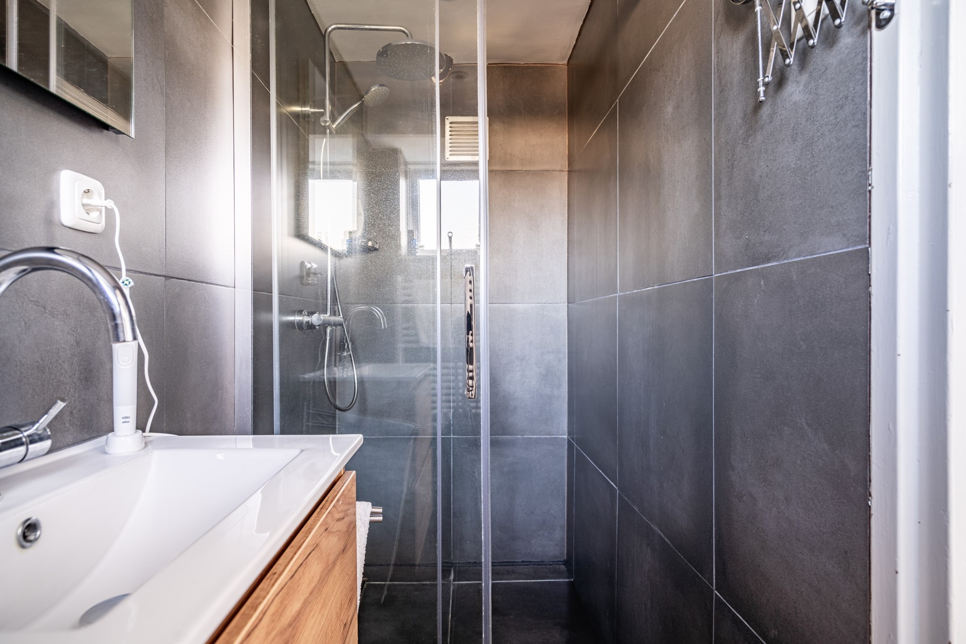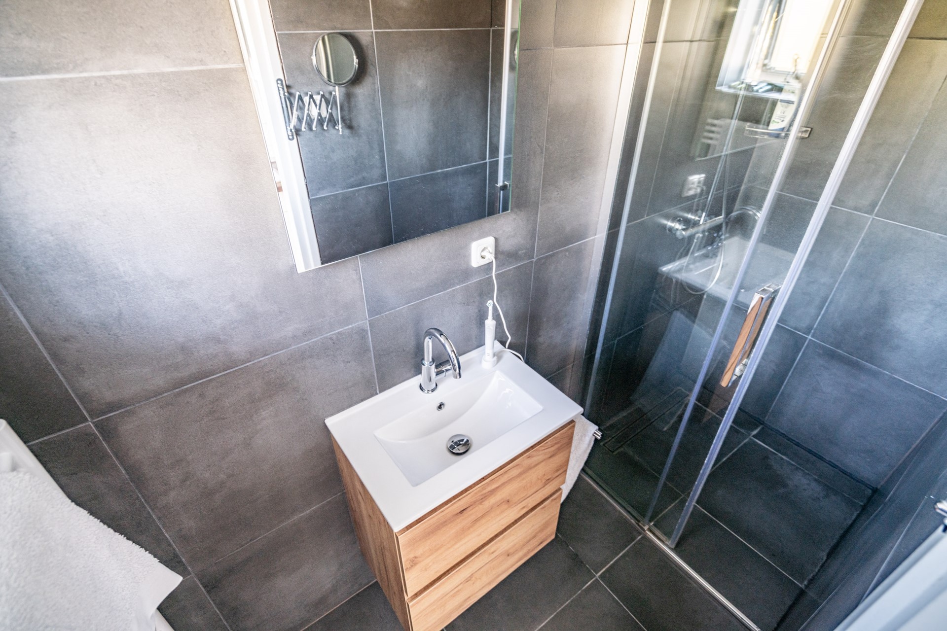 Volledig betegelde badkamer met inloopdouche met schuifwand en modern wastafelmeubel