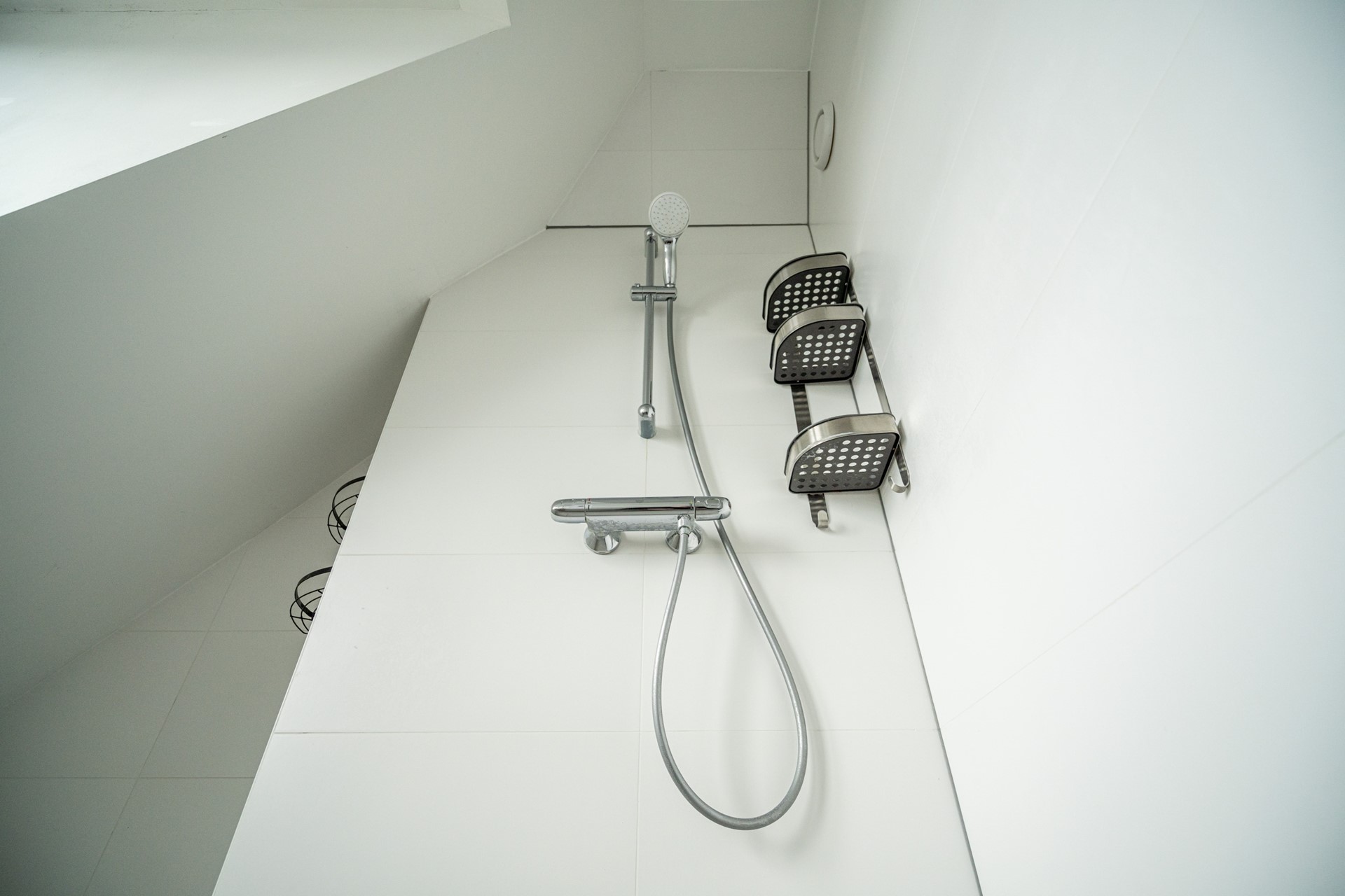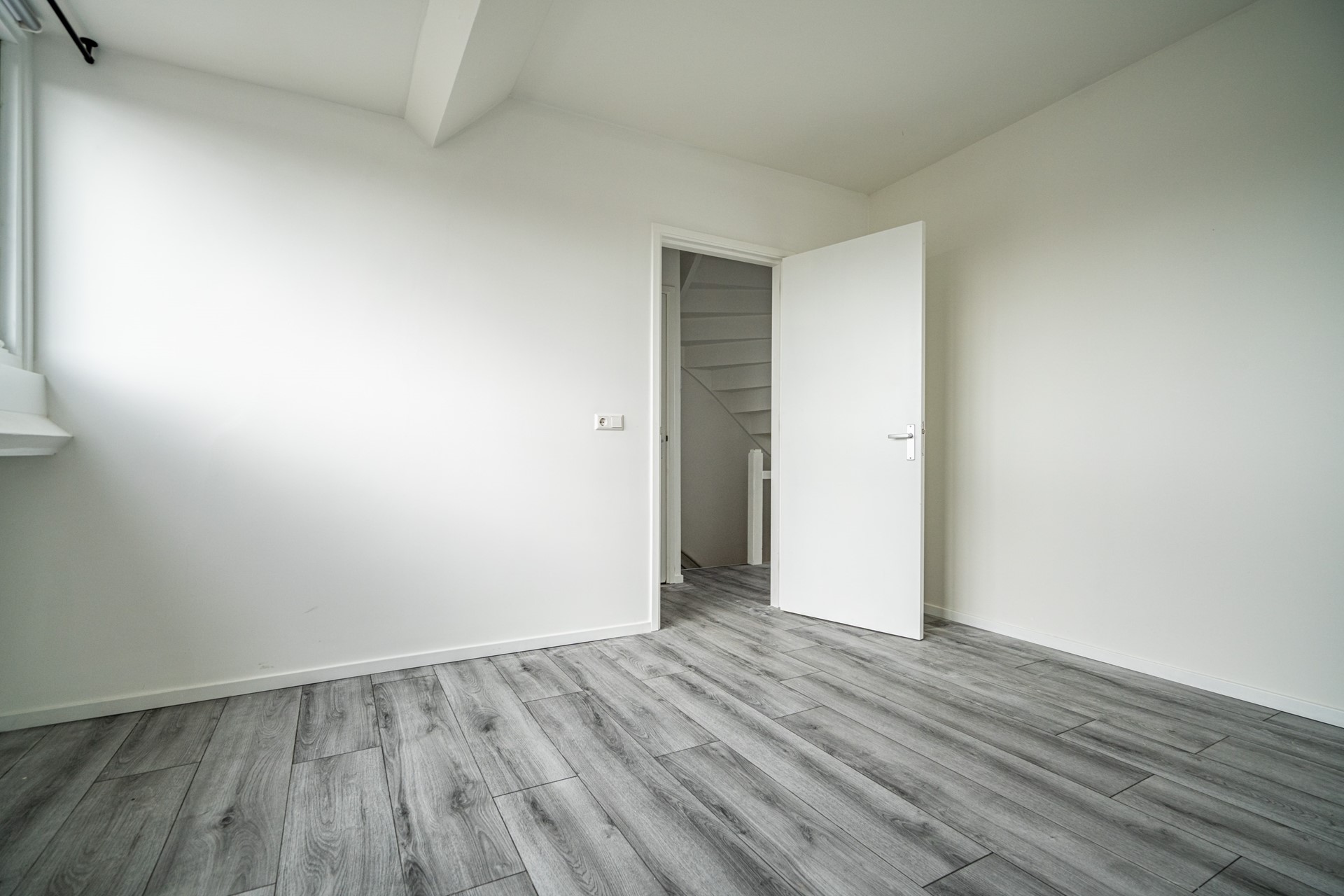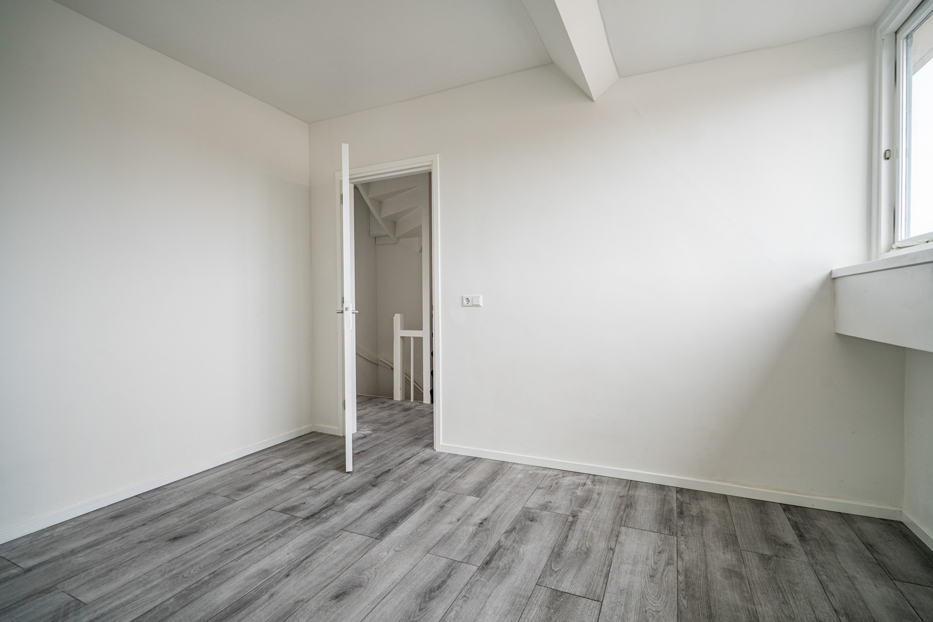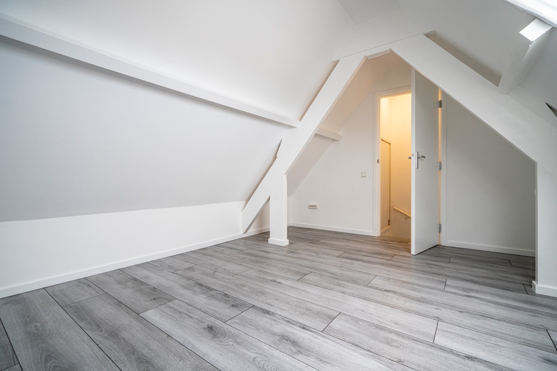 A fixed staircase leads to the top floor. Here, a second bedroom is located. This floor has a playful layout where the stairs lead directly into the room, creating a cozy and characterful space. Living in De Kooi