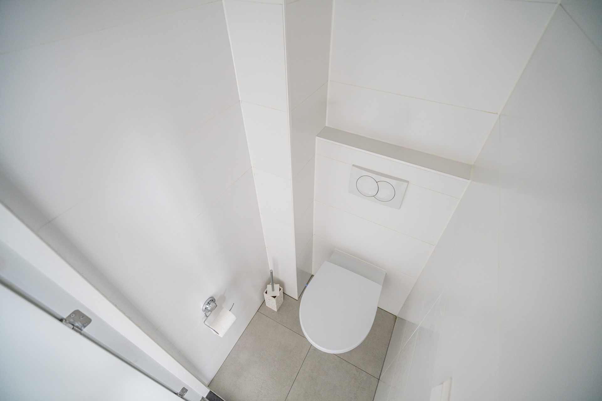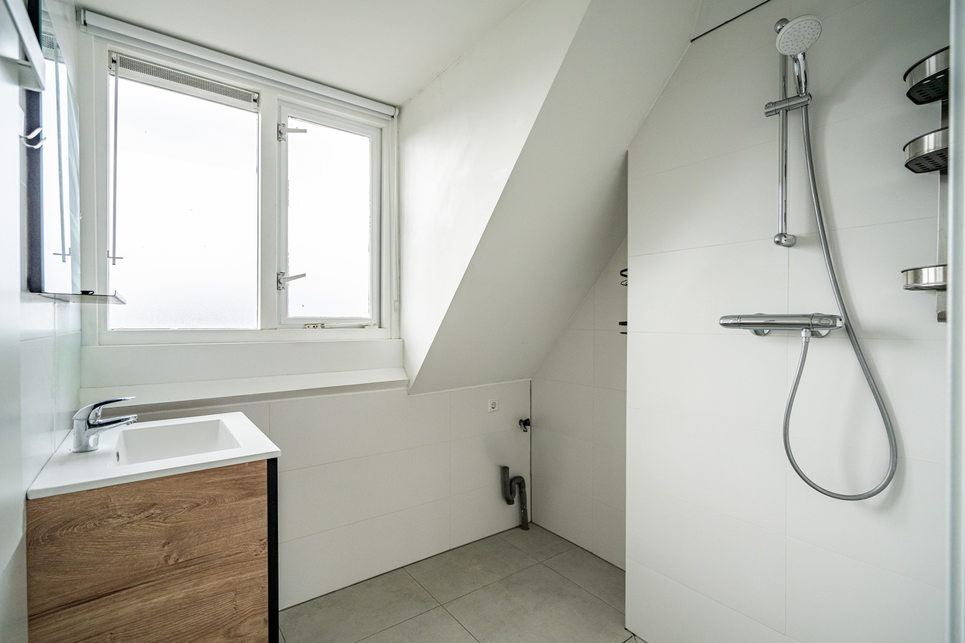 On the first floor, you will find the living room, a separate kitchen, a bedroom, the bathroom, and a separate toilet. The bathroom is neatly finished and equipped with a shower, sink, and space for a washing machine. The toilet is a wall-mounted unit.
