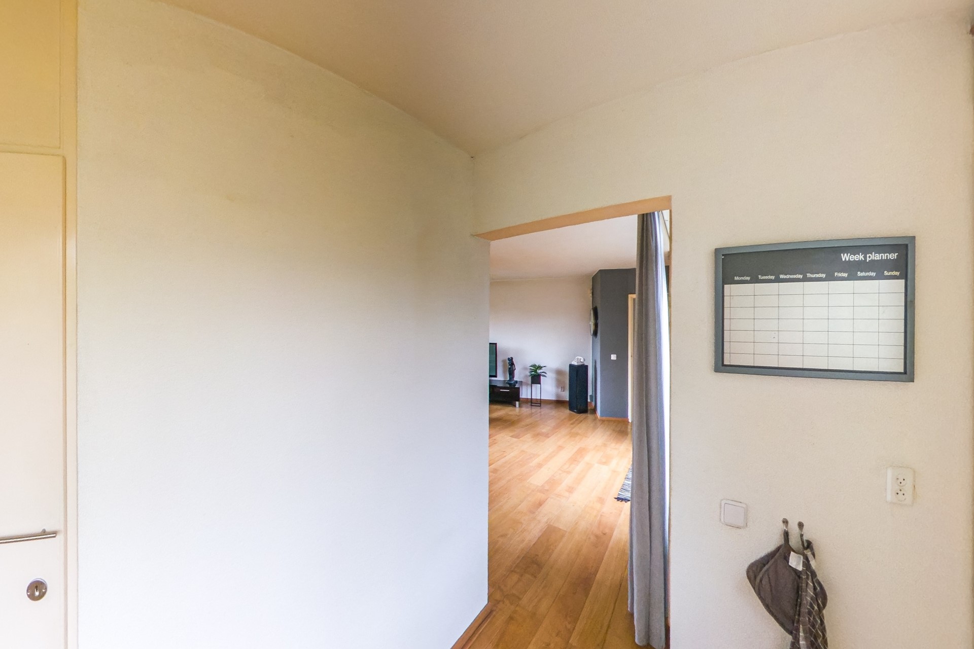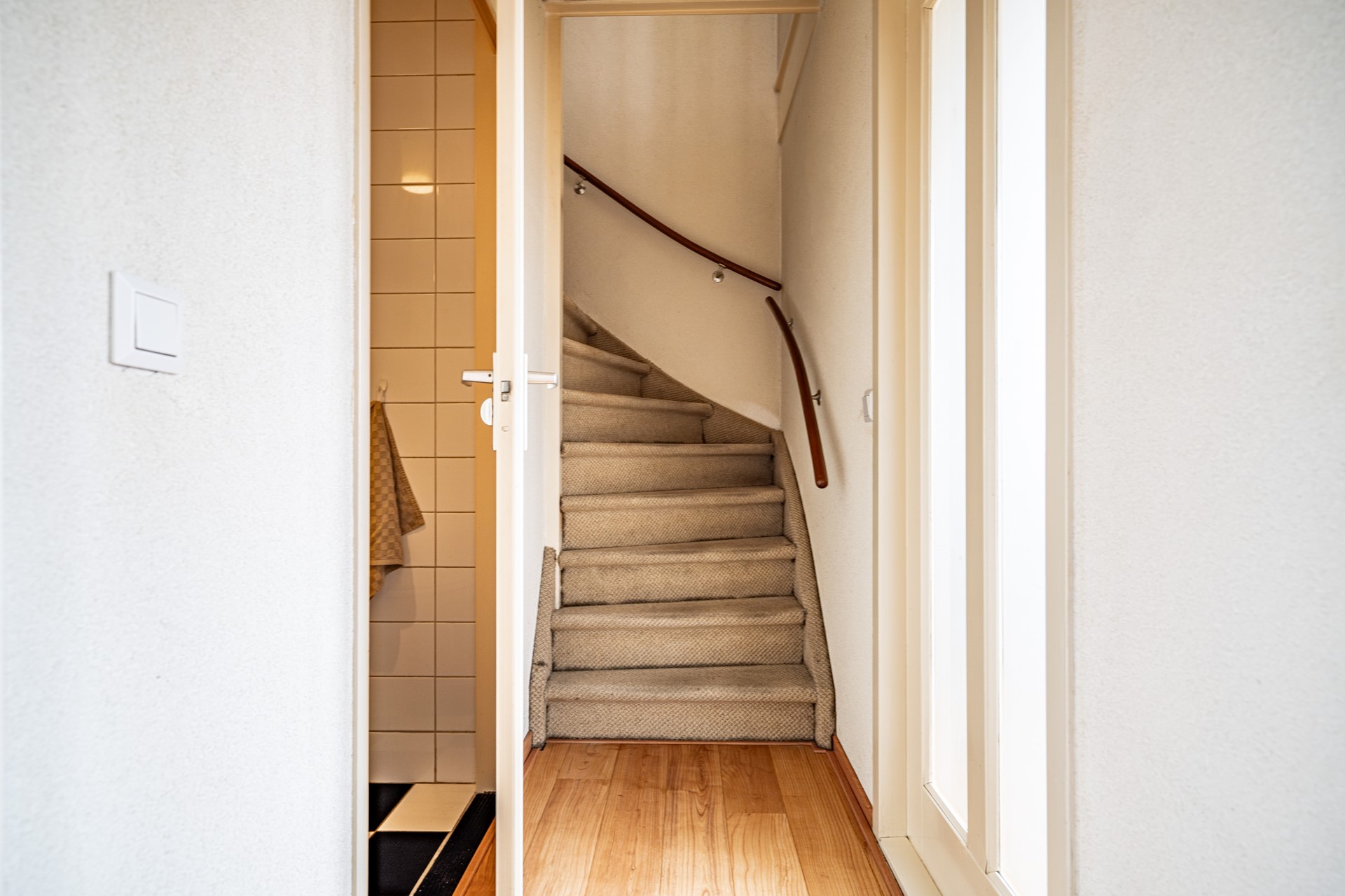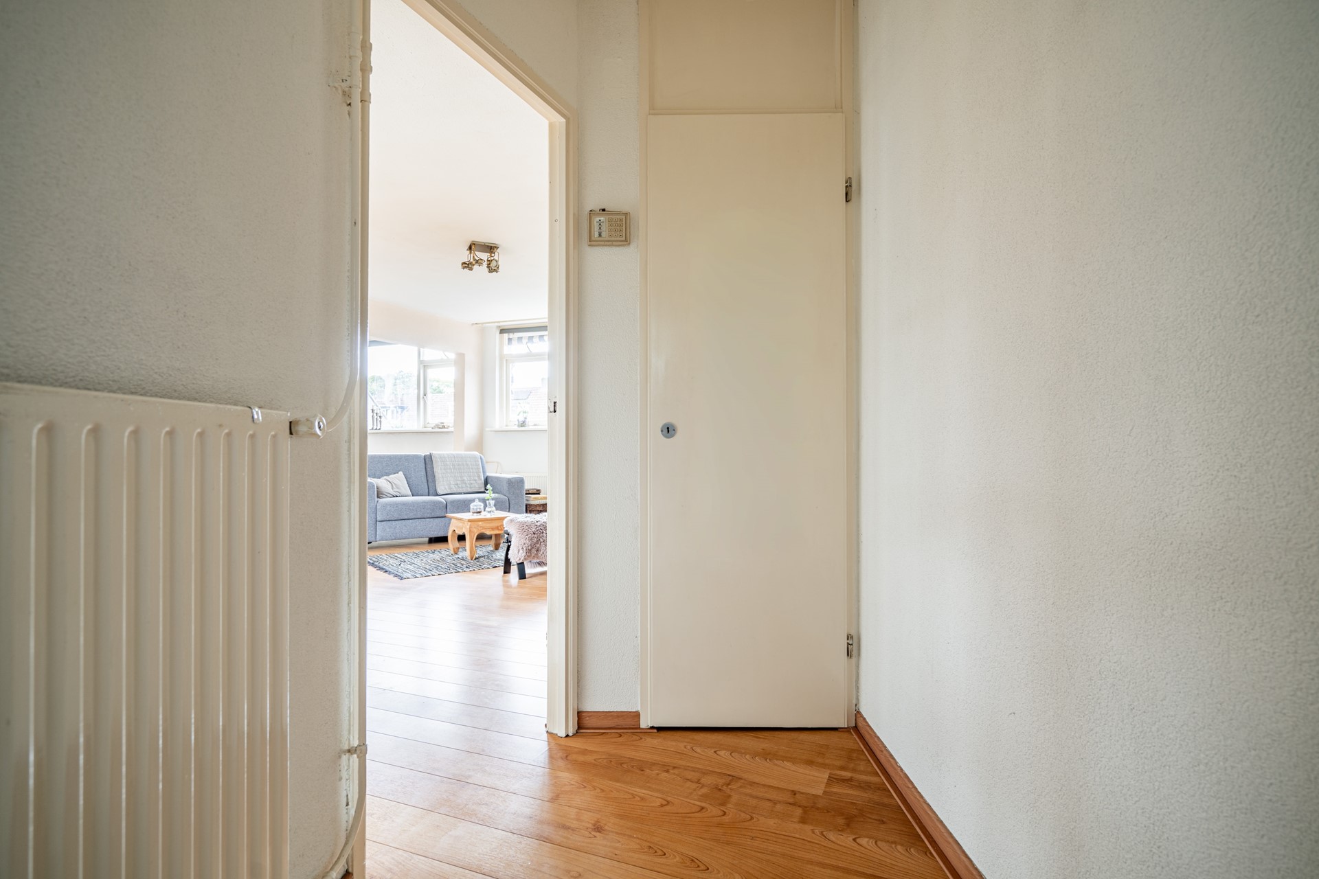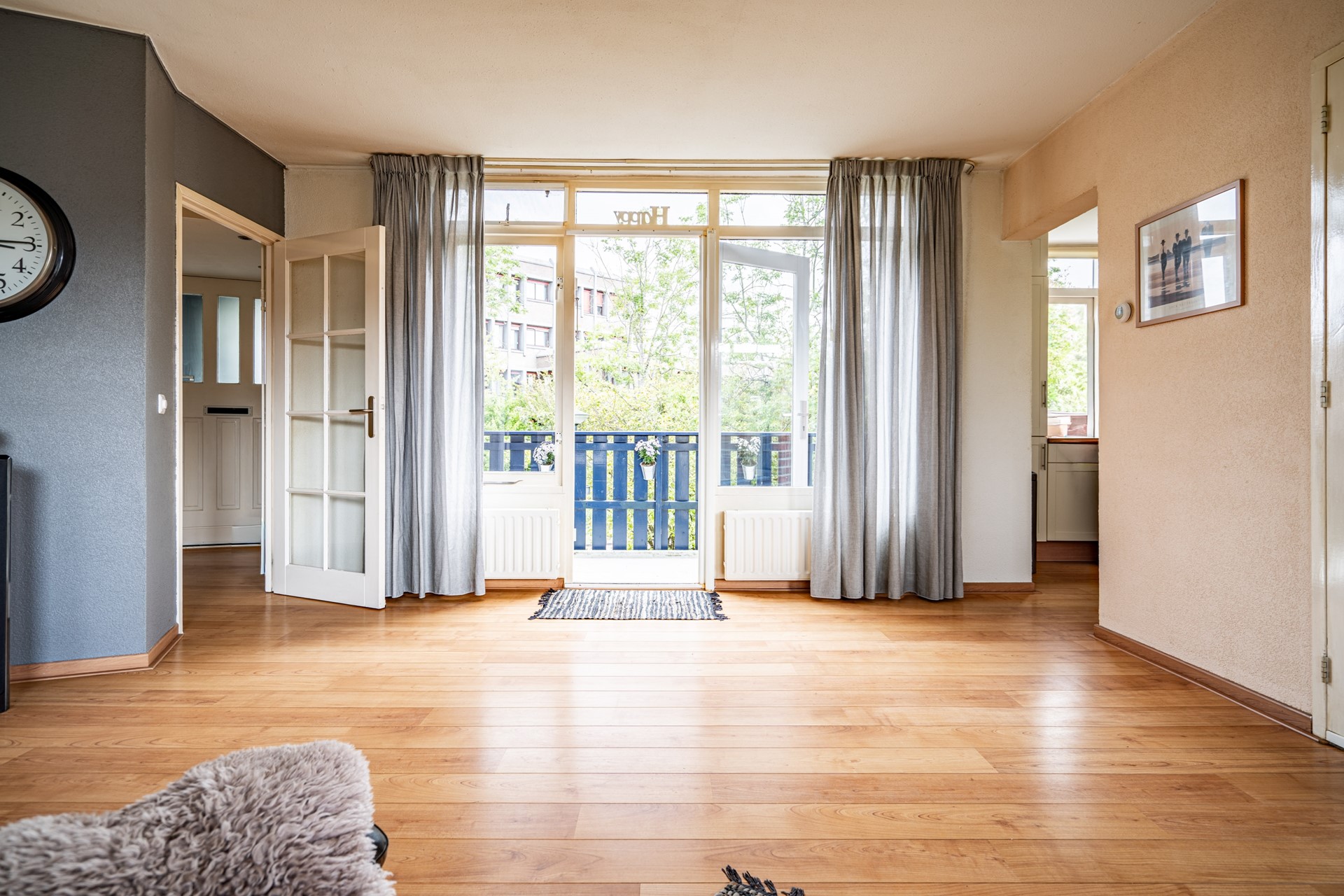 Upon entering the apartment through the hallway, you have access to the spacious and bright living room. Originally, there were two separate rooms, but these have been combined into one generous living space. At the front is a lovely balcony, perfect for enjoying the morning sun. The kitchen is located at the front of the house. In the second hallway, you will find the wall-hung toilet with a hand basin.