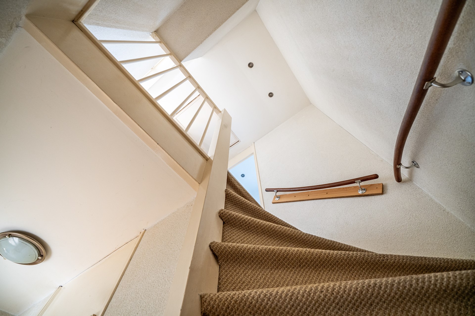 The landing leads to the two bedrooms and the bathroom. The bathroom is equipped with a shower, sink, washing machine connection, and a Velux skylight, which provides extra light and ventilation.