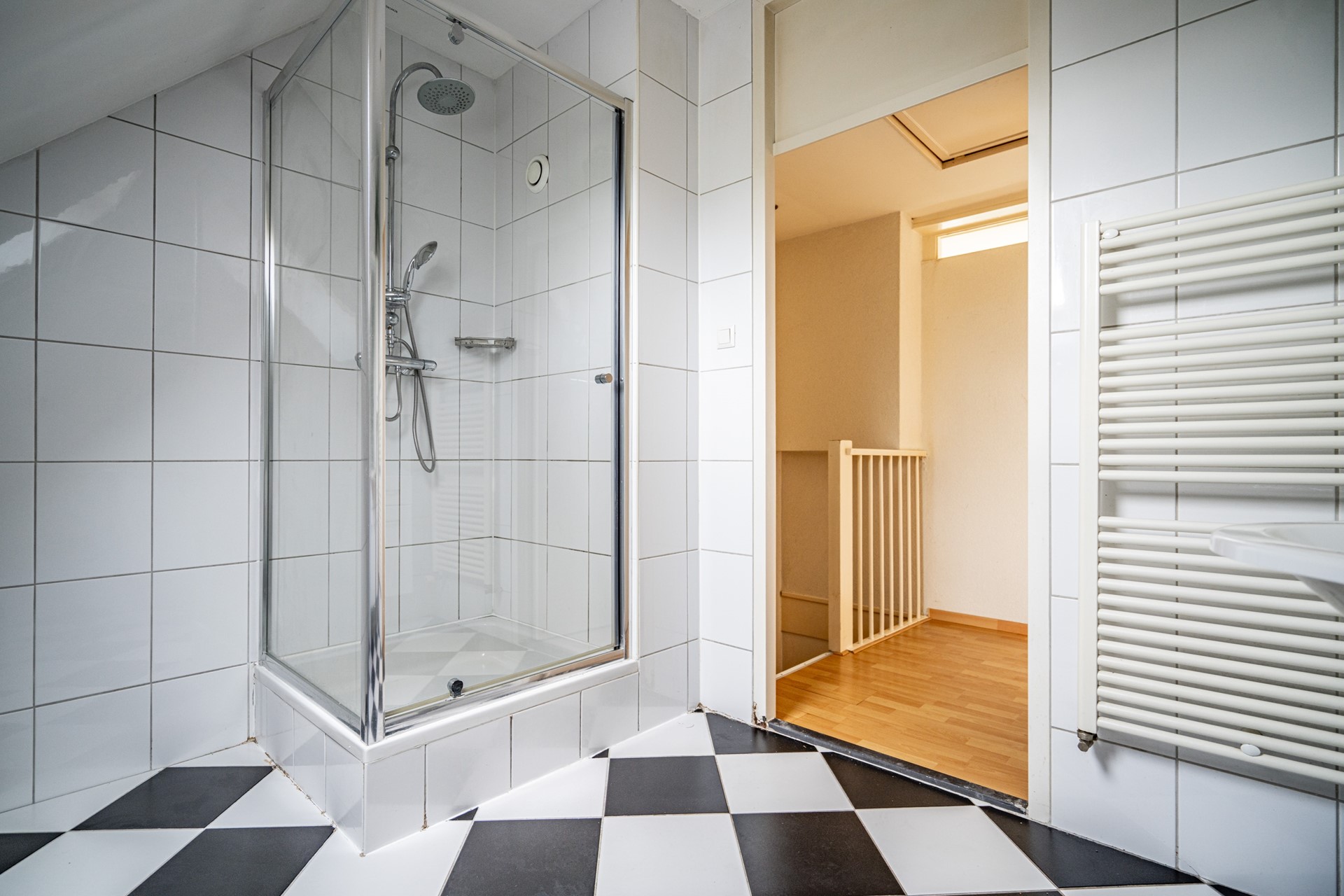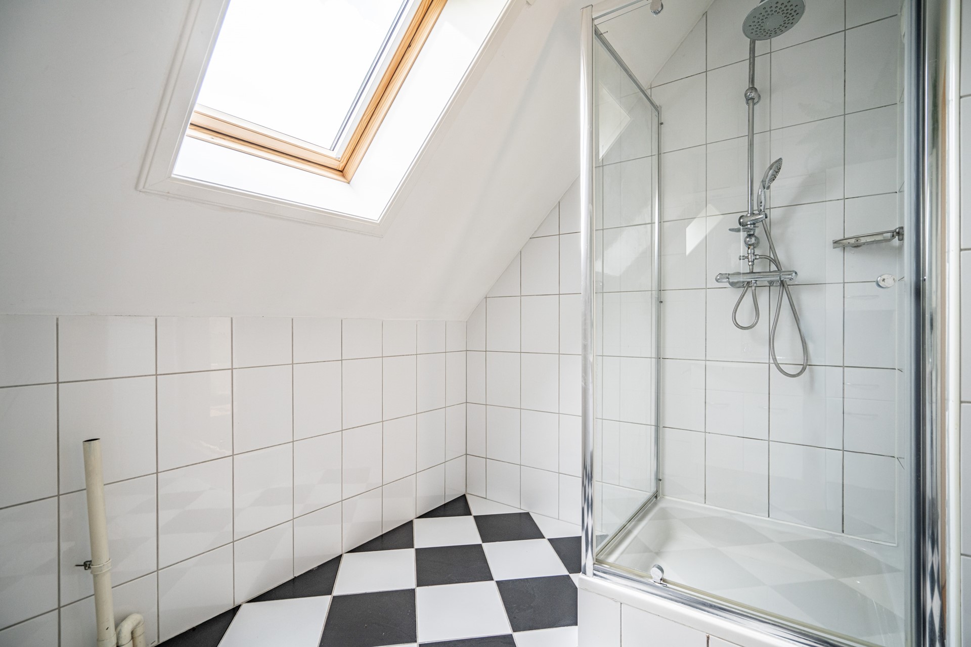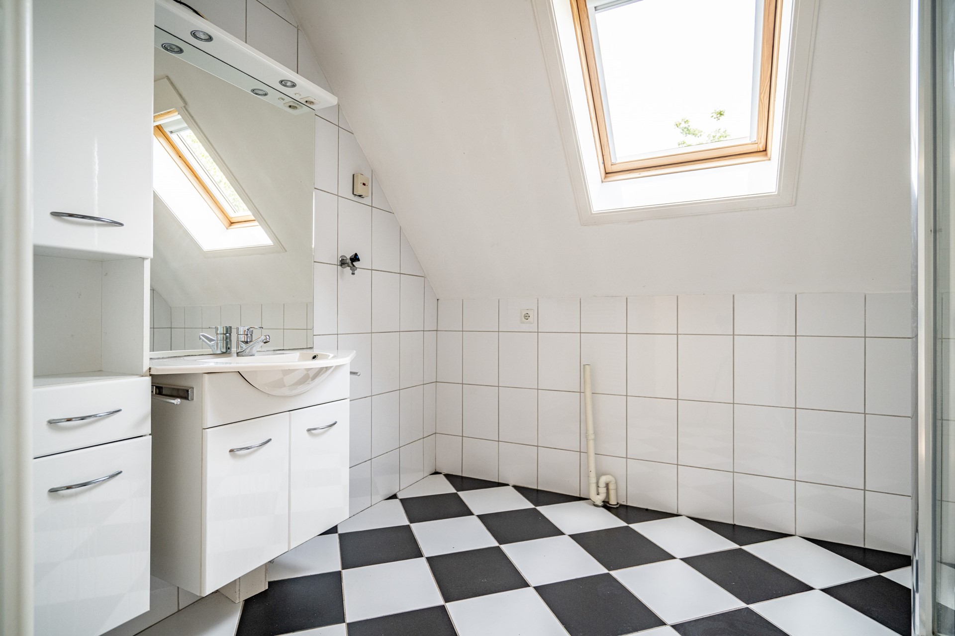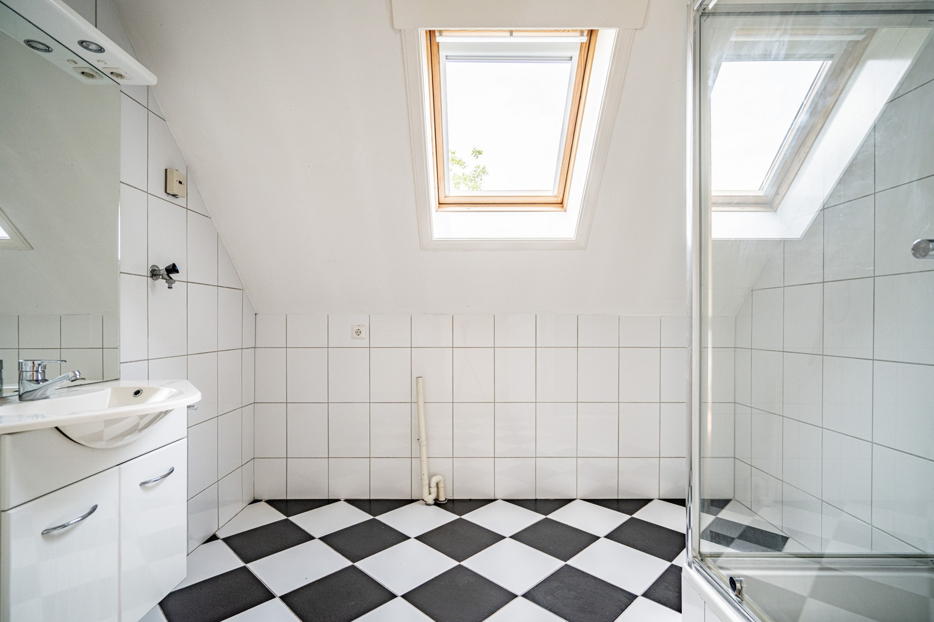 Via de overloop bereikt u de twee slaapkamers en de badkamer. De badkamer is uitgerust met een douchecabine, wastafel, wasmachineaansluiting en een Velux dakraam, dat zorgt voor extra licht en ventilatie.