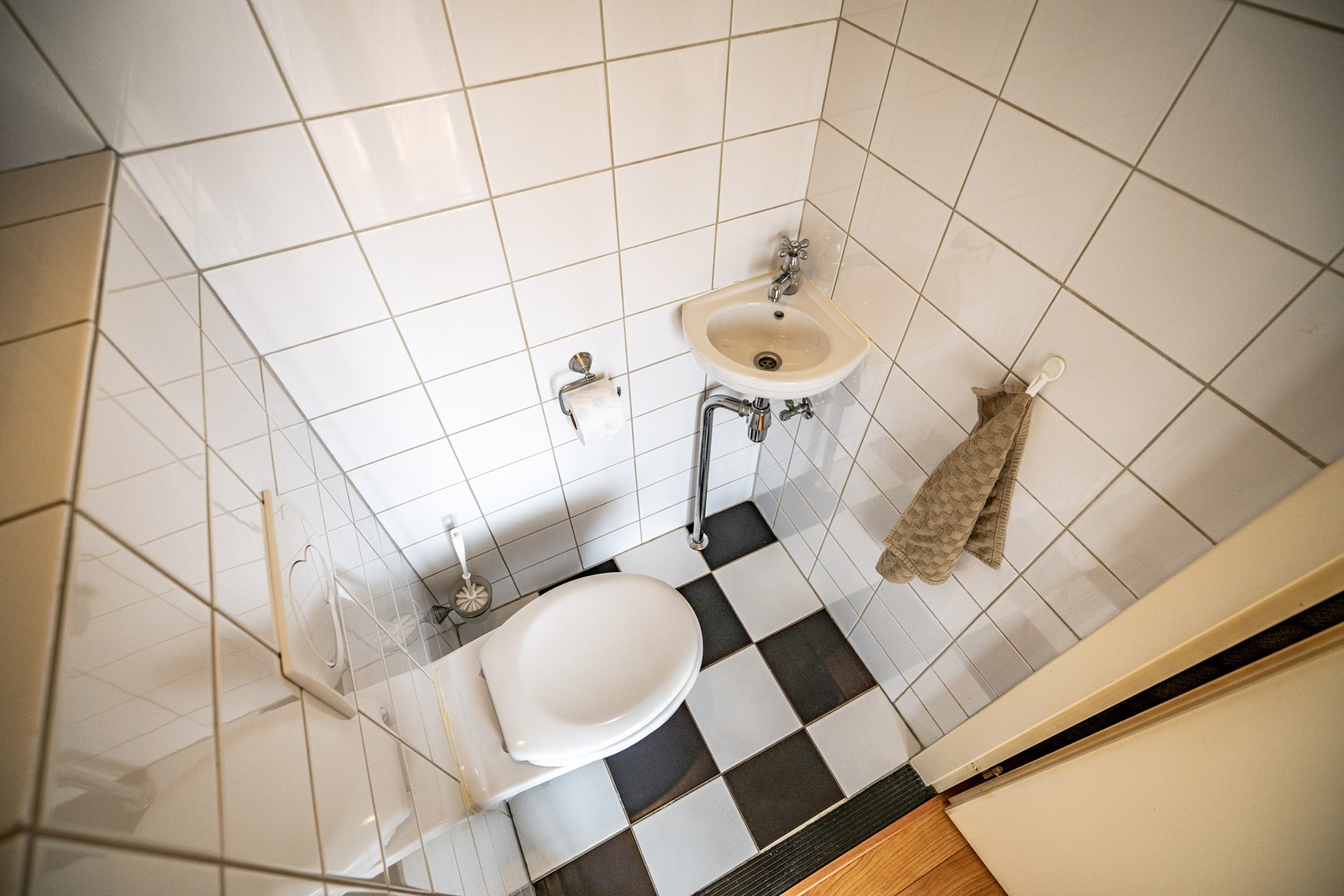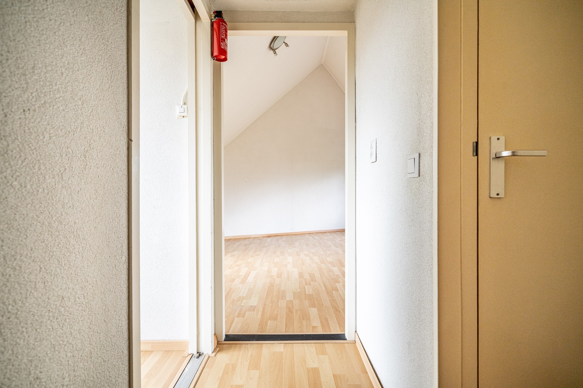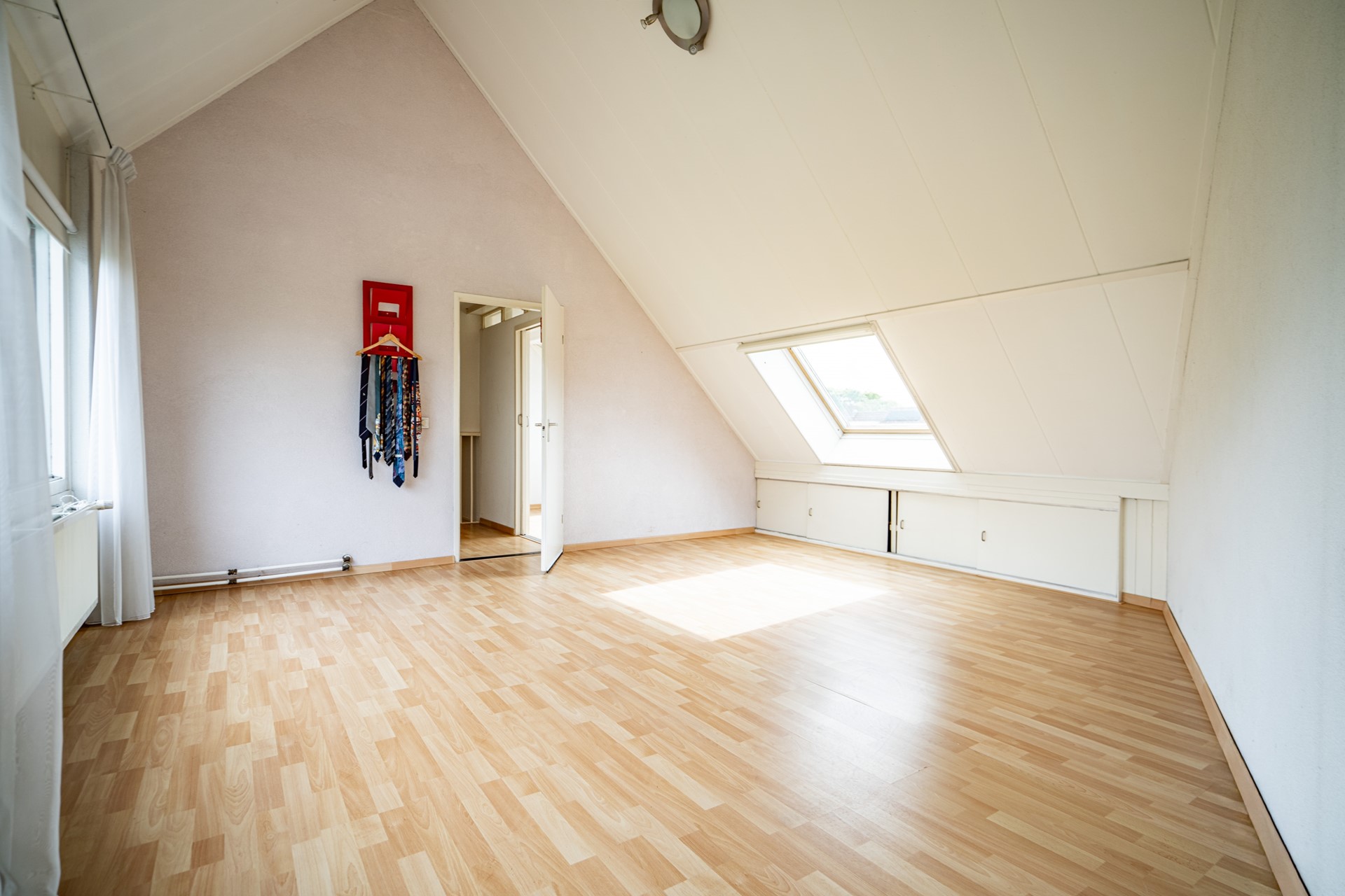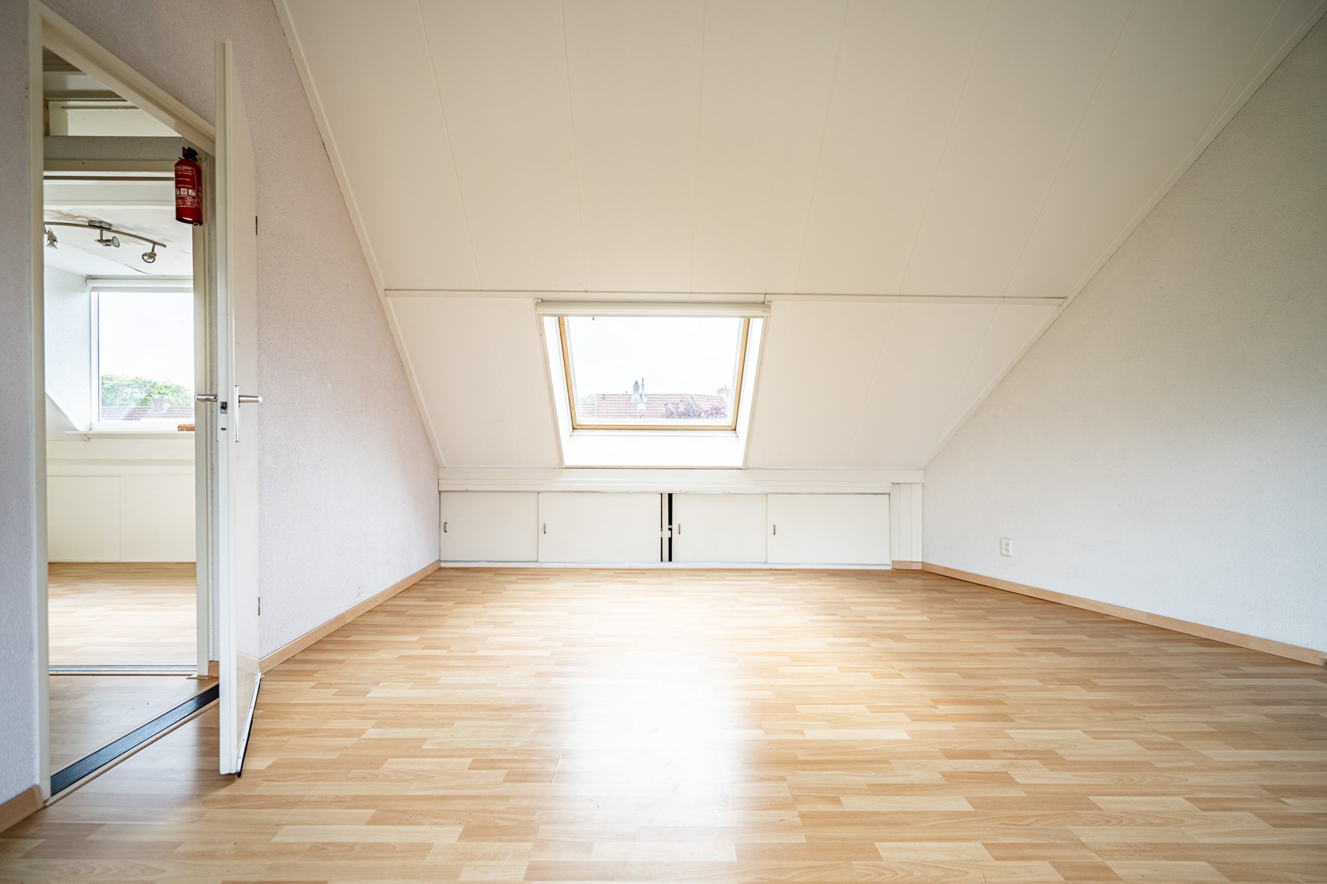 Via de overloop bereikt u de twee slaapkamers en de badkamer. De badkamer is uitgerust met een douchecabine, wastafel, wasmachineaansluiting en een Velux dakraam, dat zorgt voor extra licht en ventilatie.
