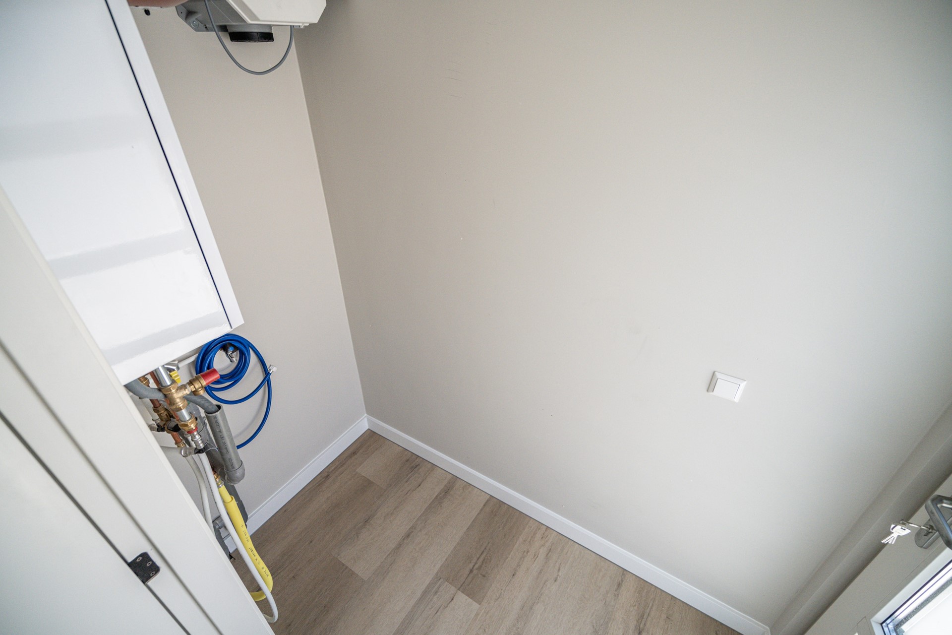 Upon entering, you will find the entrance hall with meter cupboard and staircase. From here, you have access to the spacious and bright living room with open kitchen, which forms a pleasant living space. At the rear, there is a practical storage room with space for the central heating system and washing machine connection.