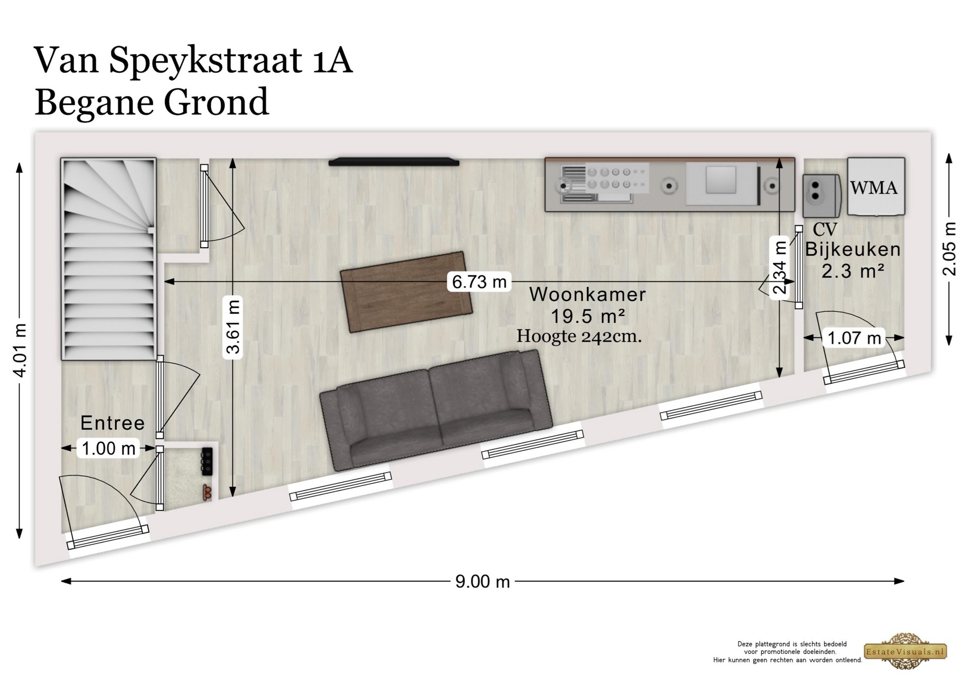 Bij binnenkomst tref je de entree met meterkast en trapopgang. Vanuit hier heb je toegang tot de ruime en lichte woonkamer met open keuken, die een prettige leefruimte vormt. Aan de achterzijde bevindt zich een praktische berging met opstelling voor de cv-installatie en wasmachineaansluiting.