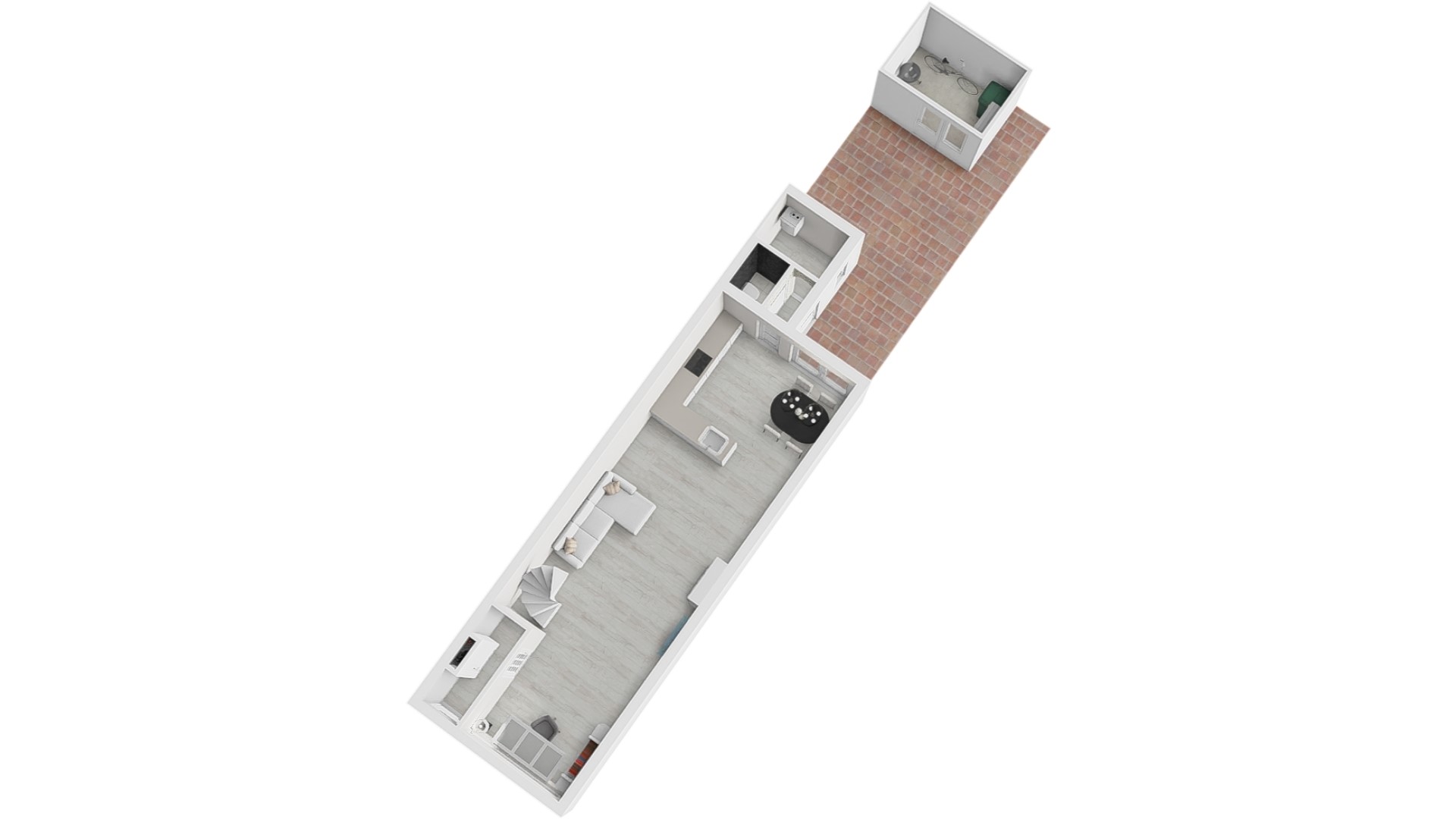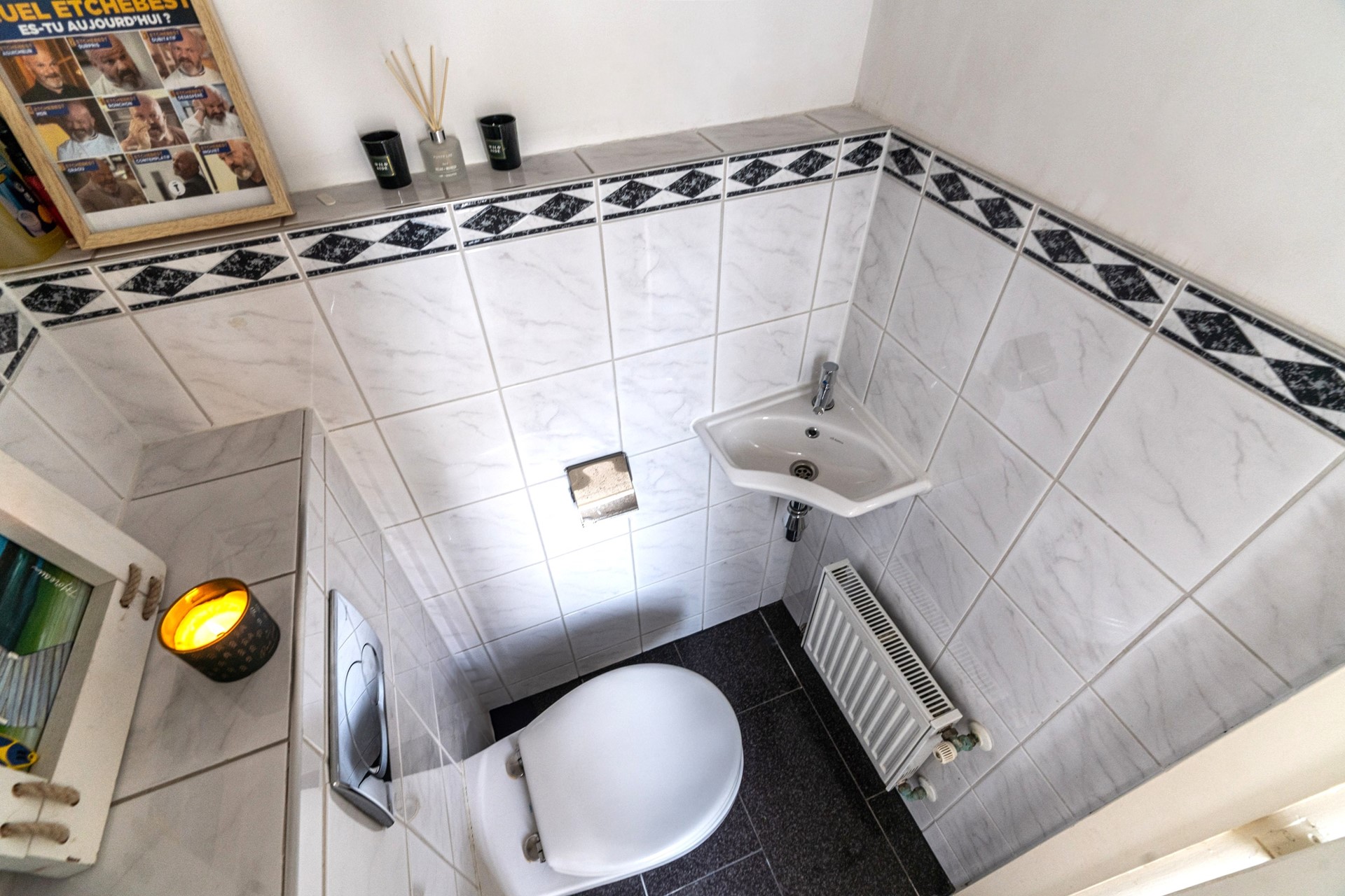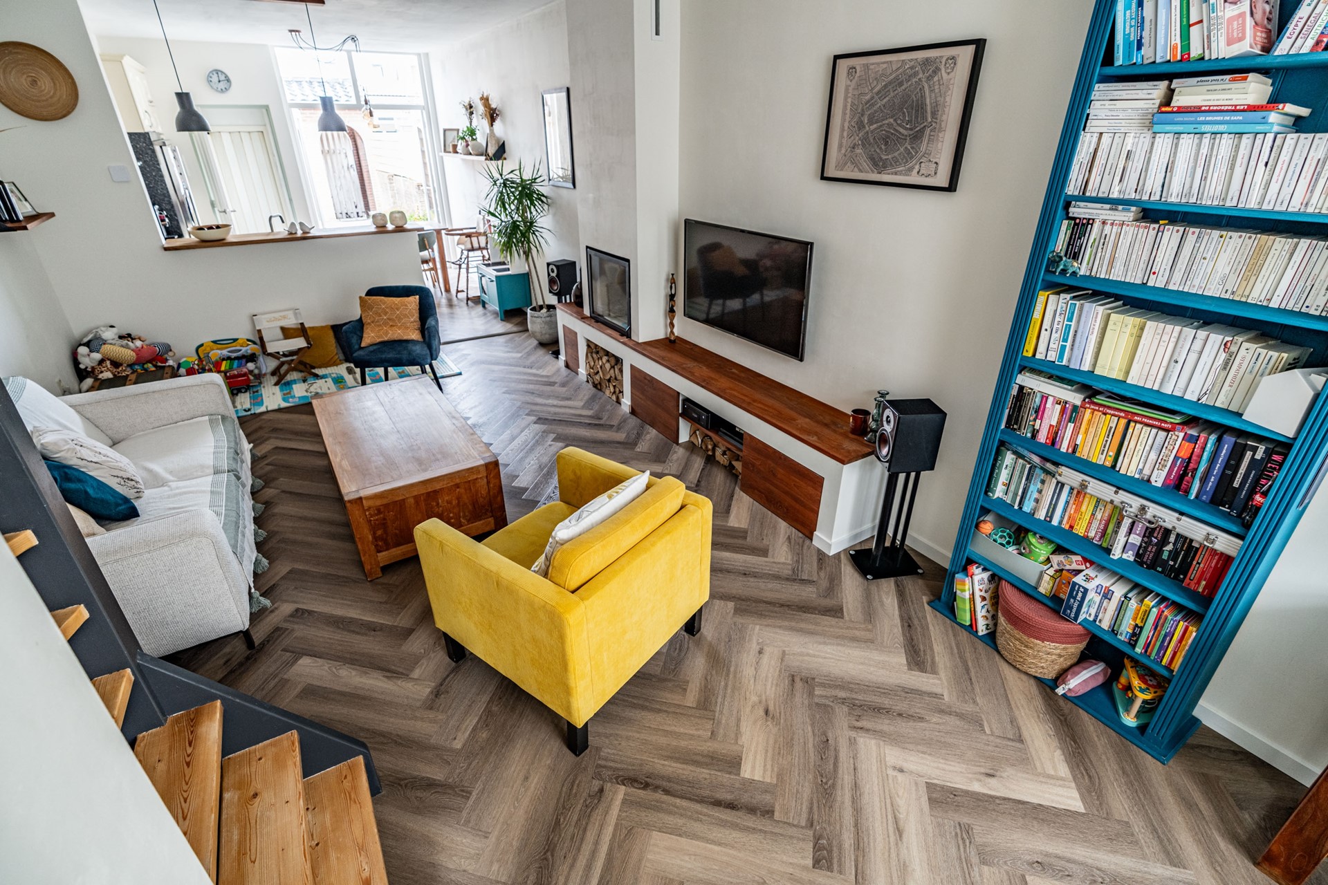 Entrance hall with meter cupboard and access to the spacious and extended living room with plenty of natural light, new PVC flooring, and a modern open-plan kitchen. The kitchen is fully equipped with various built-in appliances and underfloor heating. At the rear is the dining area overlooking the garden. This floor also features a modern wall-hung toilet with a small sink and a practical storage/utility room with the central heating system (Intergas, 2015, owned). The west-facing garden is low-maintenance and has a brick shed and rear access.