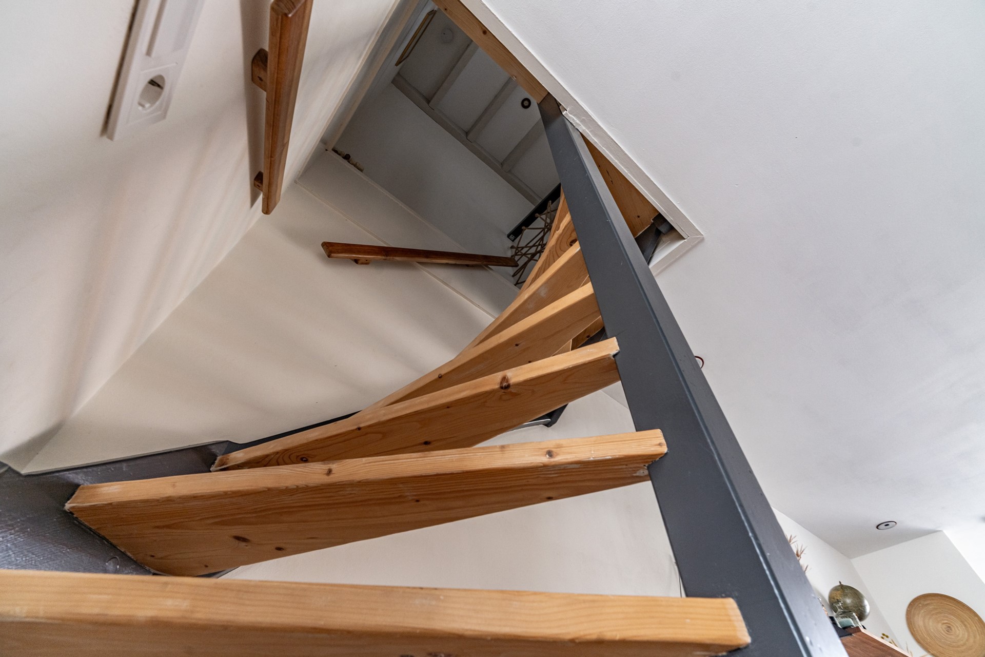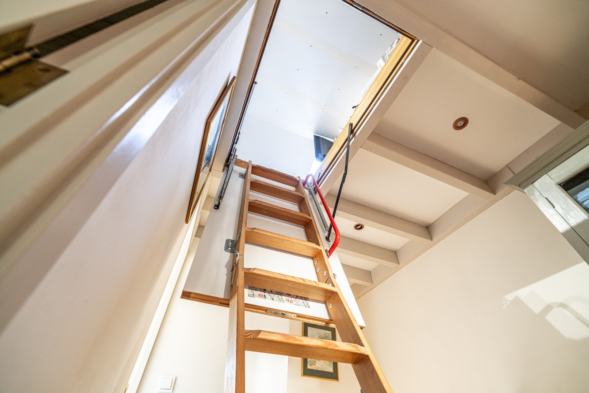 Via een vlizotrap bereik je de ruime en geïsoleerde zolder met dakraam. Deze ruimte is ideaal als extra bergruimte.