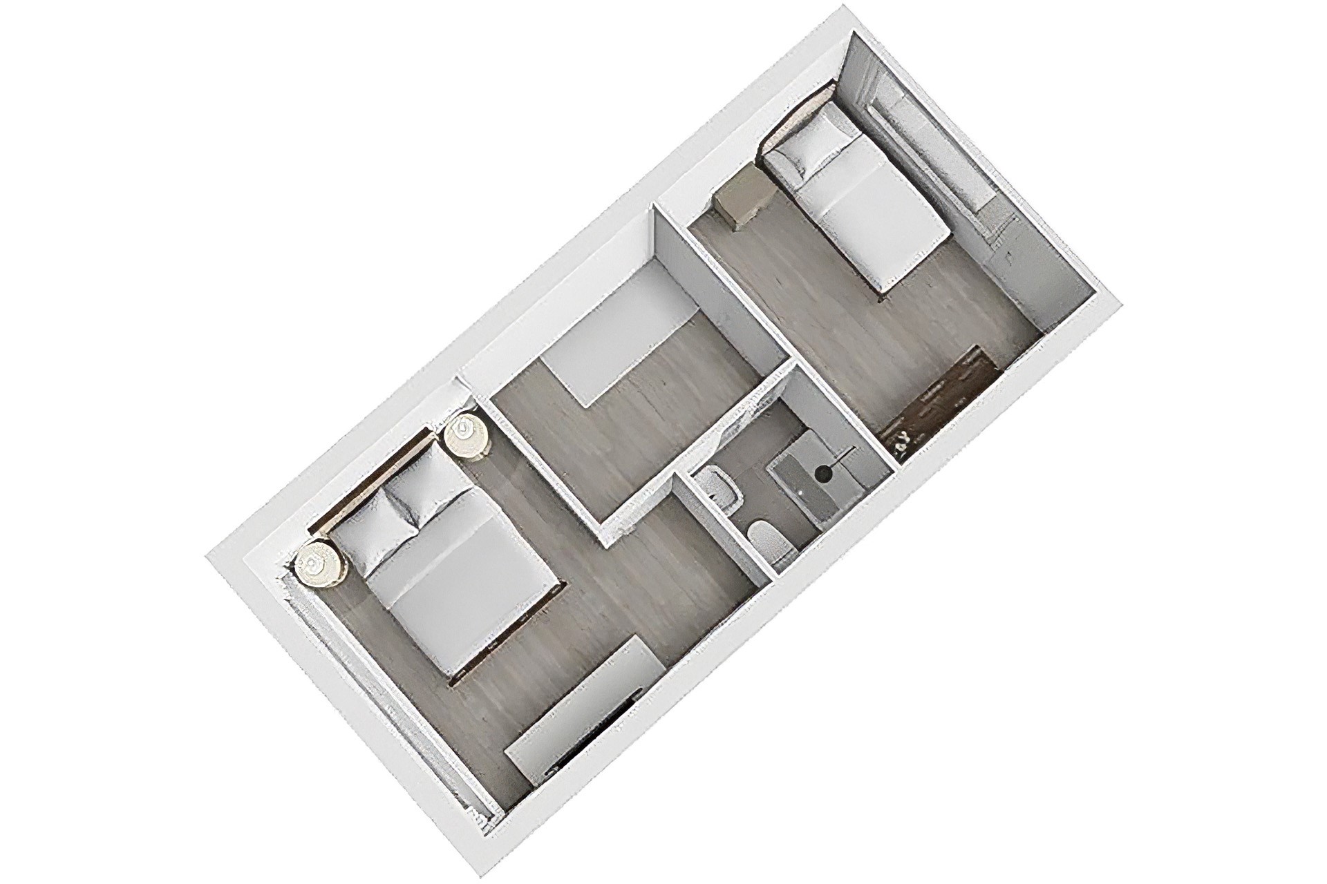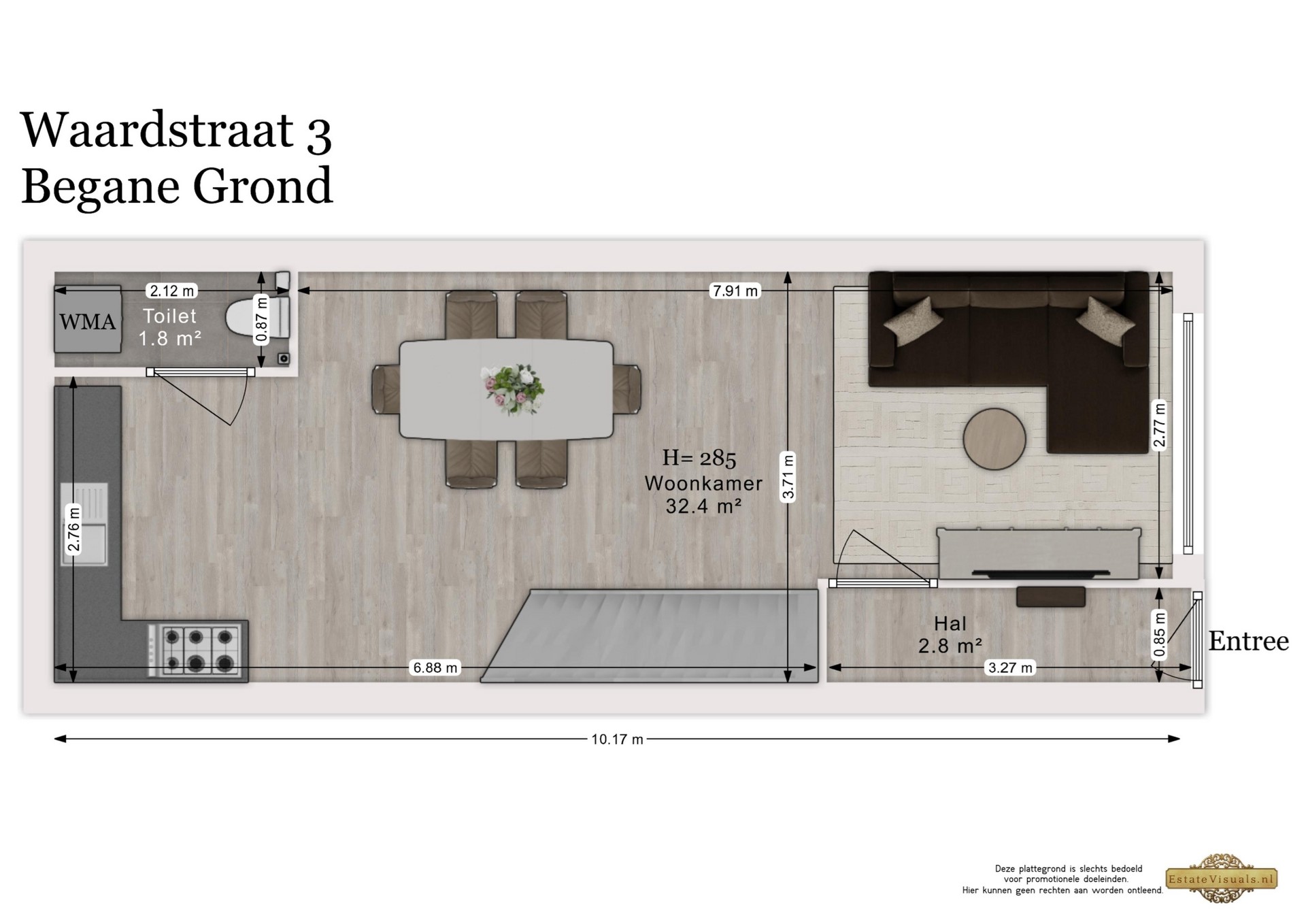 Upon entering, you will find the entrance hall with the meter cupboard. The home features a bright and spacious living room with an open kitchen, which is situated at the rear. This layout creates a pleasant living space with a nice connection between cooking and living. Adjacent to the kitchen are the toilet and the space for the washing machine.