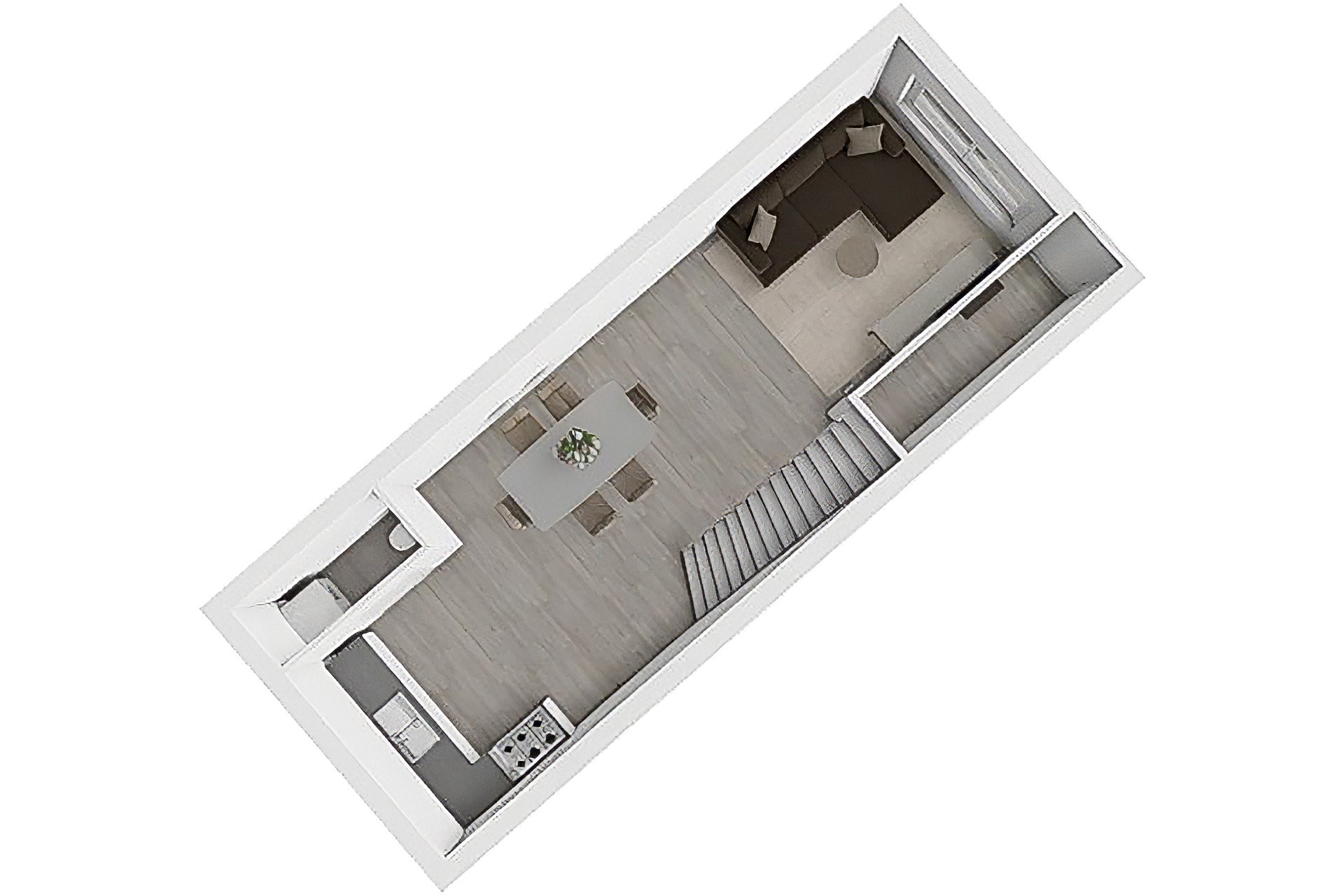 Upon entering, you will find the entrance hall with the meter cupboard. The home features a bright and spacious living room with an open kitchen, which is situated at the rear. This layout creates a pleasant living space with a nice connection between cooking and living. Adjacent to the kitchen are the toilet and the space for the washing machine.