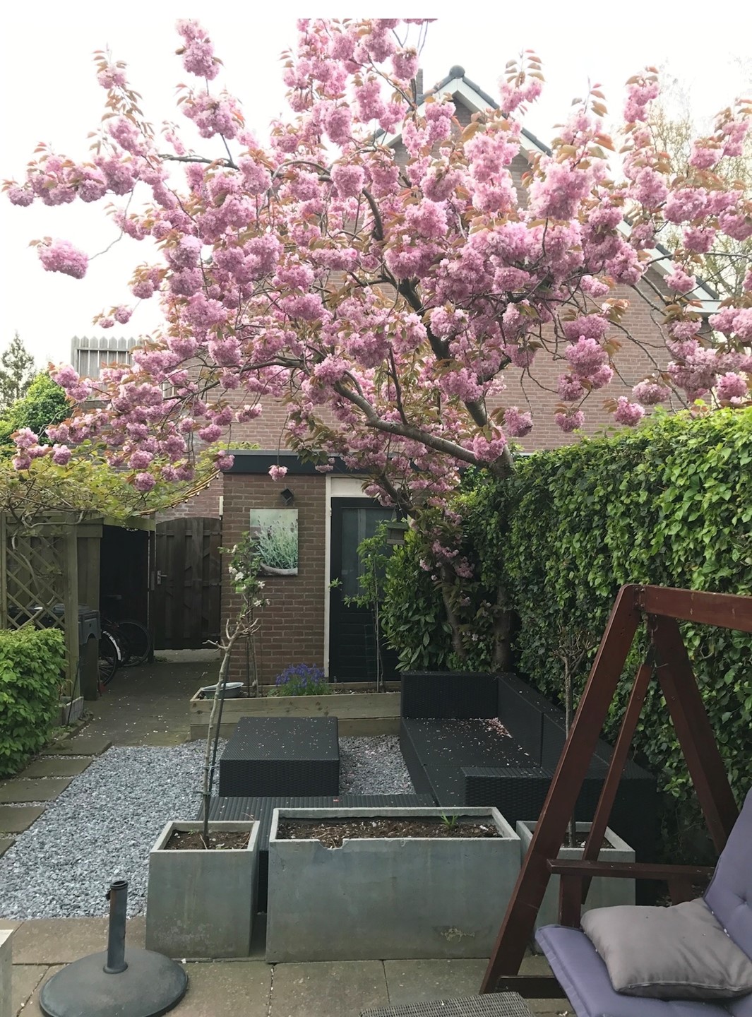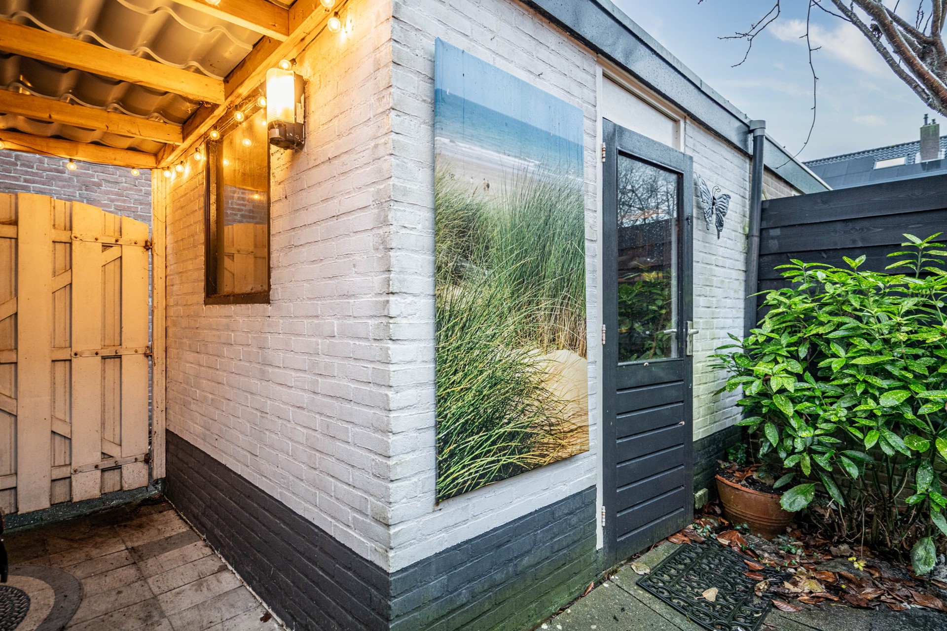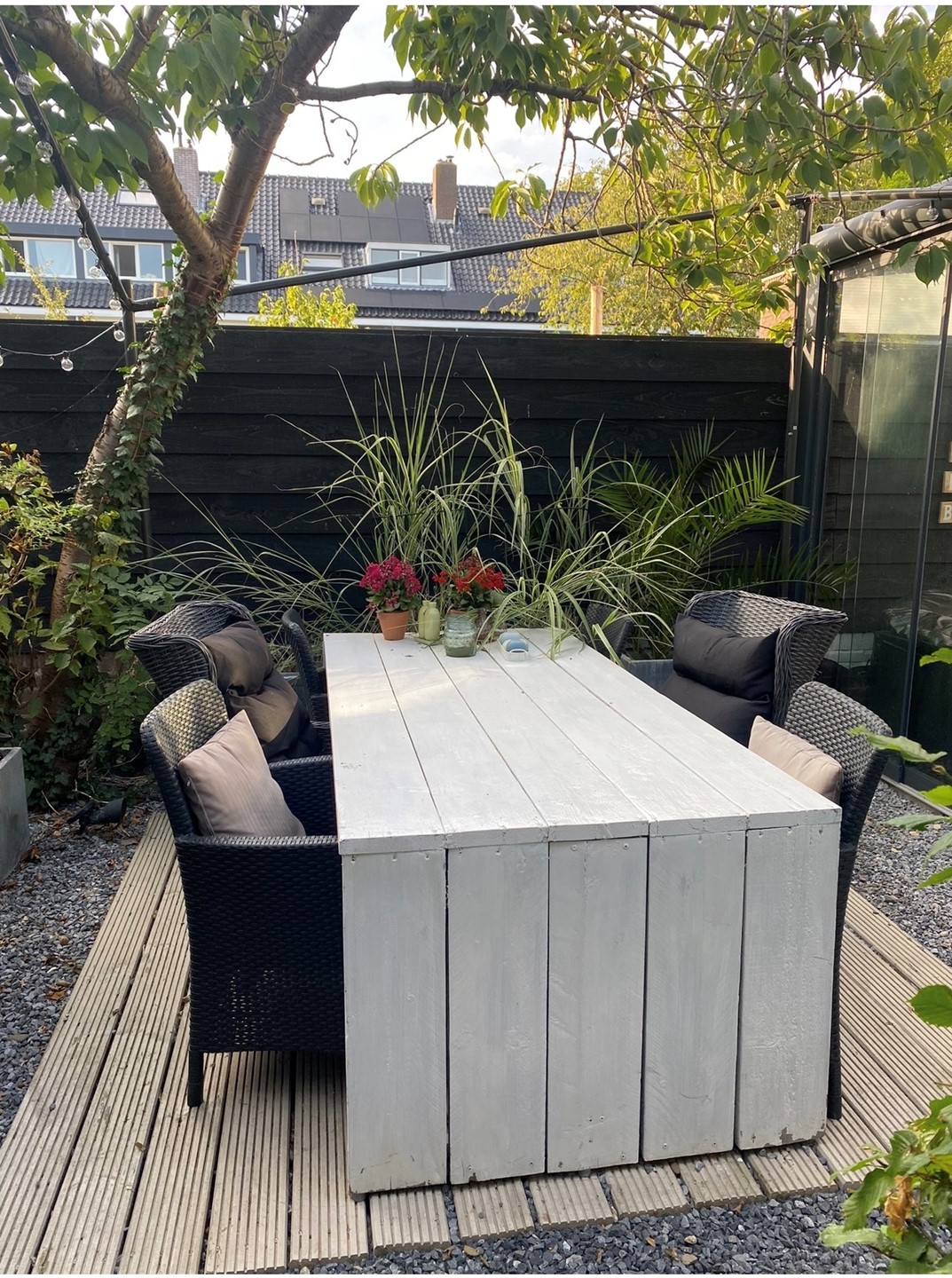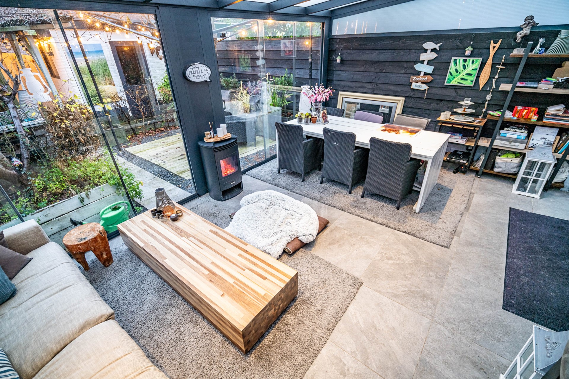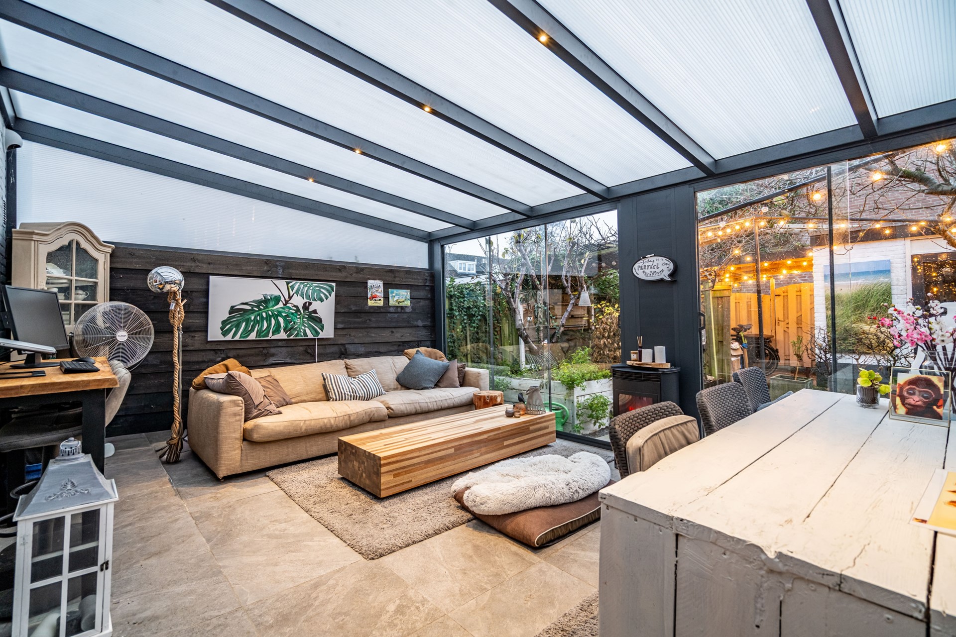 Vanuit het eetgedeelte stap je via de openslaande deuren zo de serre in – een heerlijke, ruime (zo’n 24 m2) verwarmde, multifunctionele ruimte met uitzicht op de knusse tuin. Er blijft genoeg tuin over: deze is 9 meter diep en voorzien van stenen schuur en aparte fietsenberging.