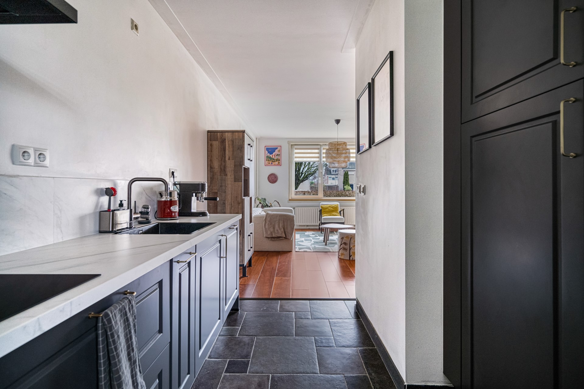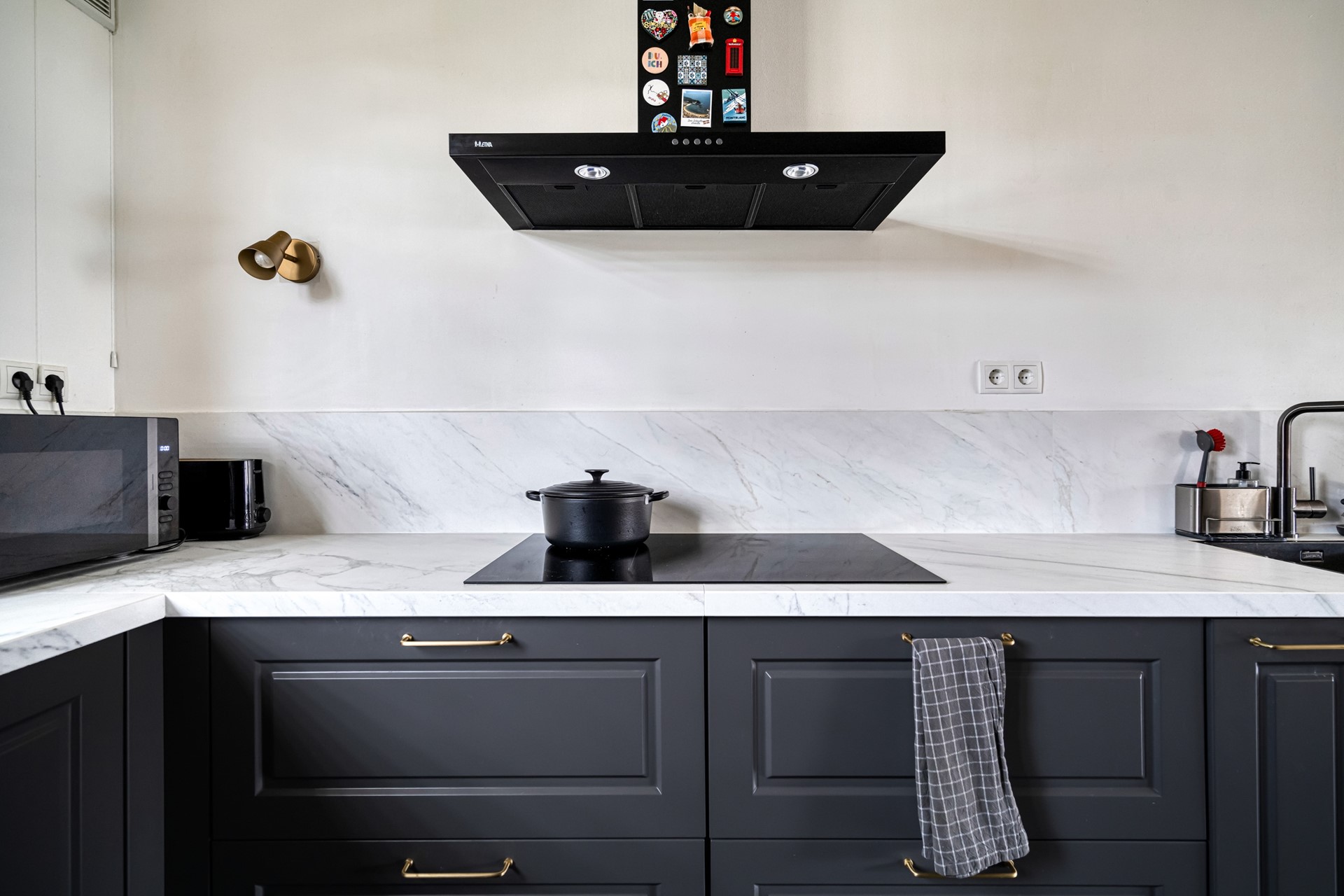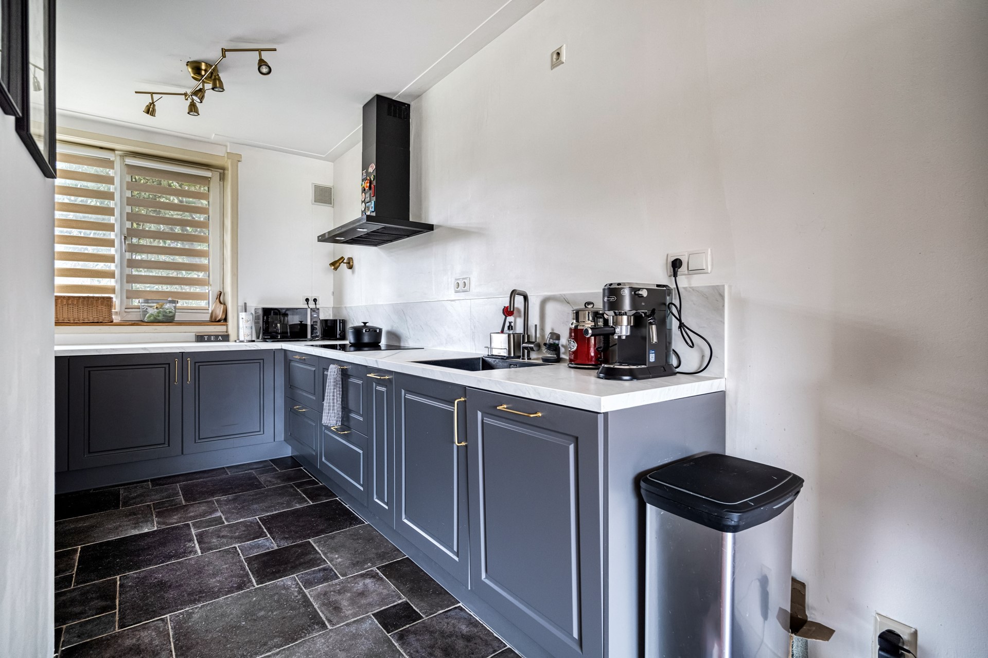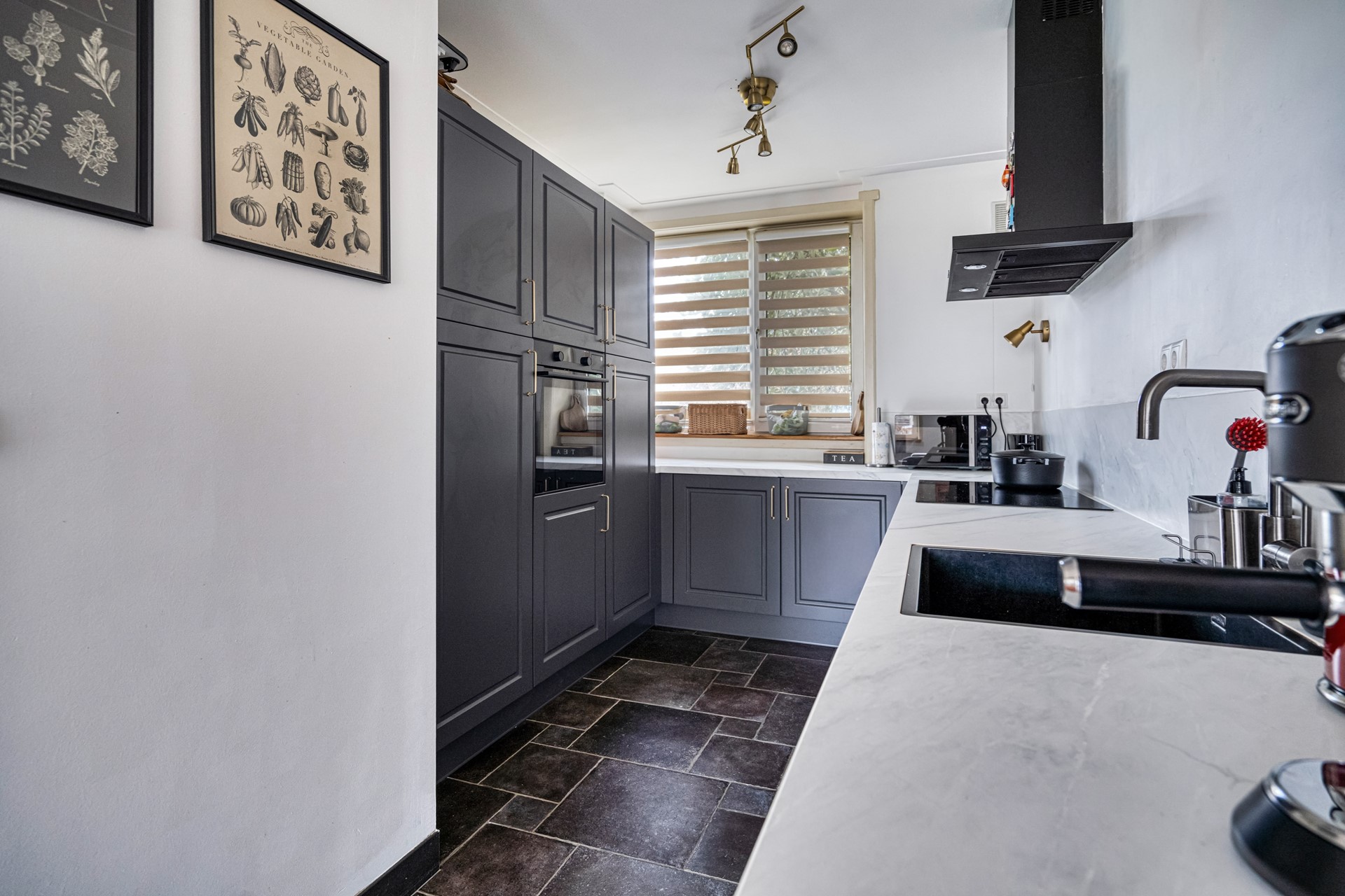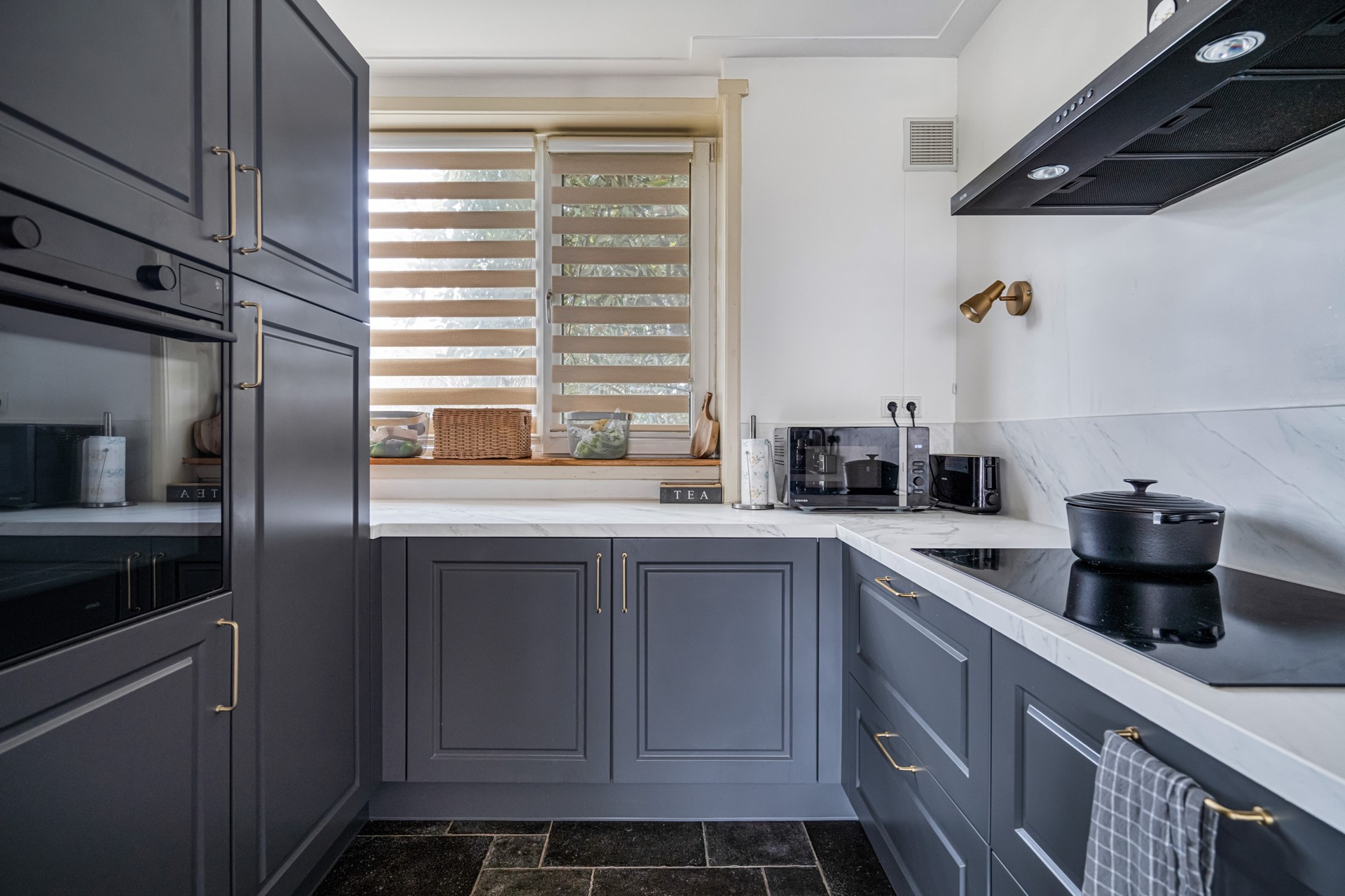 De keuken is luxe uitgevoerd en voorzien van een inductiekookplaat, afzuigkap, vaatwasser, combi oven/magnetron, koelkast en vriezer. Een praktische en eigentijdse keuken waar alles binnen handbereik is.