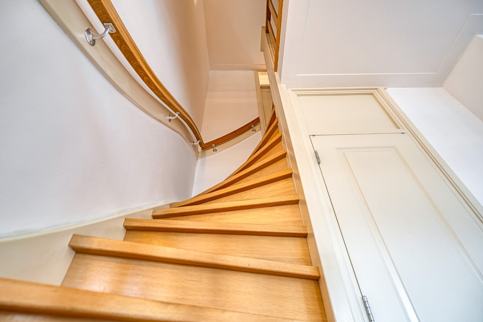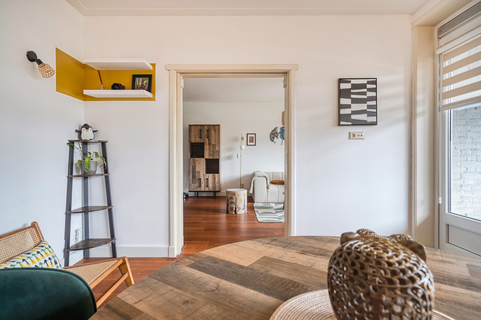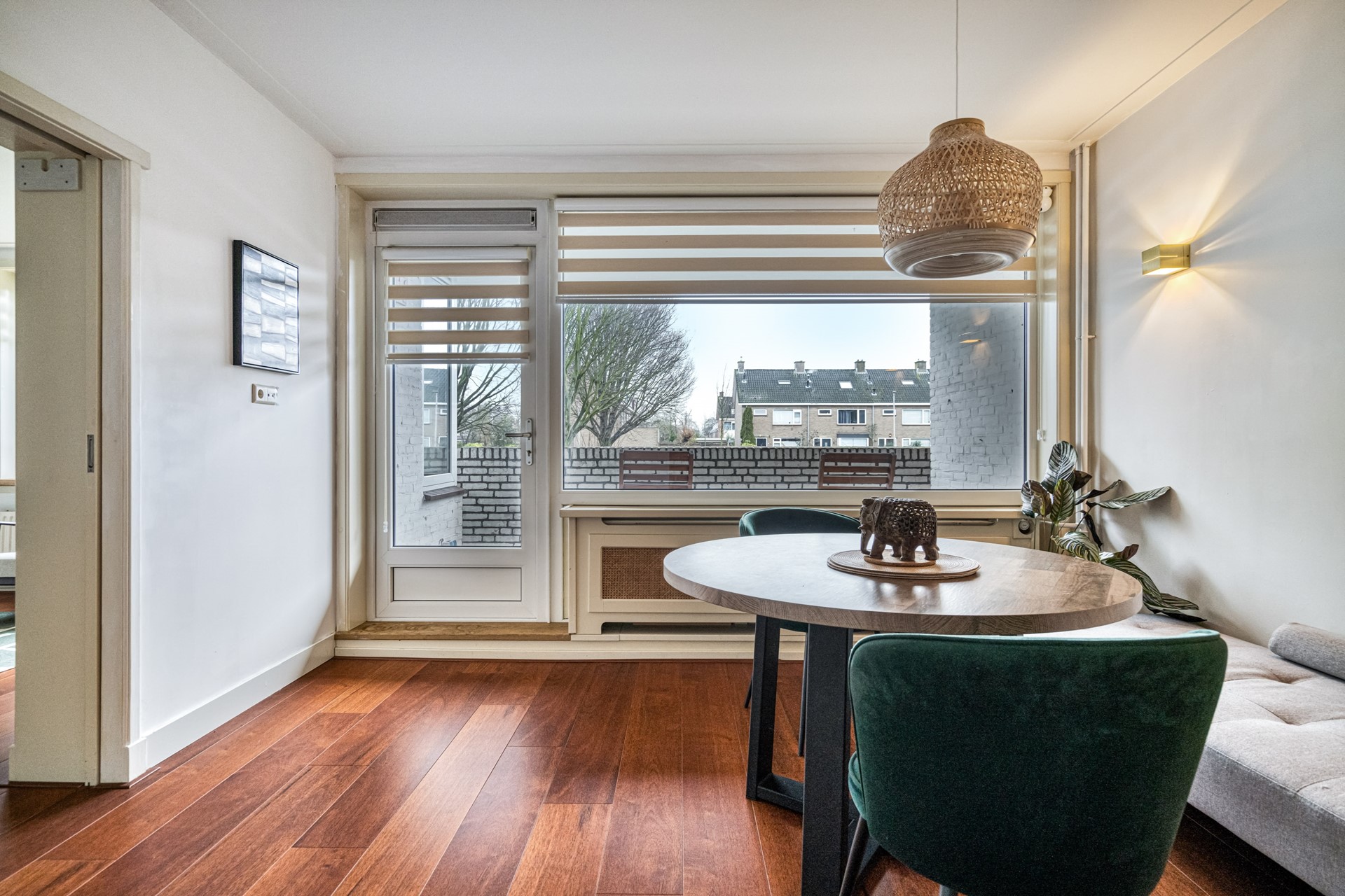 Aansluitend aan de woonkamer bevindt zich de eetkamer, die nu is afgescheiden maar eenvoudig bij de woonkamer kan worden betrokken voor extra leefruimte. Vanuit de eetkamer is er toegang tot het balkon, gelegen op het zuidoosten, een fijne plek om in de ochtend en vroege middag van de zon te genieten. In de eetkamer is daarnaast een grote opbergkast aanwezig. Op deze woonlaag bevindt zich tevens een separaat toilet.