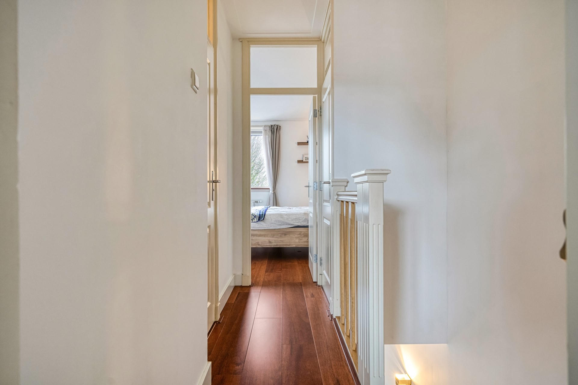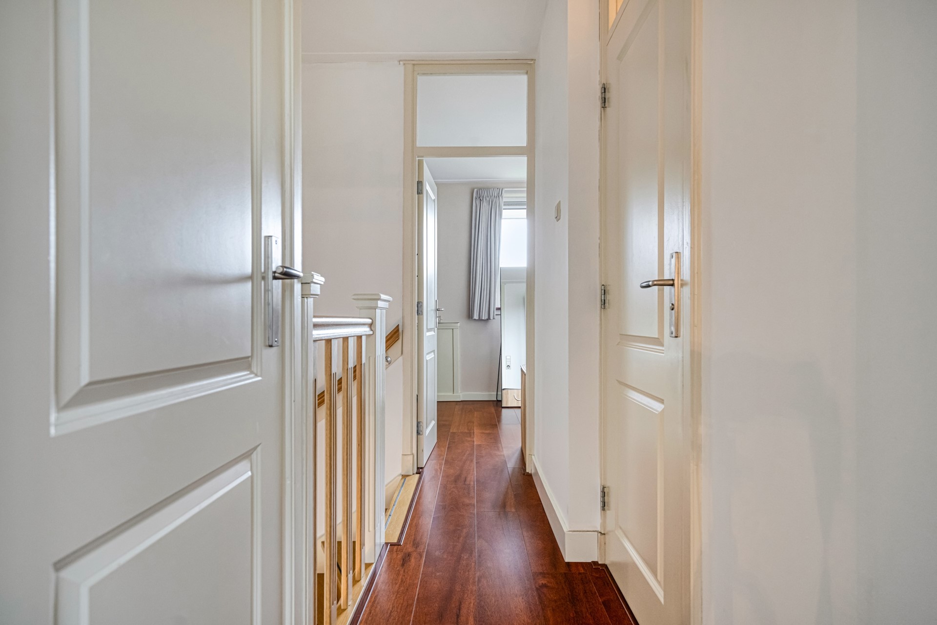Via de trap bereik je de eerste verdieping. Hier bevinden zich twee ruime slaapkamers, beide van goed formaat en geschikt als hoofd- en tweede slaapkamer of als werk-/logeerkamer. De luxe badkamer is modern afgewerkt en voorzien van een ligbad, inloopdouche, toilet en een dubbele wastafel. Een comfortabele en complete badkamer die aansluit bij het afwerkingsniveau van de woning.