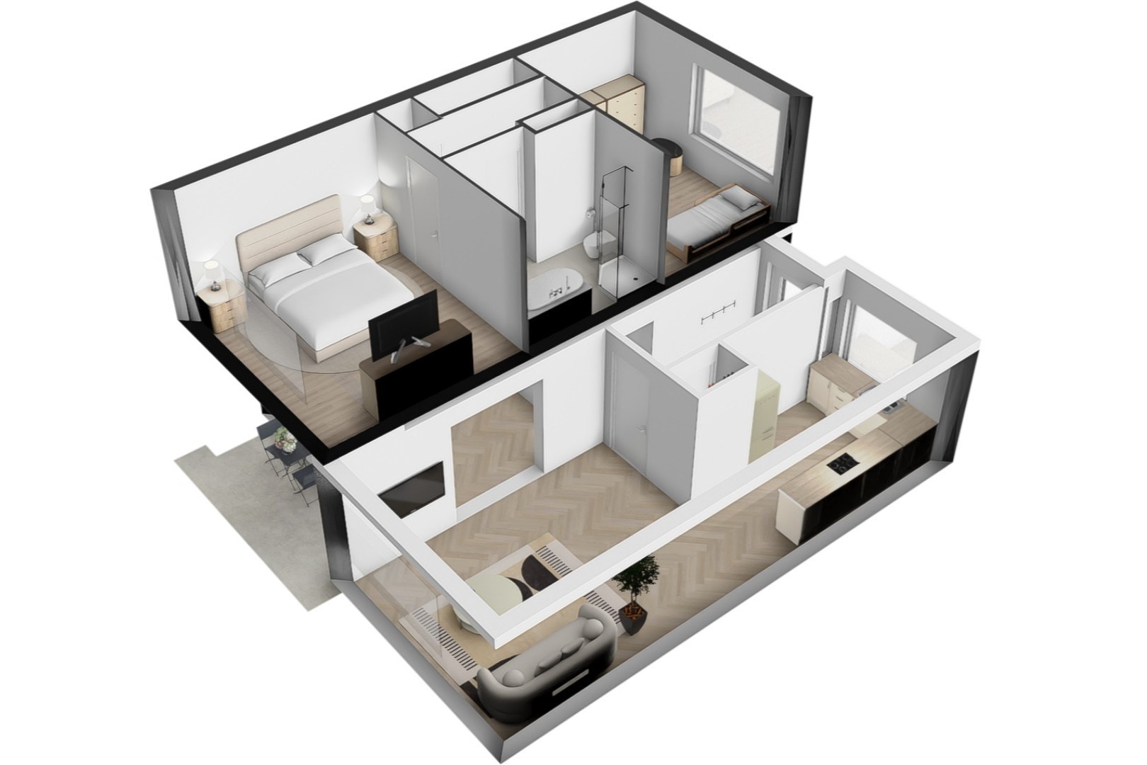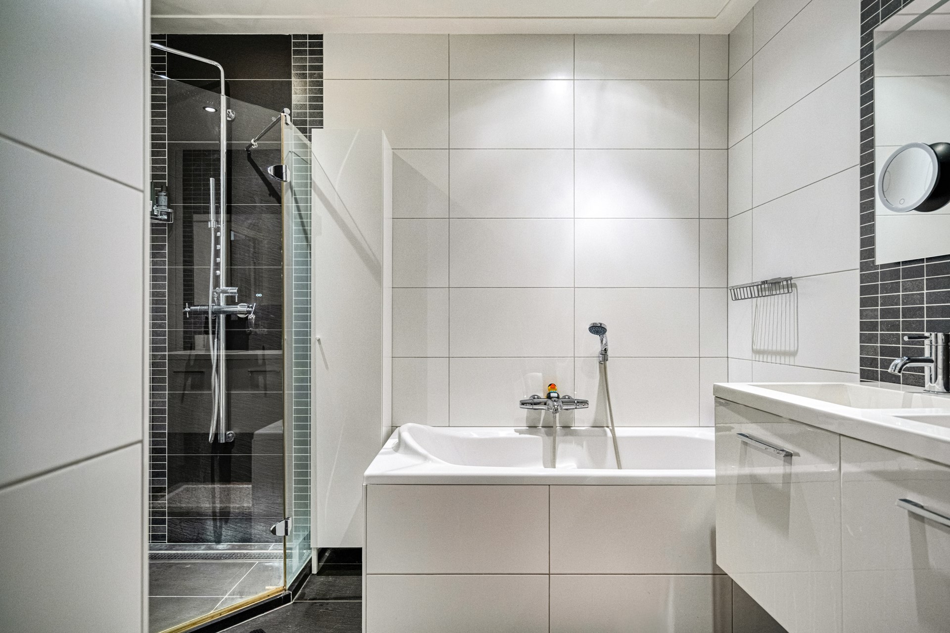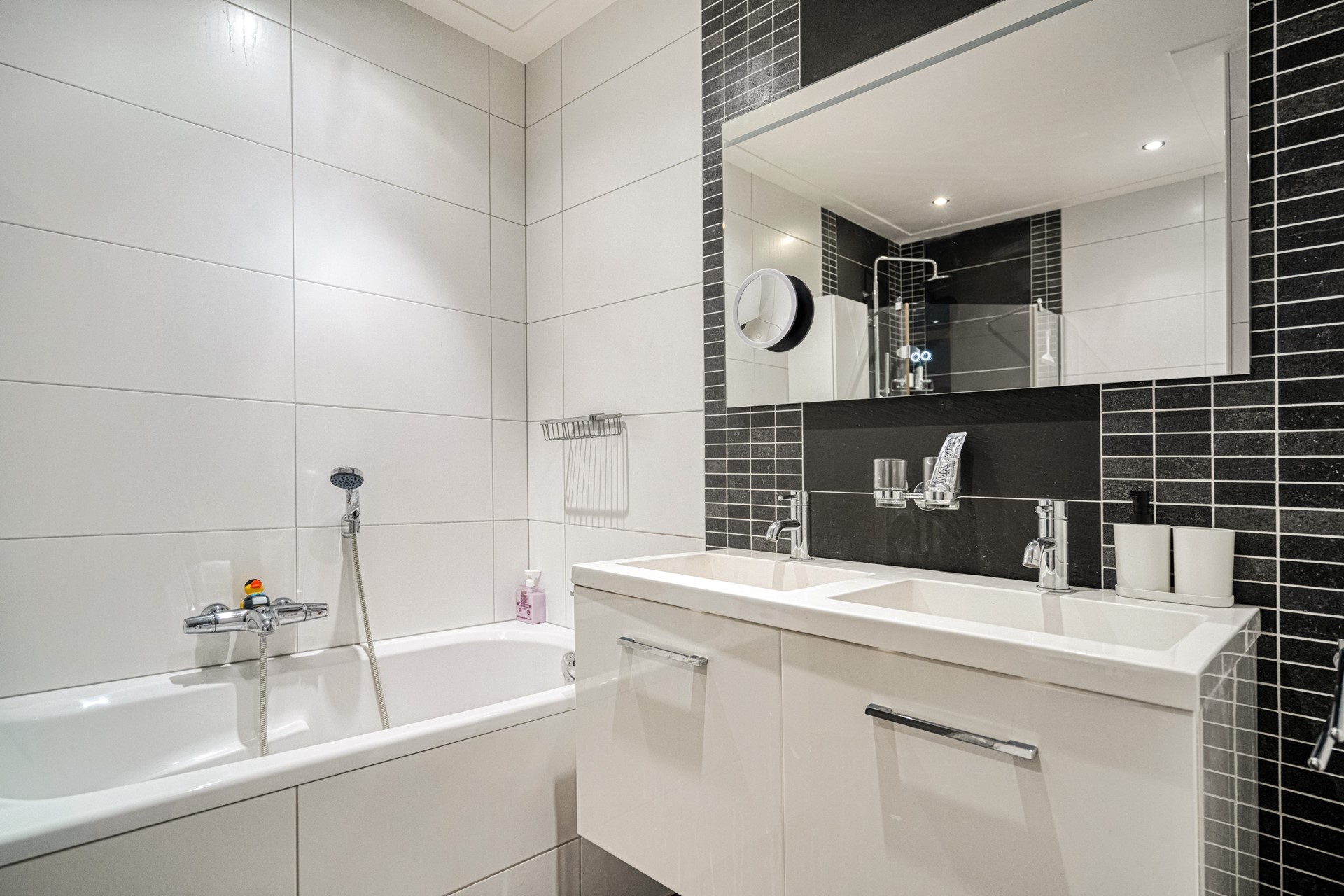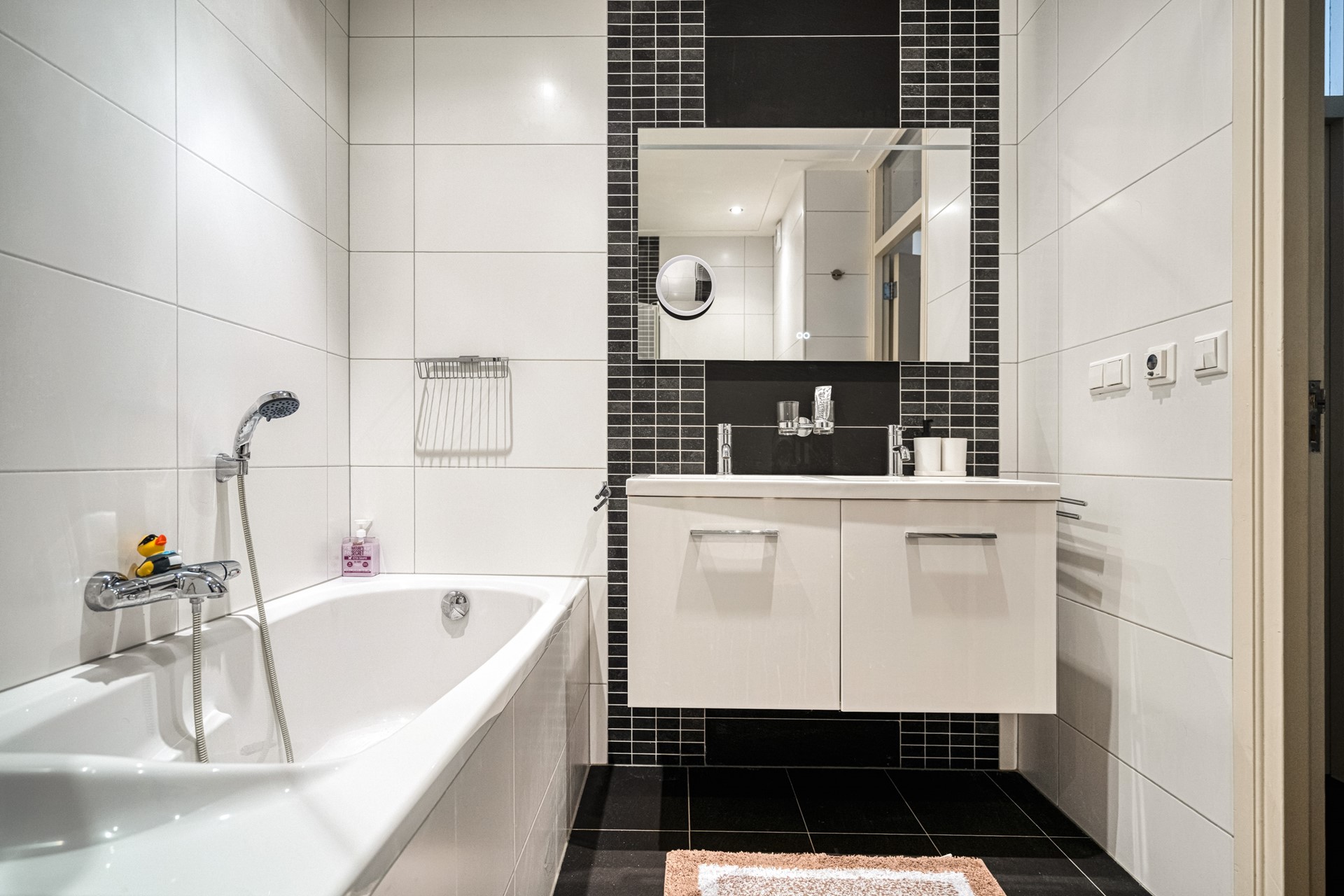 Via the internal staircase, you reach the first floor. Here you will find two spacious bedrooms, both generously sized and suitable as a master bedroom, second bedroom or home office. The luxury bathroom is modernly finished and features a bathtub, walk-in shower, toilet and double washbasin.