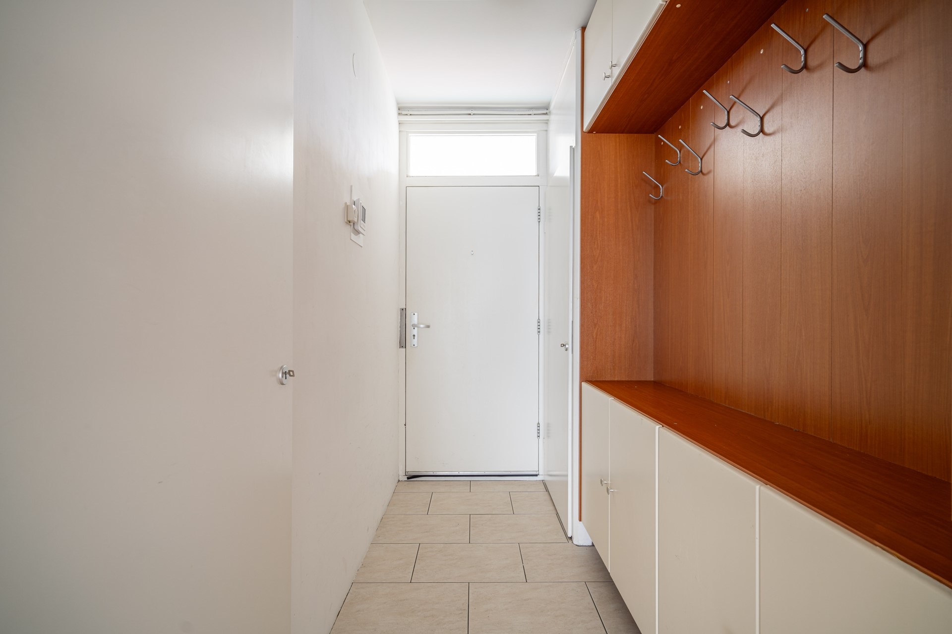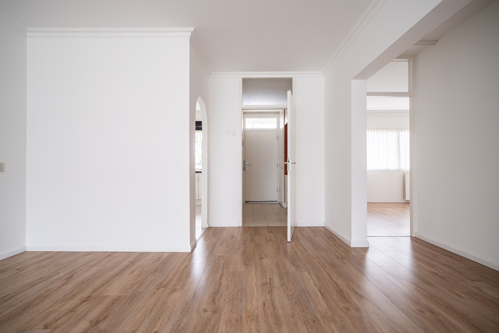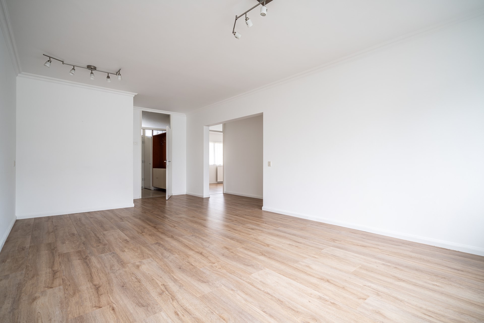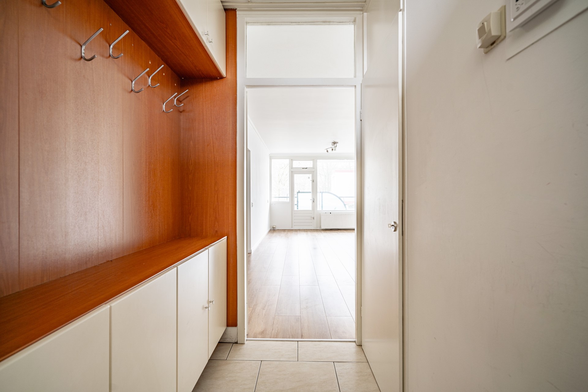 Entree van het appartement. Ruime hal met meterkast en vaste bergkast. De lichte woonkamer voelt direct prettig aan door de nette afwerking, het recente stuc- en schilderwerk en de doorgelegde laminaatvloer.