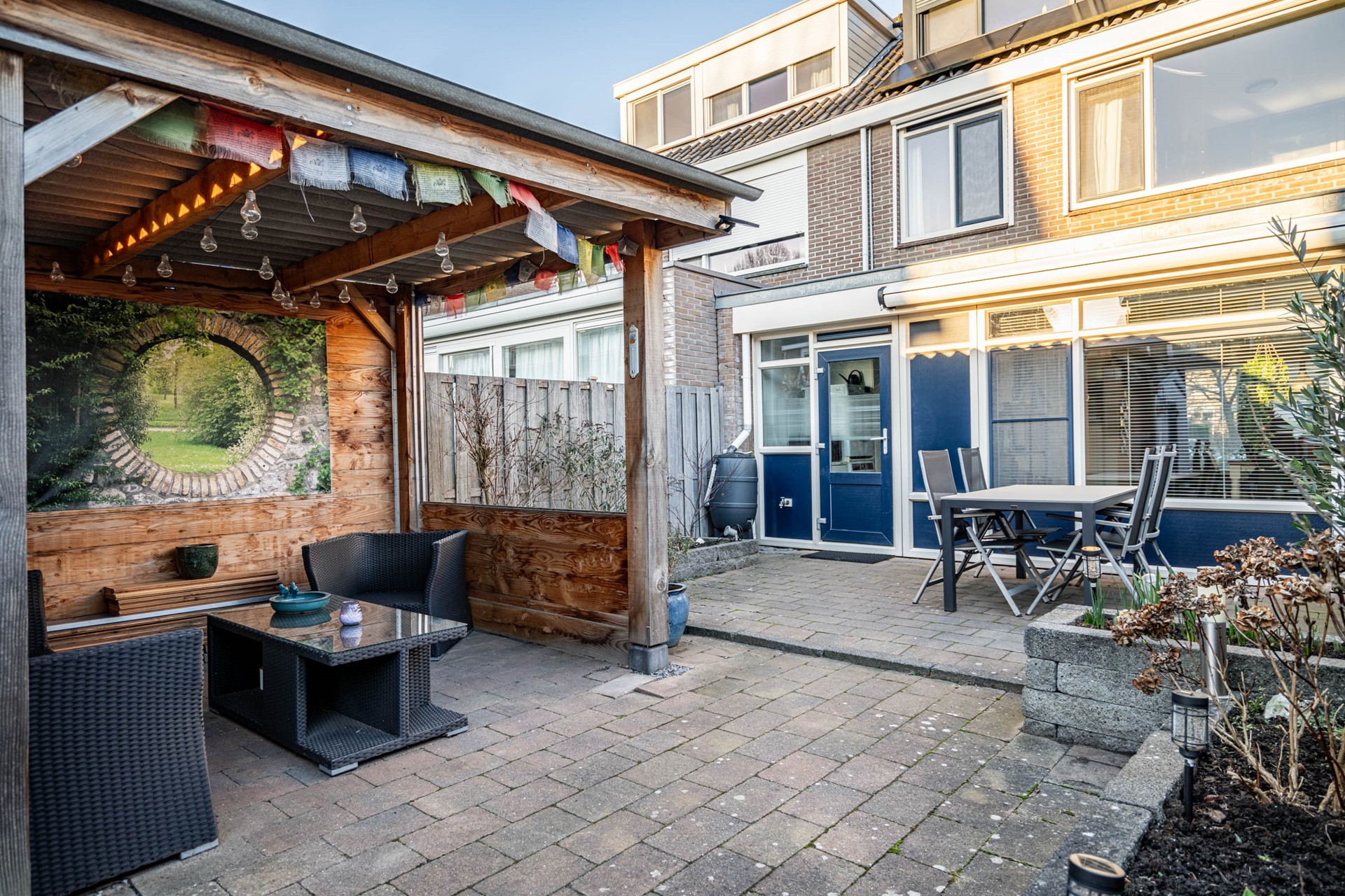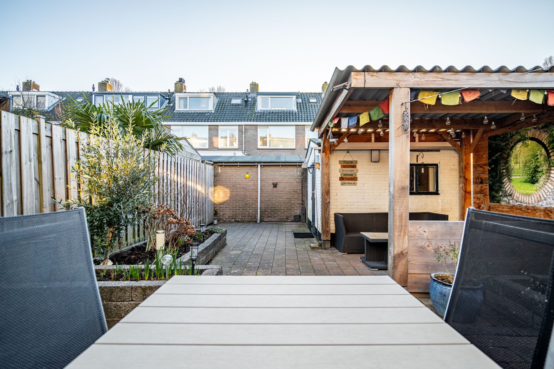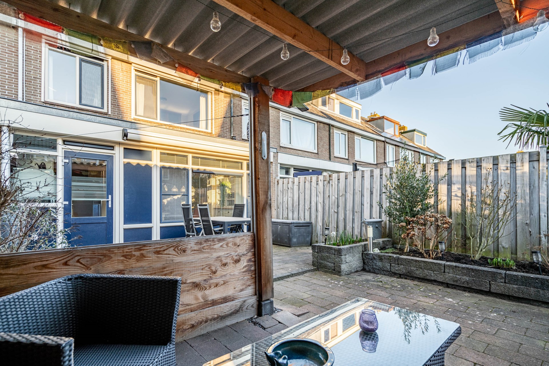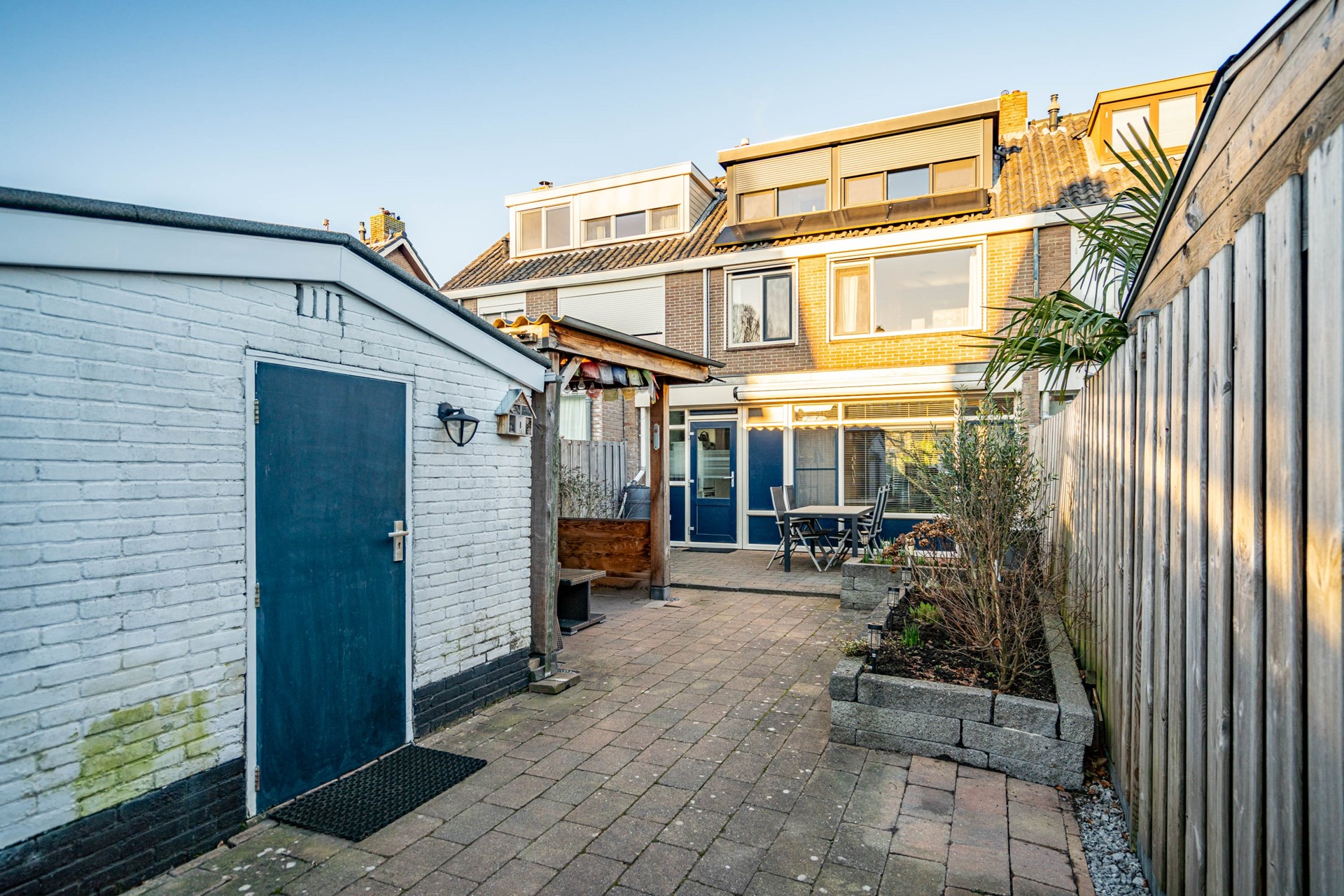 Via de bijkeuken stap je de zonnige achtertuin op het zuidwesten in. Hier begrijp je meteen waarom het zonnescherm geen overbodige luxe is. De tuin is extra diep doordat de poort bij deze woning eindigt — een uniek voordeel ten opzichte van de buren.