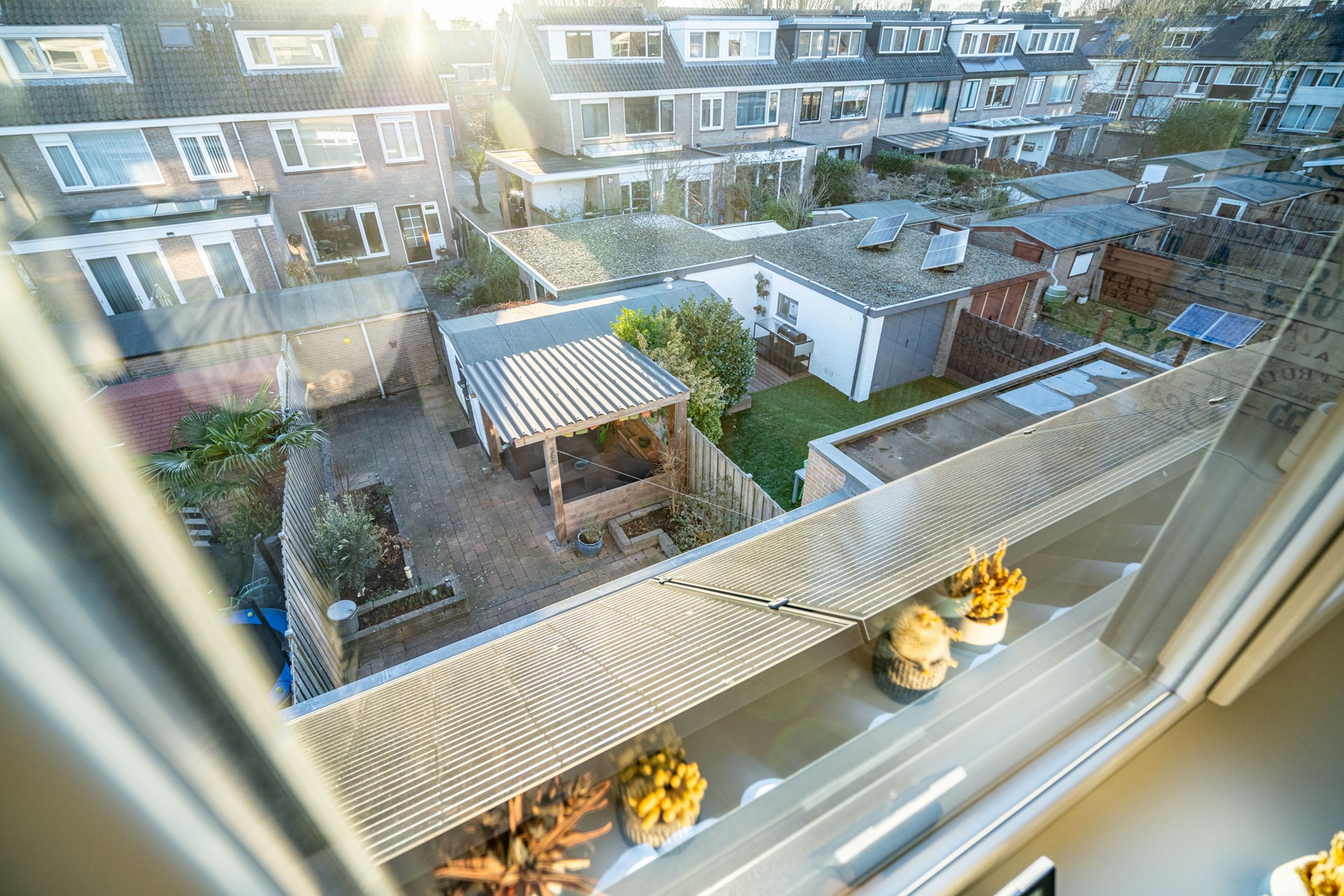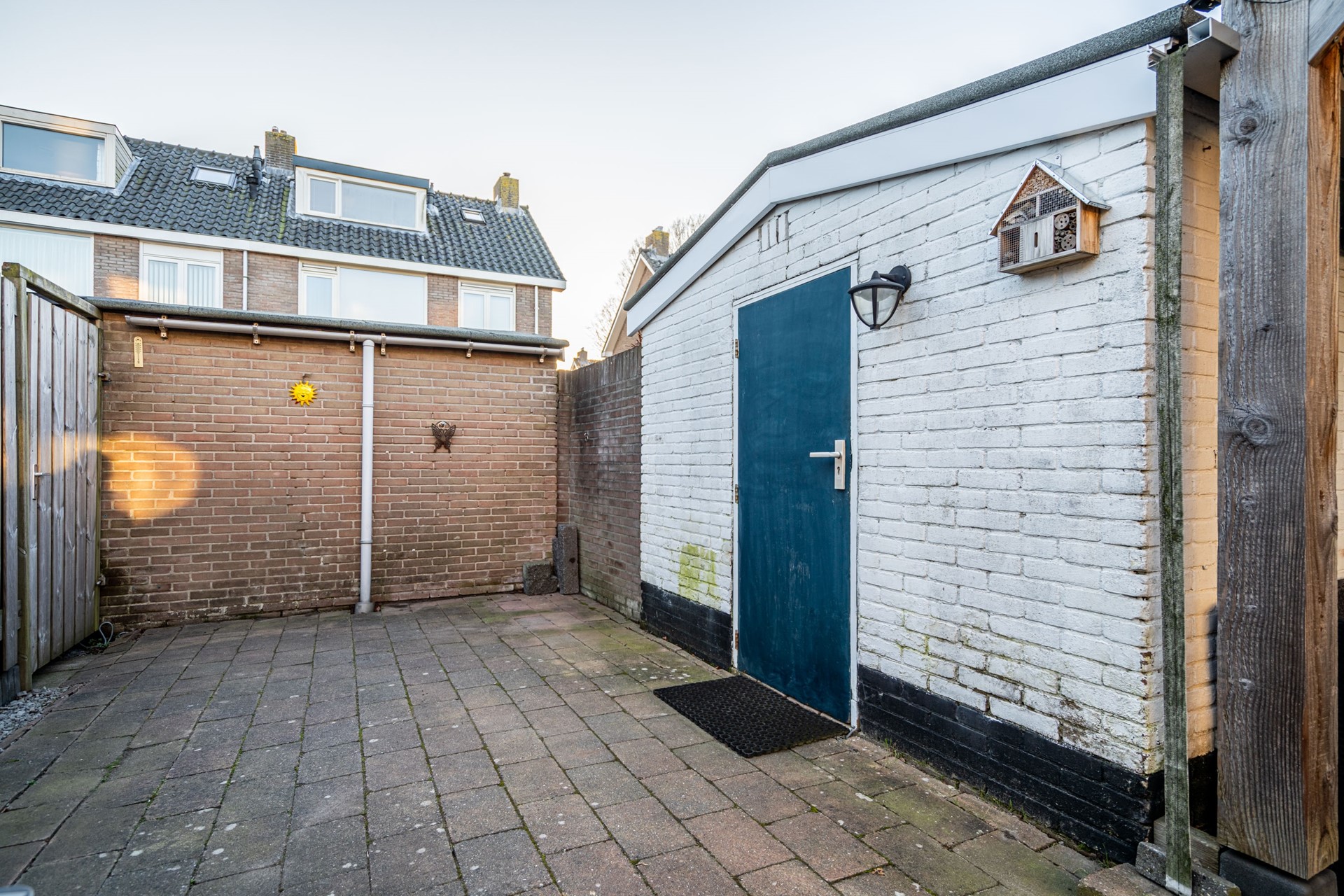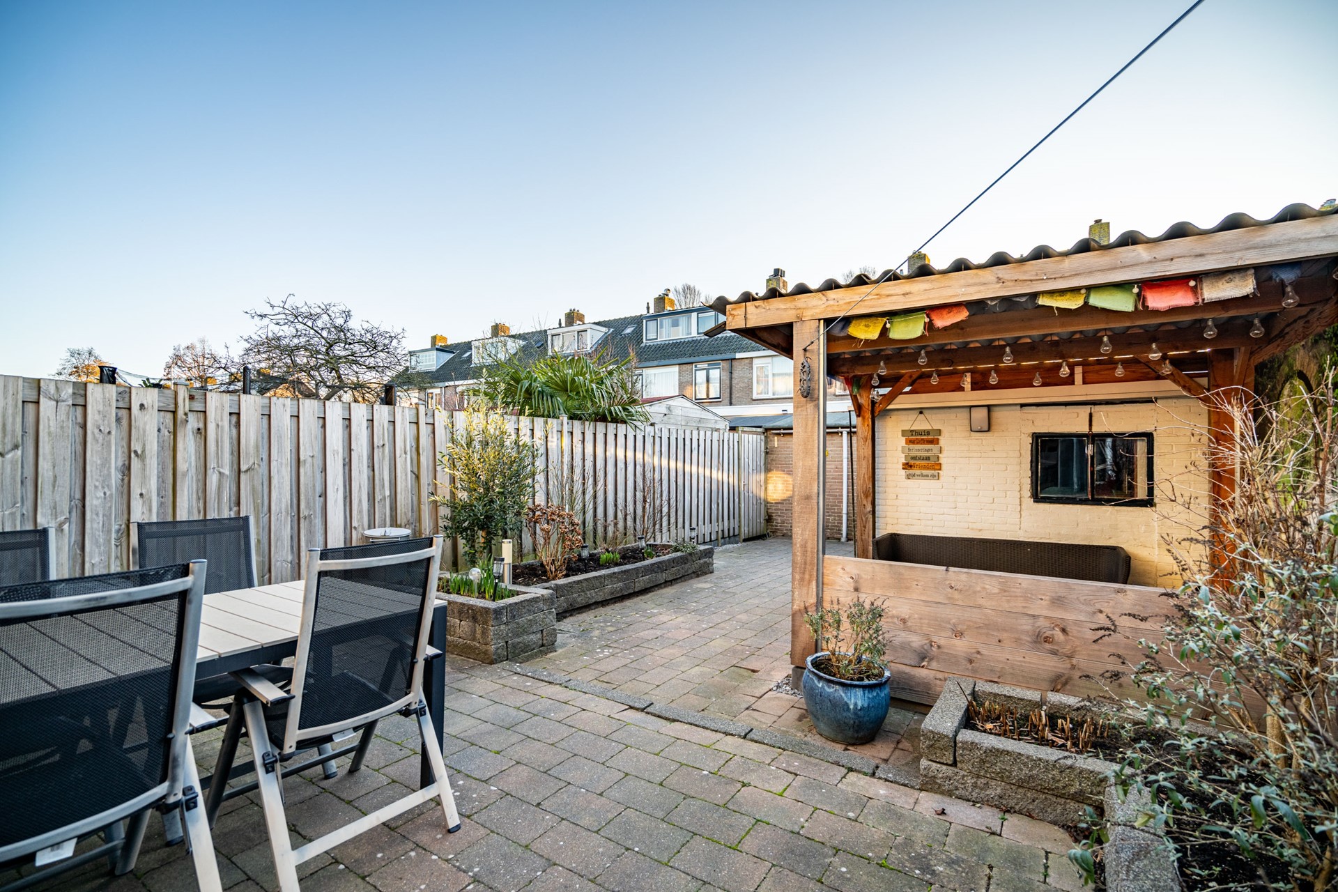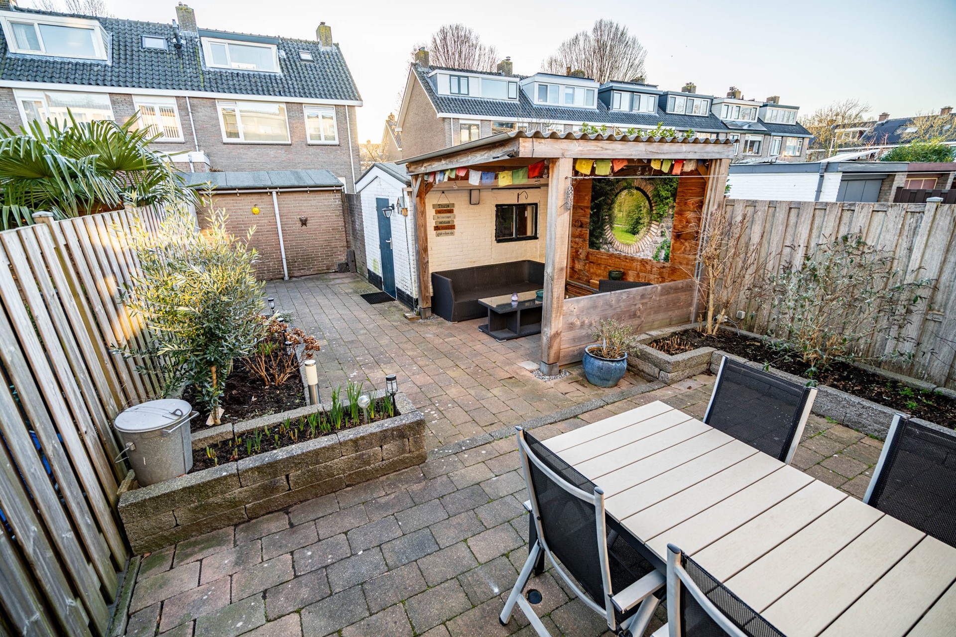 Via de bijkeuken stap je de zonnige achtertuin op het zuidwesten in. Hier begrijp je meteen waarom het zonnescherm geen overbodige luxe is. De tuin is extra diep doordat de poort bij deze woning eindigt — een uniek voordeel ten opzichte van de buren.