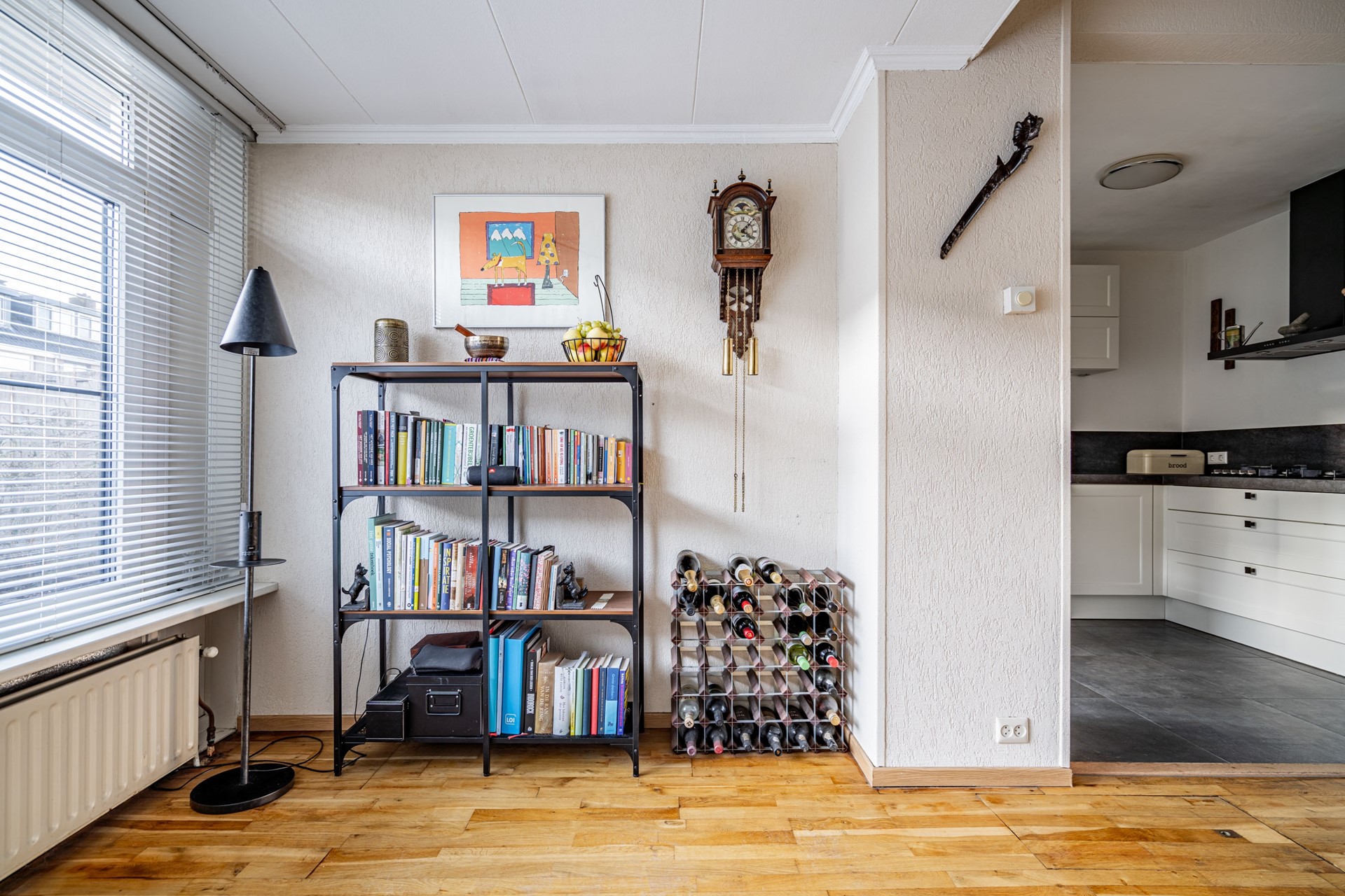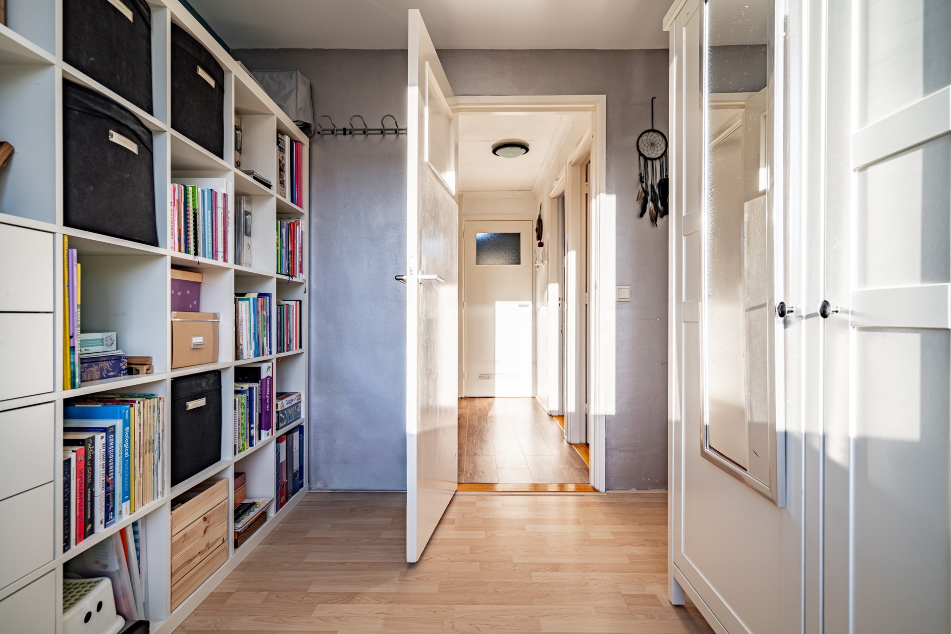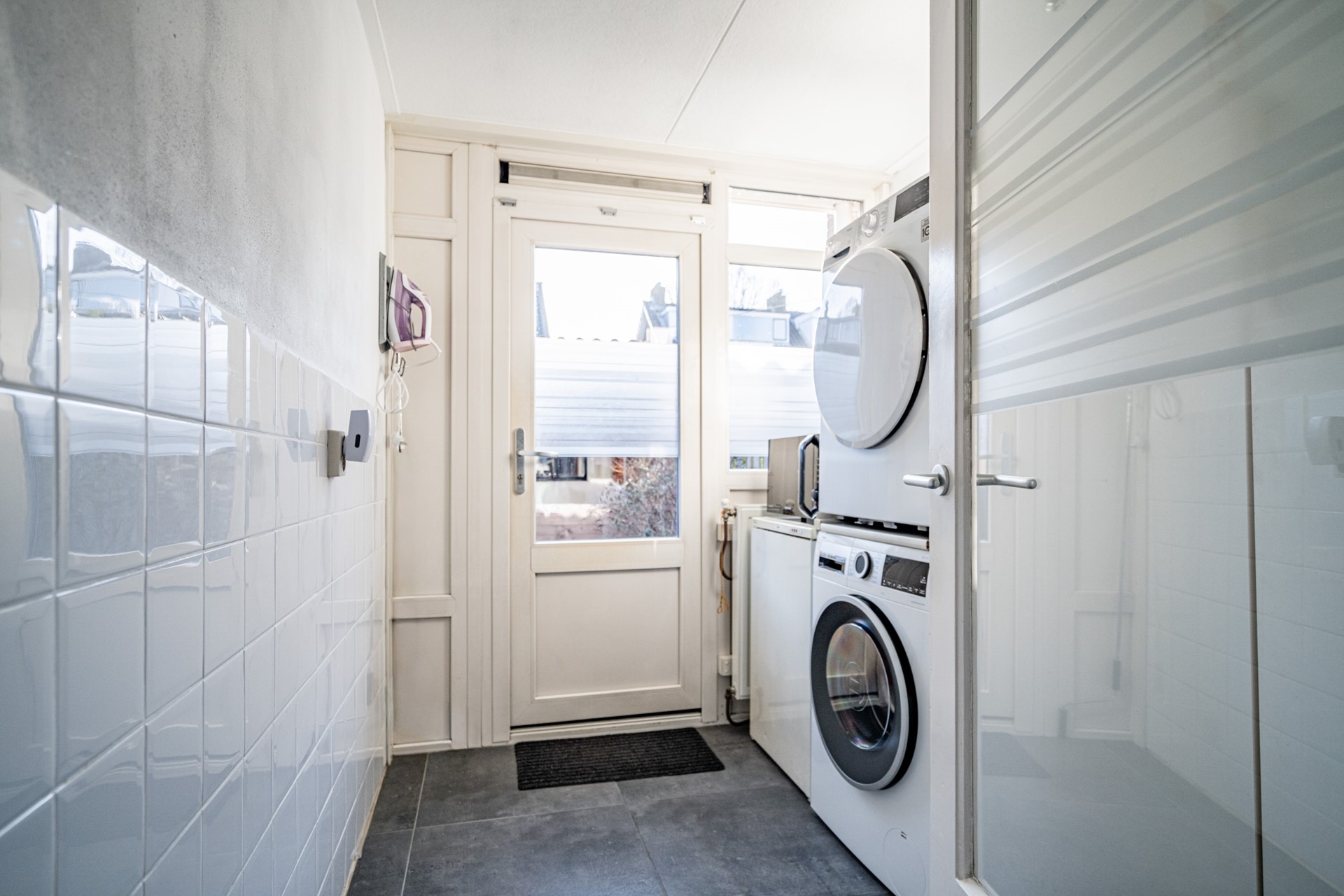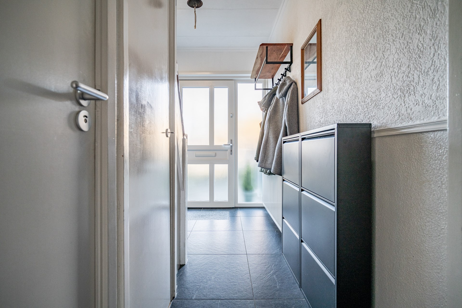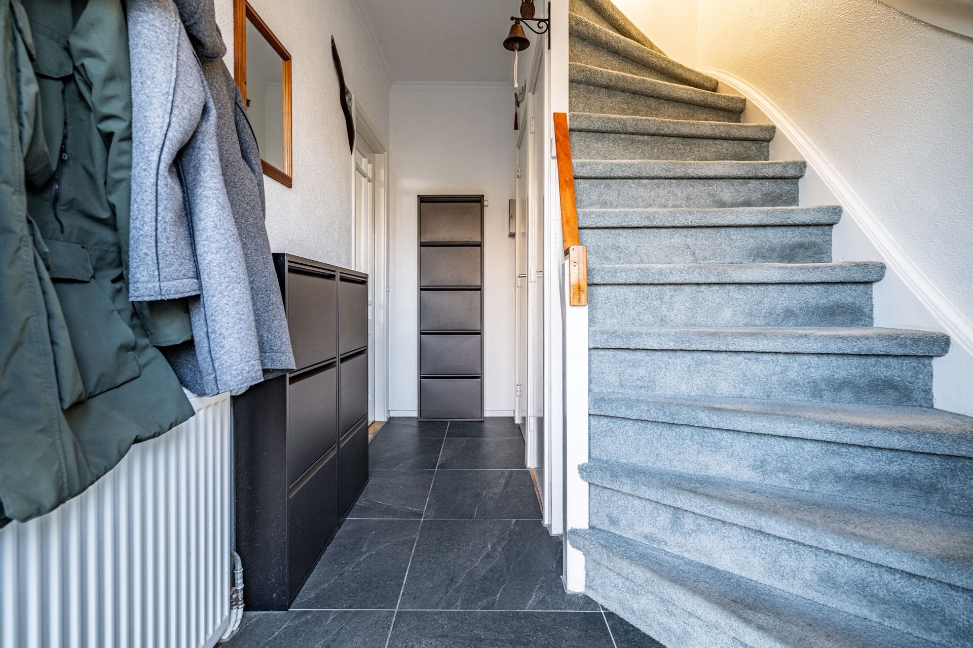 Je parkeert de auto in de straat en loopt richting de voordeur. Binnen wordt je ontvangen in de verzorgde hal met meterkast (9 groepen + 3 aardlekschakelaars) en een modern toilet (vernieuwd in 2024). Alles voelt direct netjes en goed onderhouden.