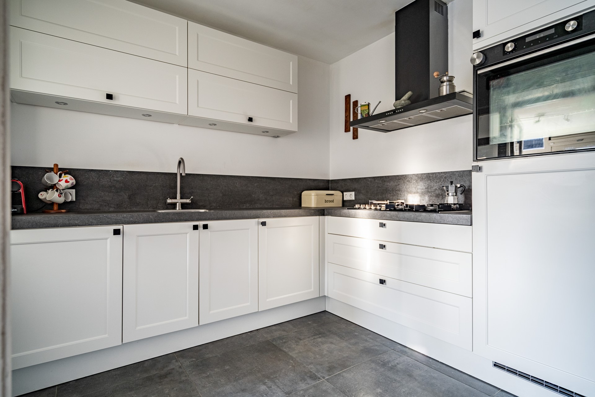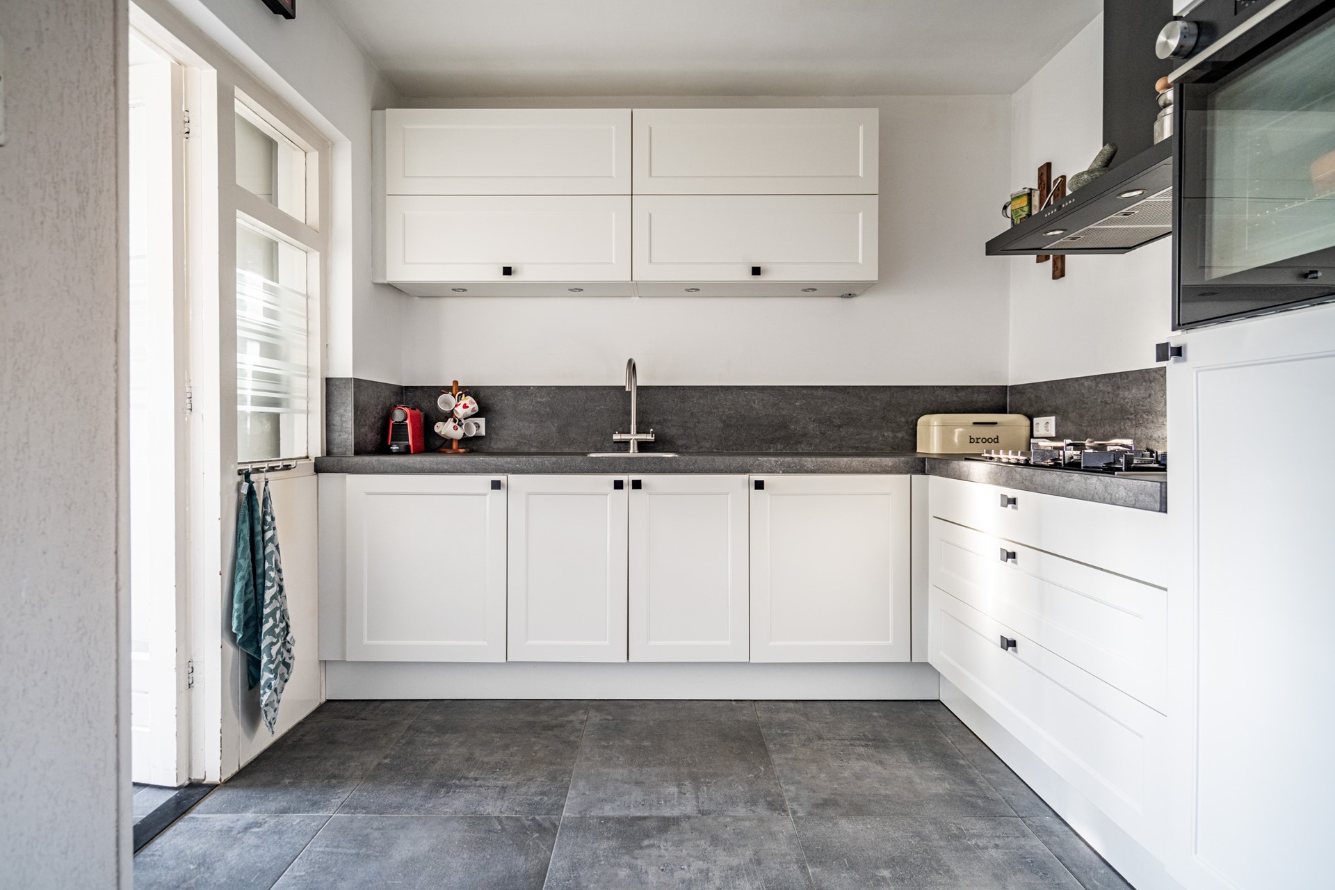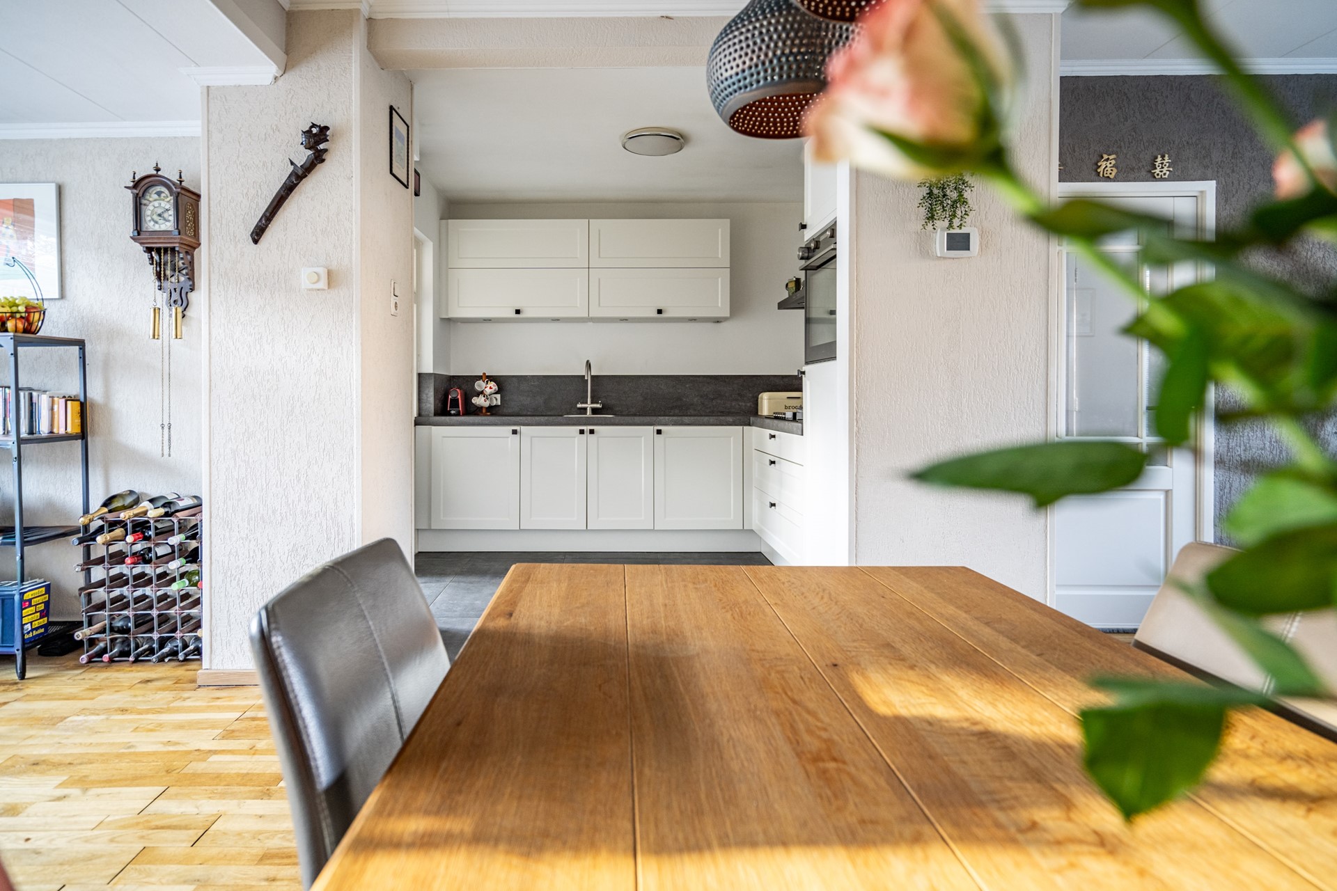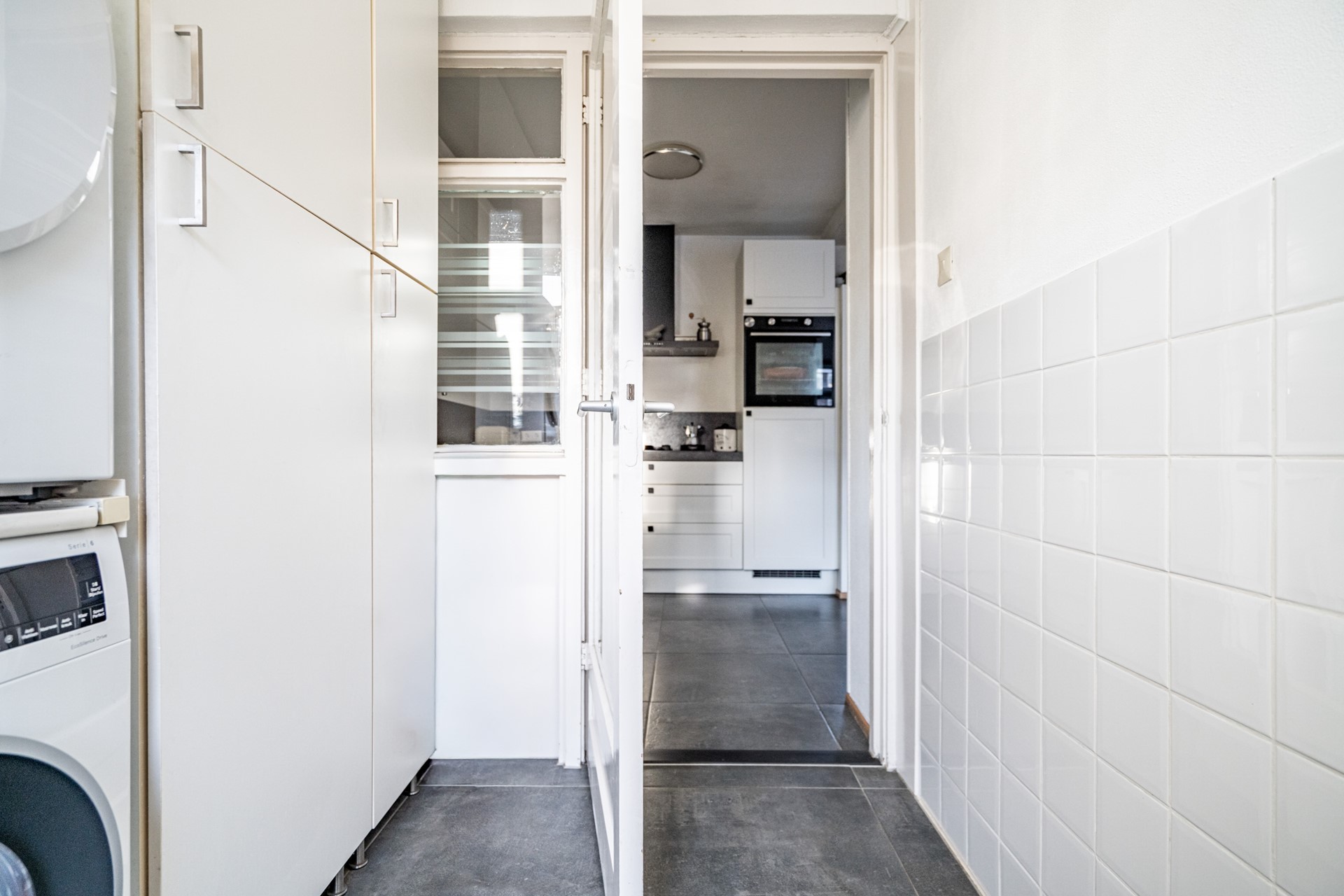 De open keuken sluit naadloos aan op de leefruimte en is voorzien van een vijf pits gasfornuis, afzuigkap, koelkast, oven en boiler. Praktisch ingedeeld en met zicht op de tuin. In de aangrenzende bijkeuken bevinden zich de aansluitingen voor wasmachine en droger — netjes uit het zicht, maar zeer functioneel.
