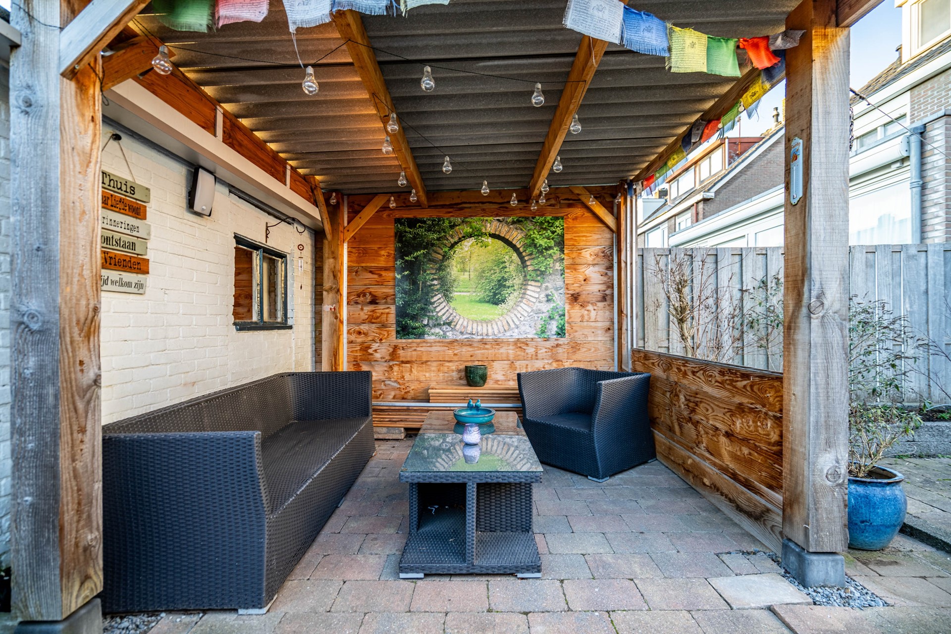 De sfeervolle overkapping maakt dit dé plek voor lange zomeravonden. De stenen berging (voorzien van stroom) en de handige achterom maken het geheel compleet. Met 10 zonnepanelen (geplaatst in 2021) woon je hier bovendien energiezuinig.