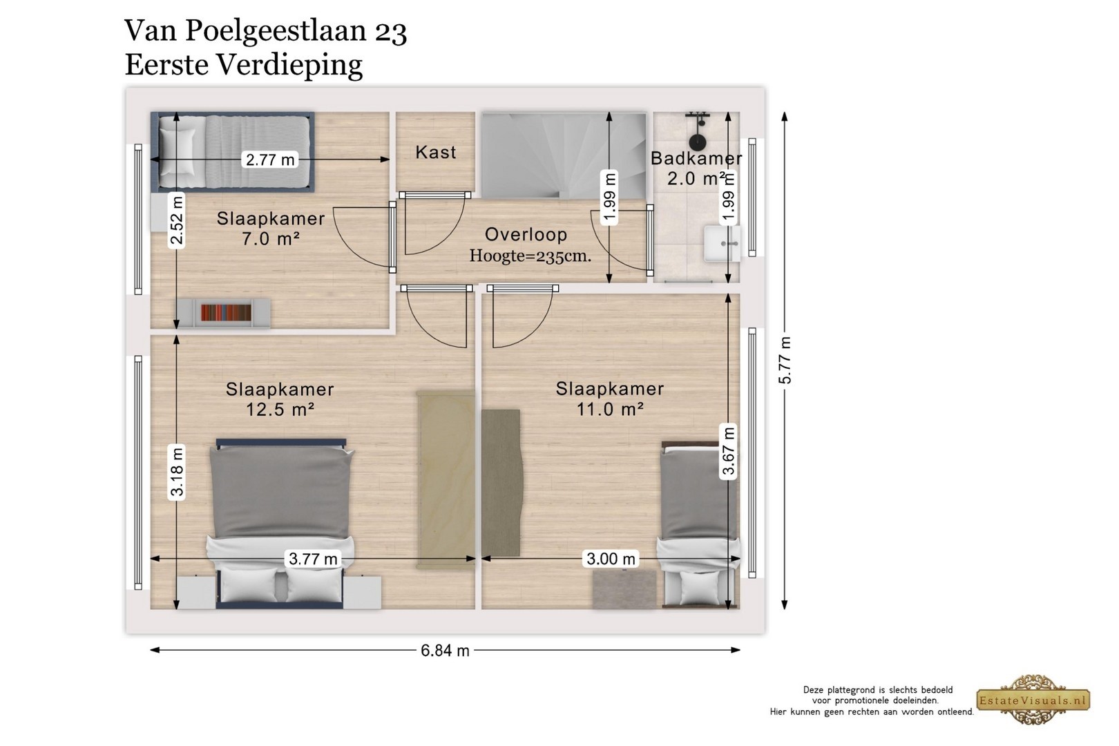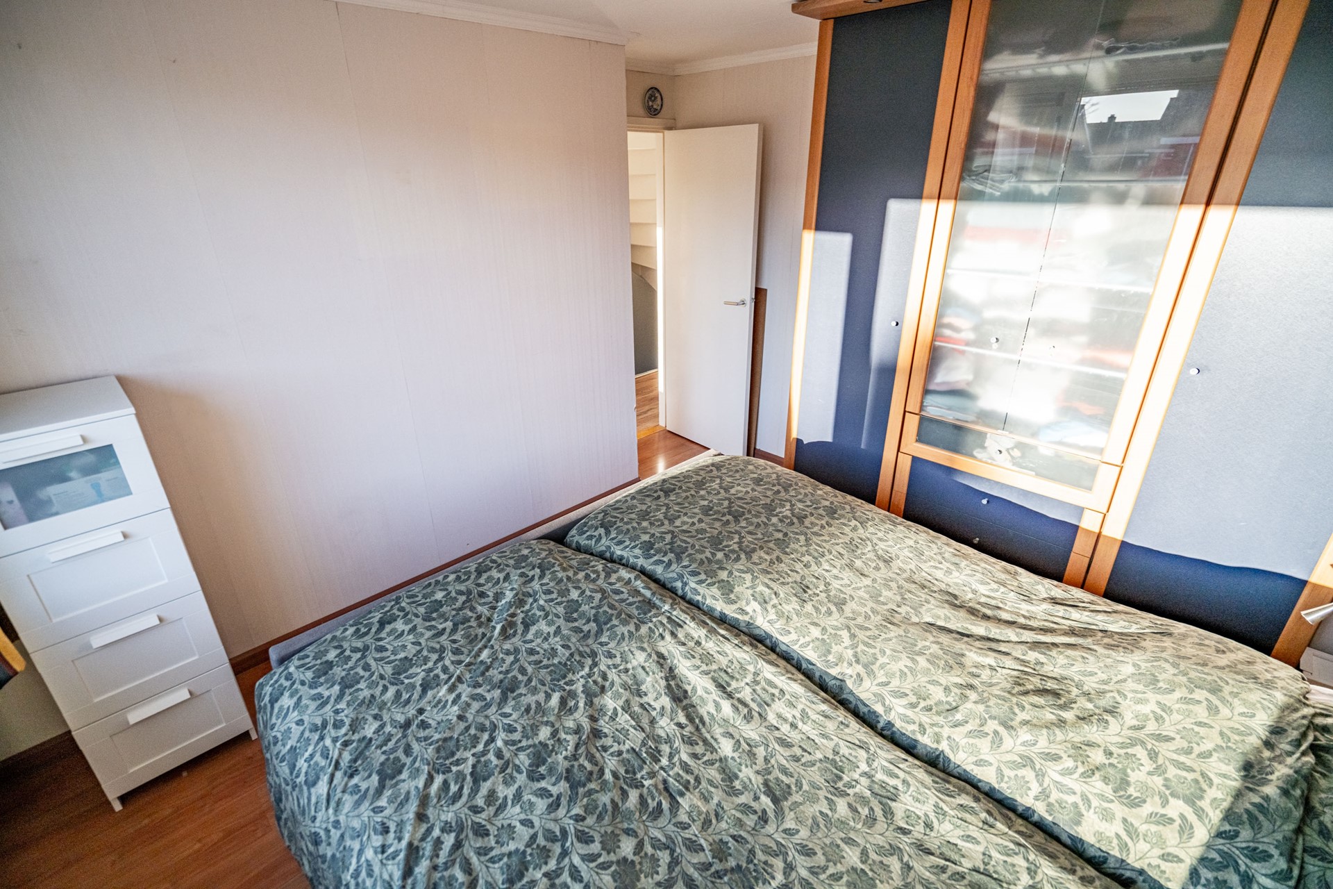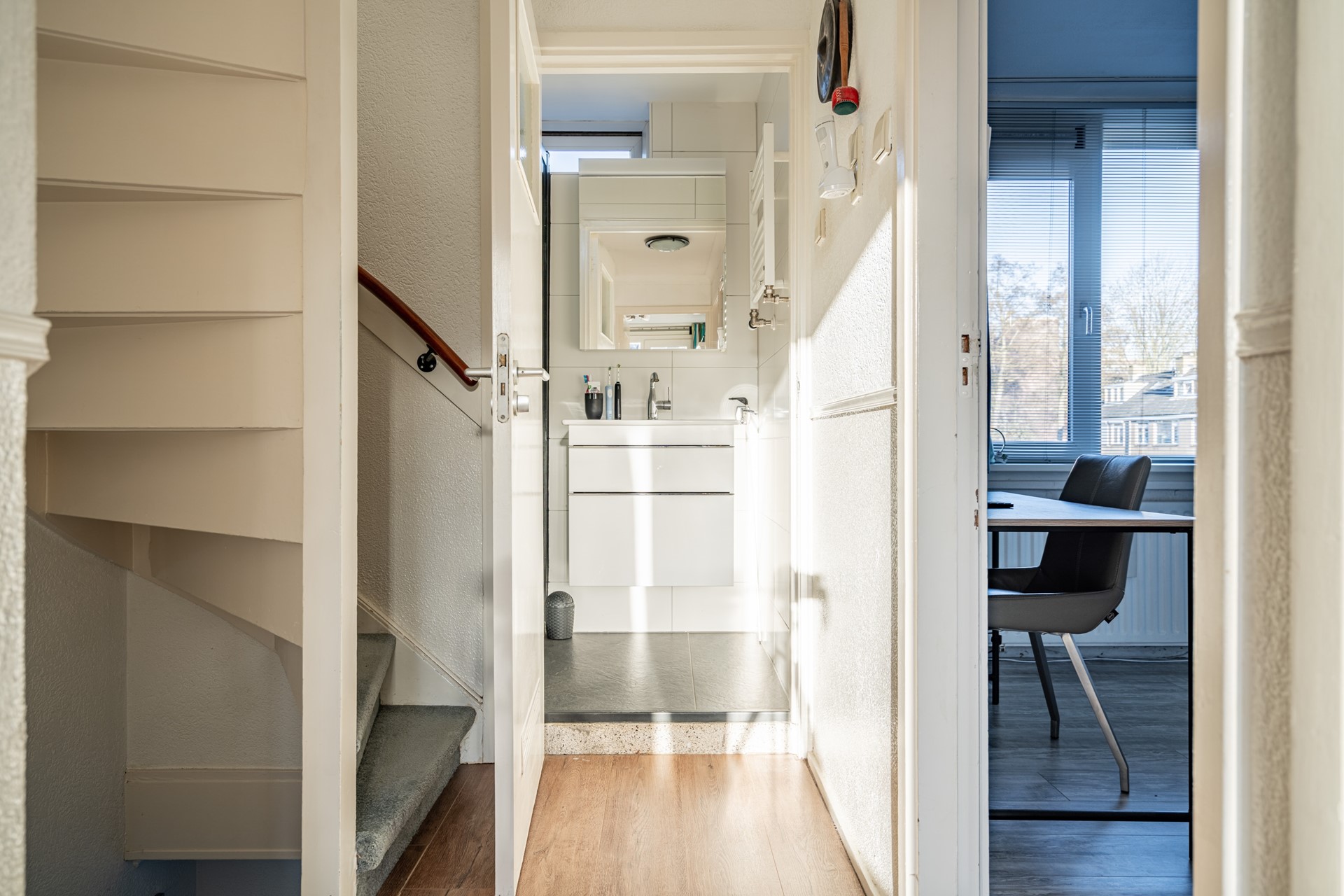 Via de vaste trap bereik je de overloop van de eerste verdieping. Hier bevinden zich drie slaapkamers, een vaste kast en de badkamer (2024).
