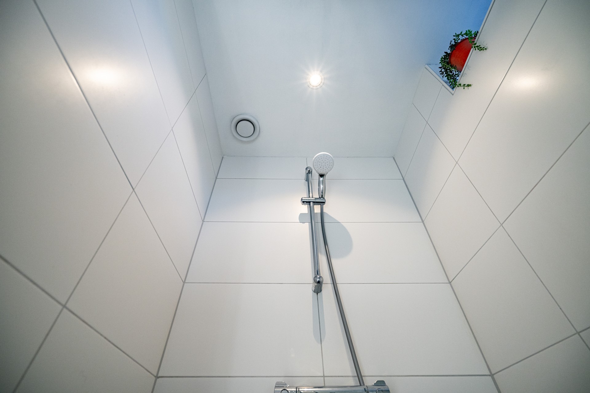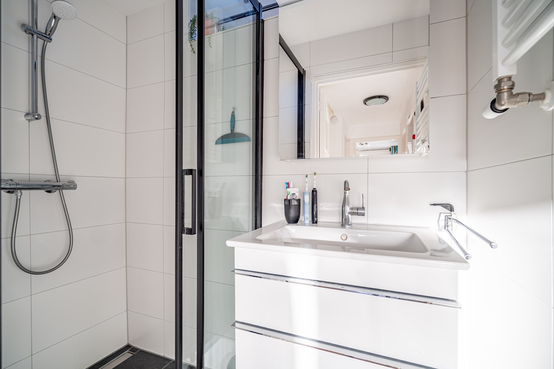 De badkamer is neutraal en volledig betegeld, voorzien van een inloopdouche en een wastafelmeubel. Zowel de slaapkamer aan de voorzijde als aan de achterzijde beschikt over screens — ideaal voor comfort tijdens warme dagen.