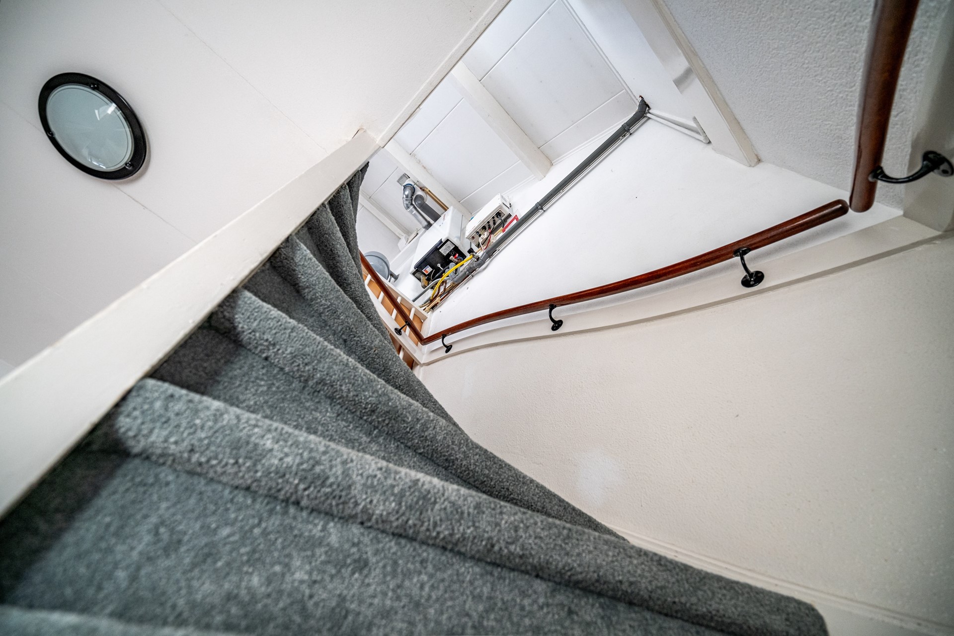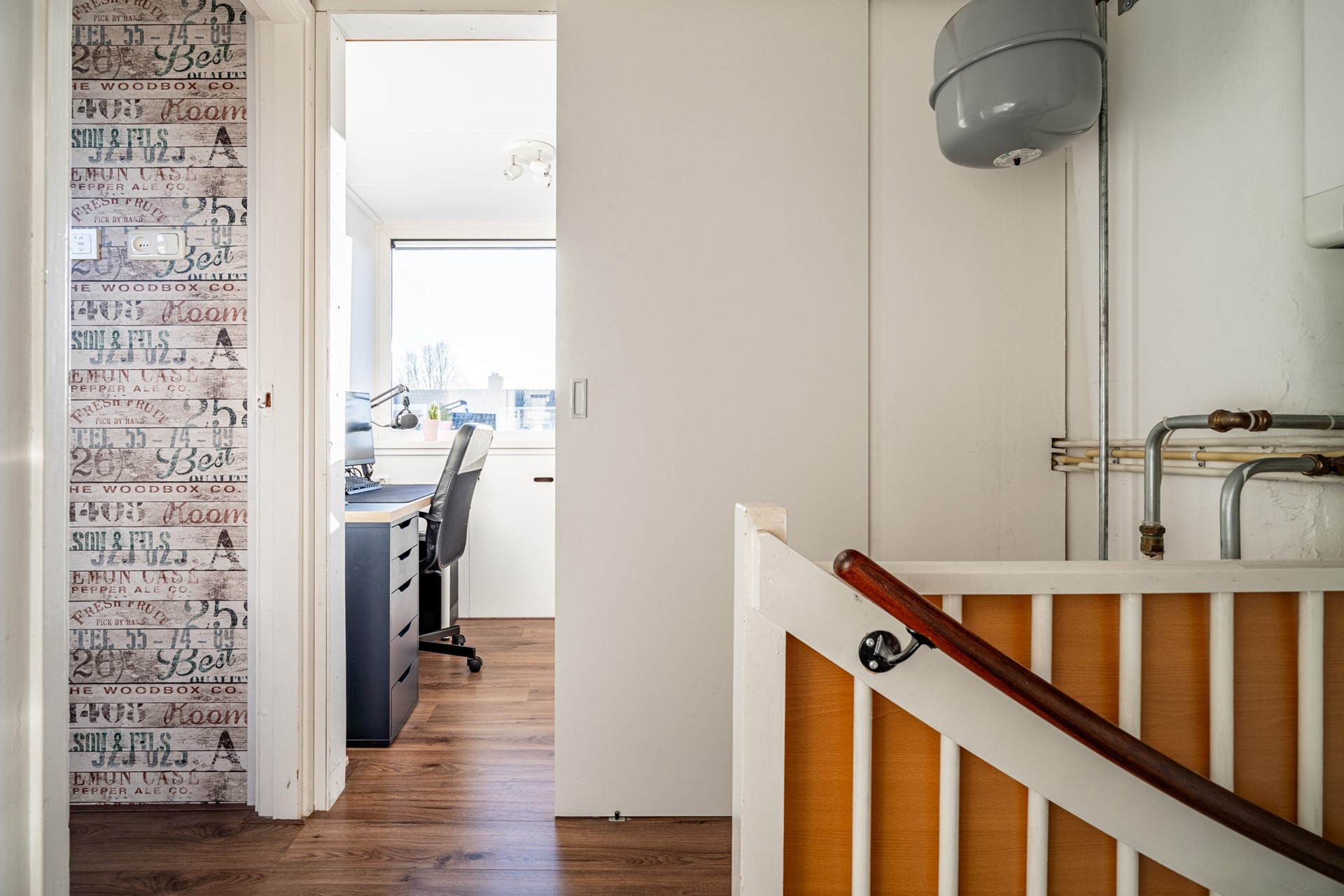 Met de vaste trap kom je op de overloop van de tweede verdieping. Hier vind je de CV-opstelling en toegang tot twee kamers.