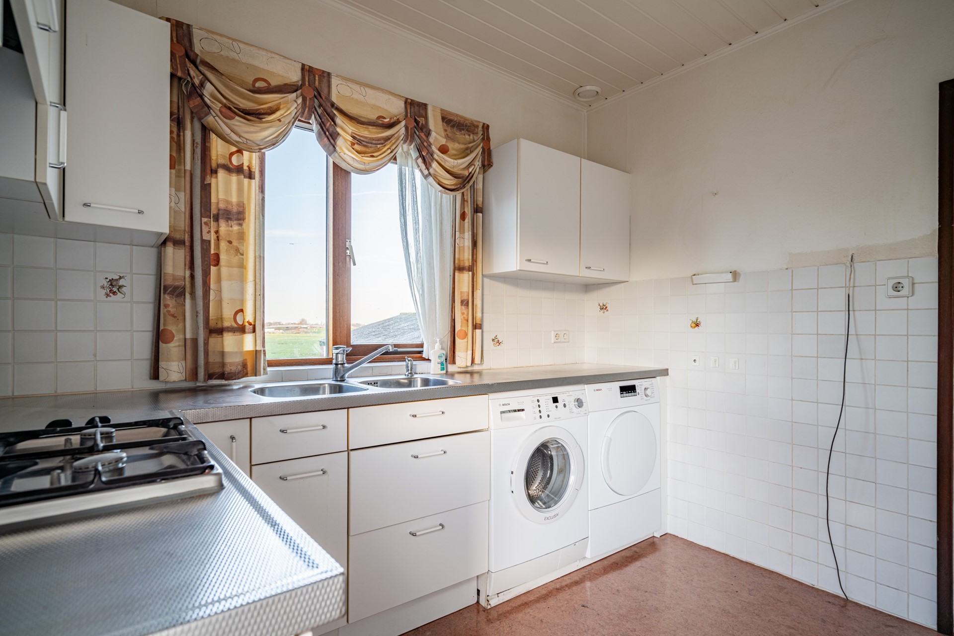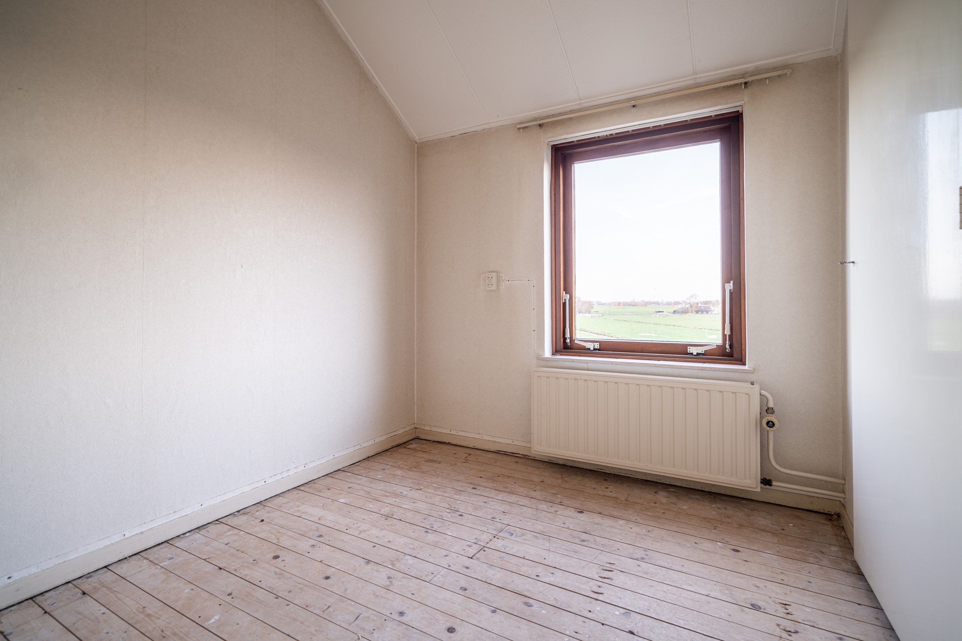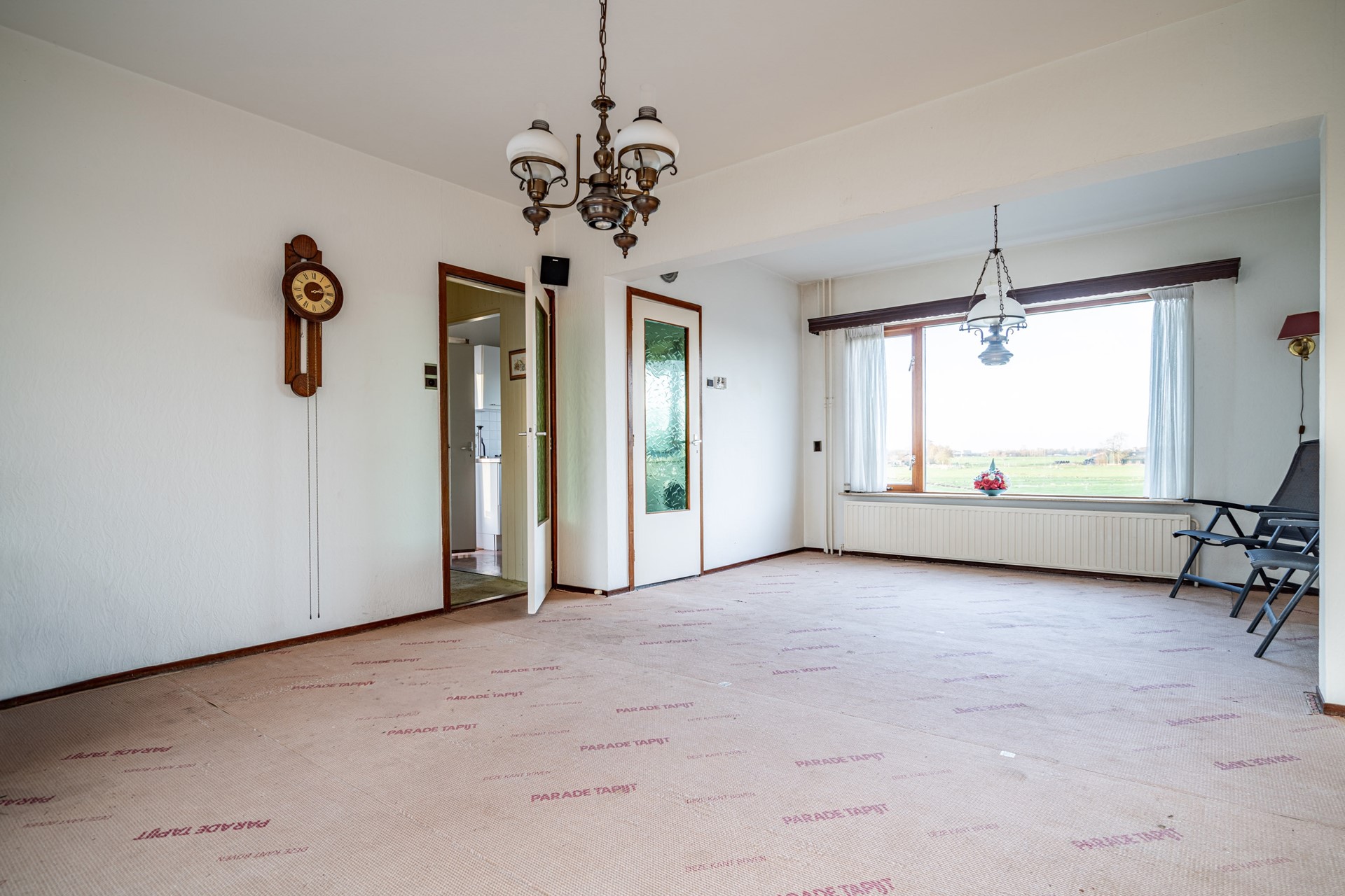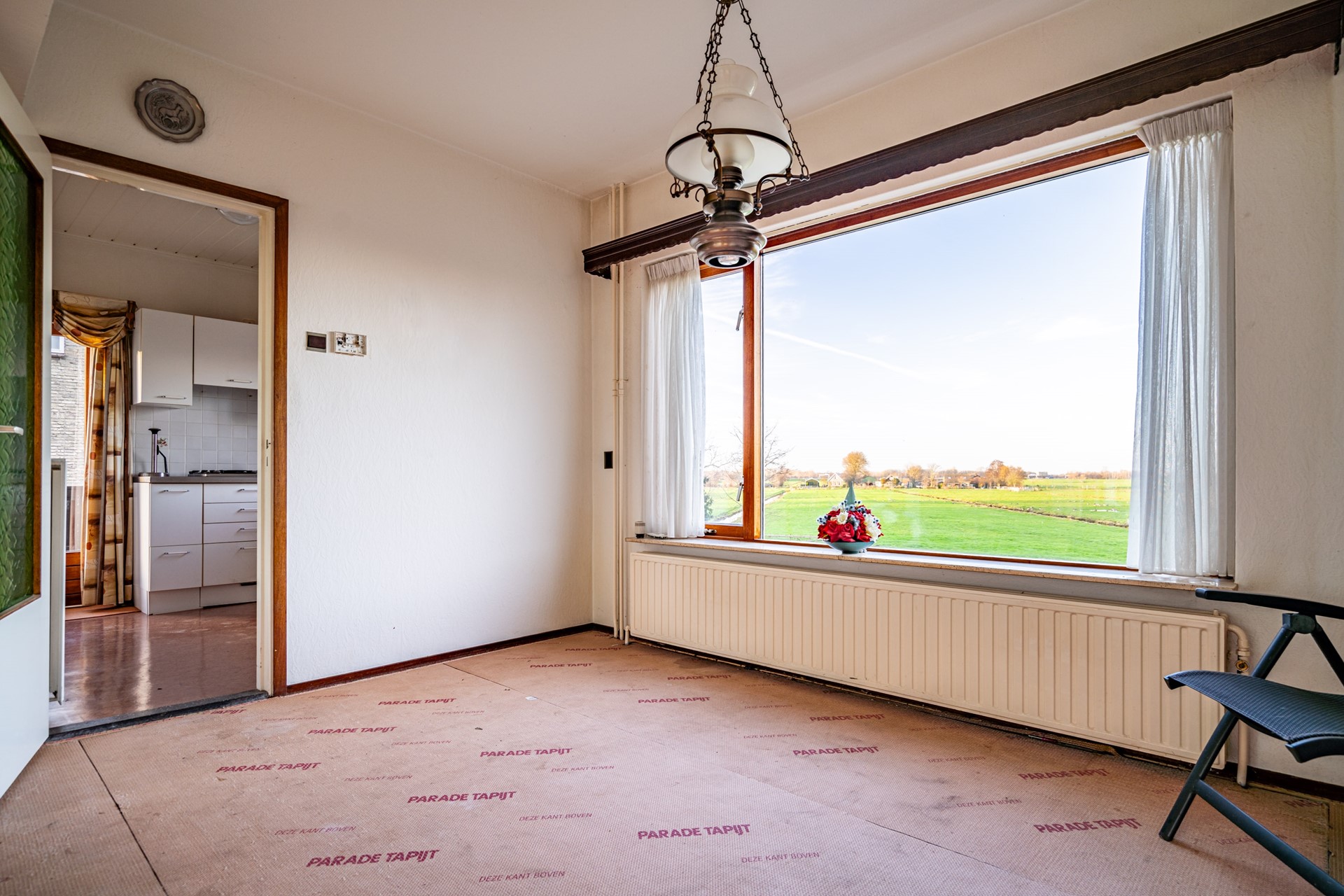De doorzonwoonkamer is heerlijk licht dankzij de grote raampartijen. Wat hier direct in het oog springt, is het prachtige, vrije uitzicht over de landerijen – een uitzicht dat nooit verveelt. De keuken bevindt zich aan de achterzijde van de woning en biedt toegang tot de ruime kelder onder de woning.