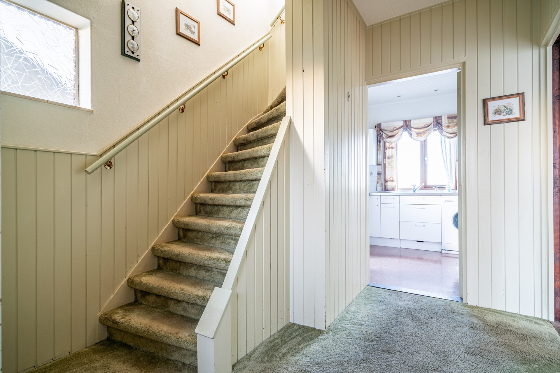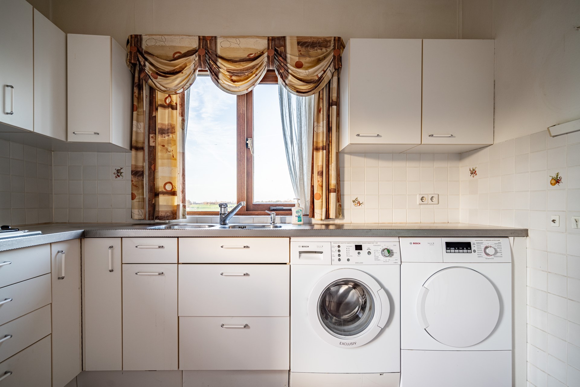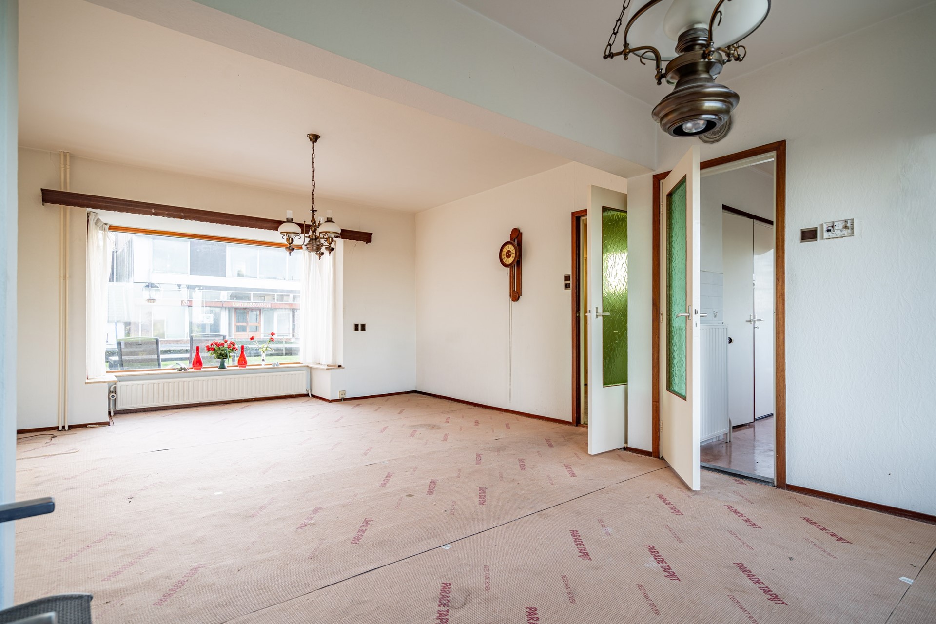 De doorzonwoonkamer is heerlijk licht dankzij de grote raampartijen. Wat hier direct in het oog springt, is het prachtige, vrije uitzicht over de landerijen – een uitzicht dat nooit verveelt. De keuken bevindt zich aan de achterzijde van de woning en biedt toegang tot de ruime kelder onder de woning.