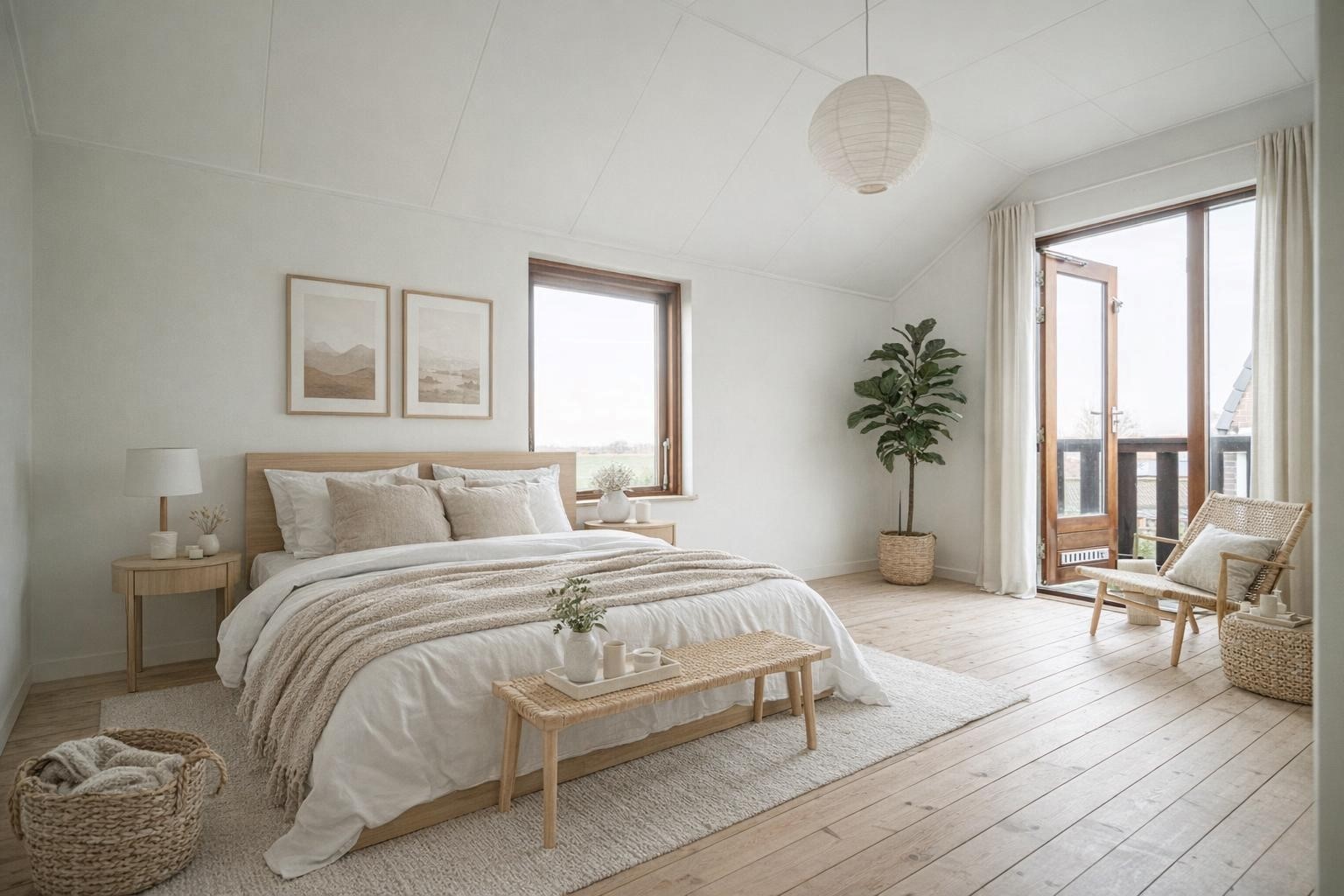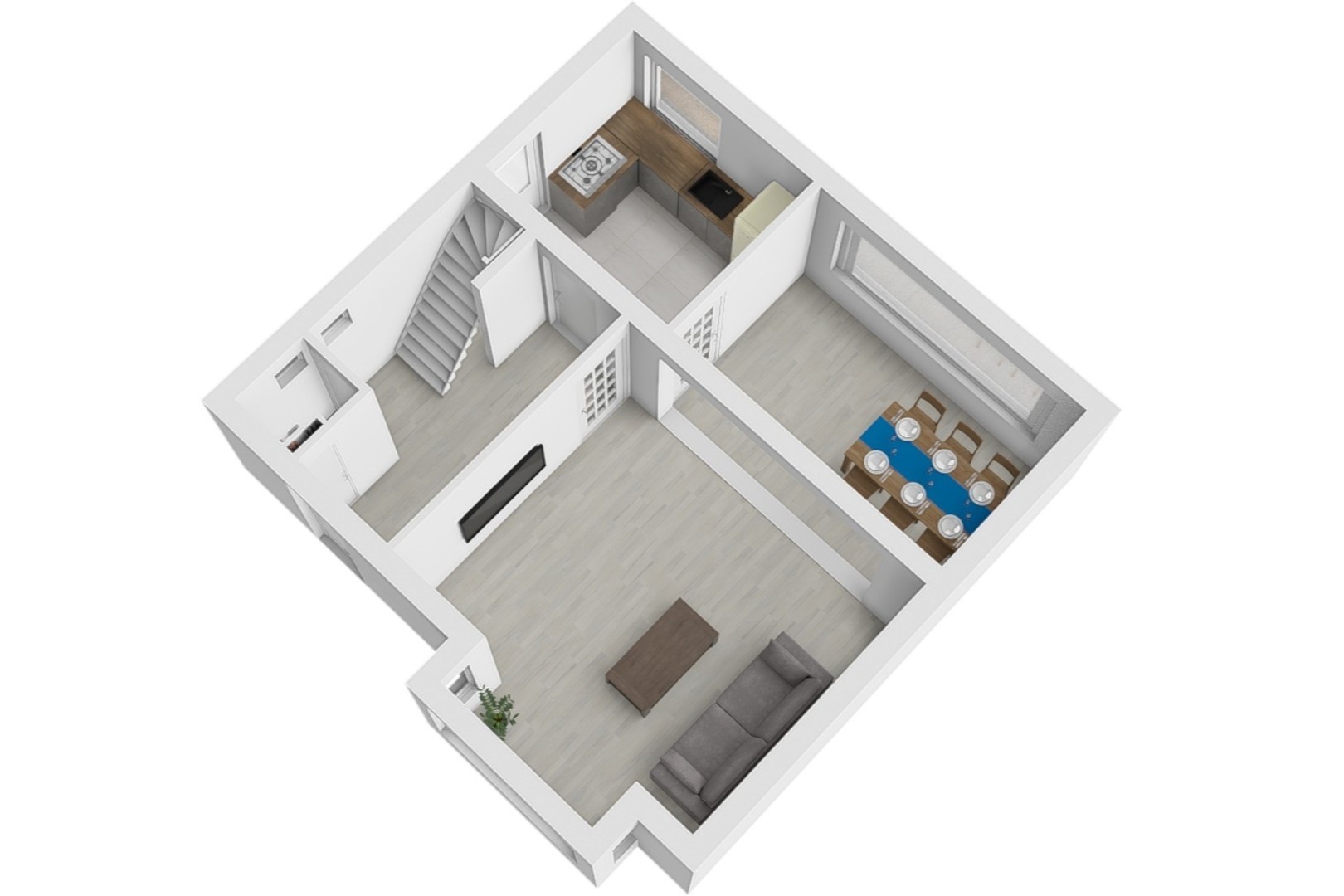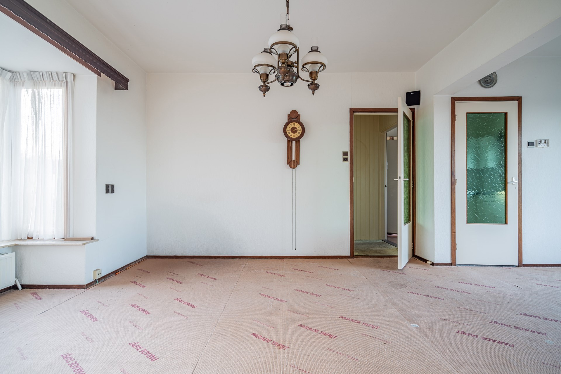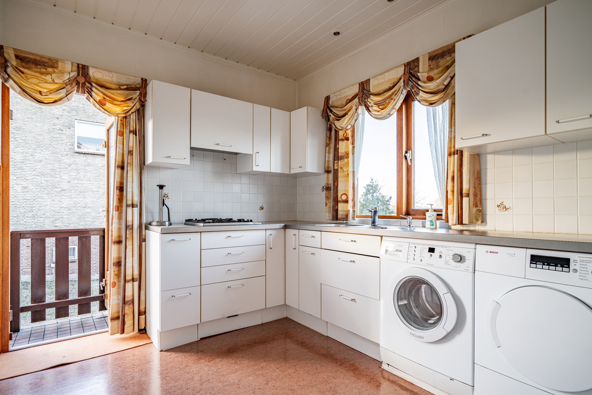 De doorzonwoonkamer is heerlijk licht dankzij de grote raampartijen. Wat hier direct in het oog springt, is het prachtige, vrije uitzicht over de landerijen – een uitzicht dat nooit verveelt. De keuken bevindt zich aan de achterzijde van de woning en biedt toegang tot de ruime kelder onder de woning.