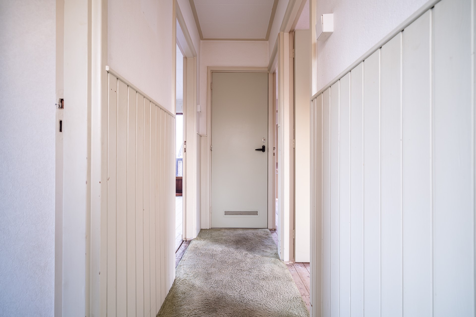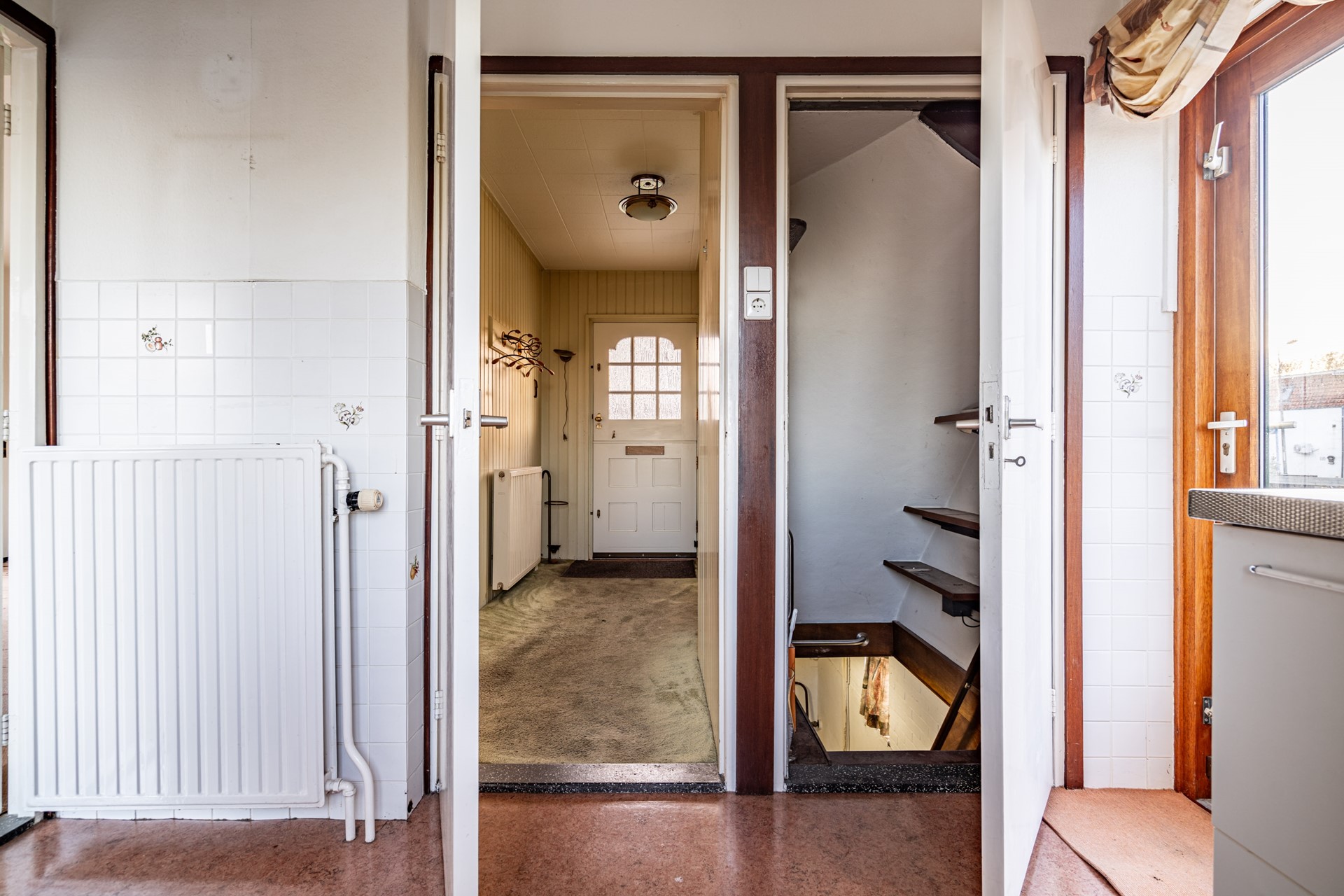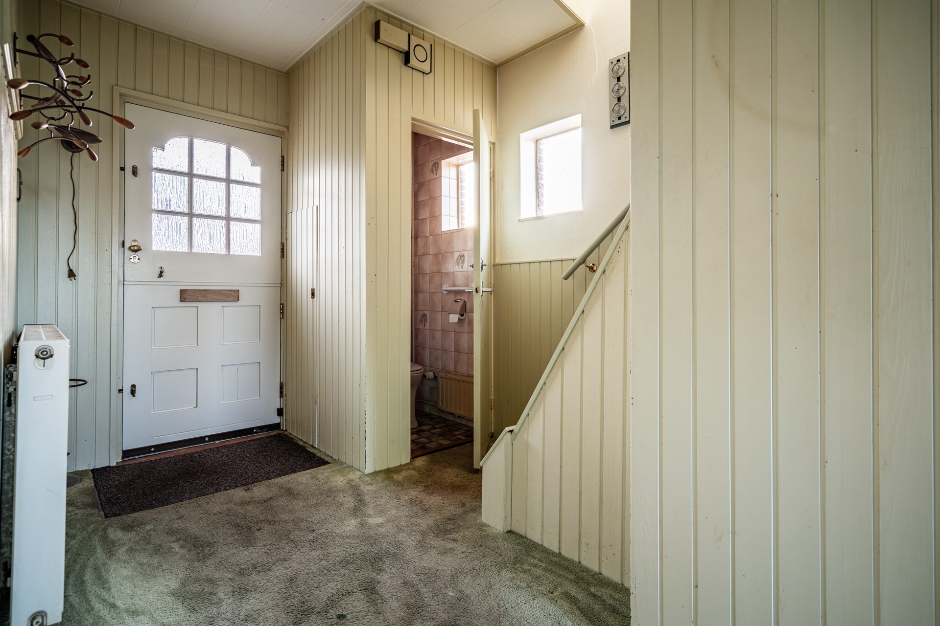 De woning kan op meerdere manieren worden betreden, maar we nemen u graag mee via de voordeur. In de ruime hal vindt u de vernieuwde meterkast (8 groepen + 2 aardlekschakelaars), een toiletruimte en de vaste trap naar de verdieping.