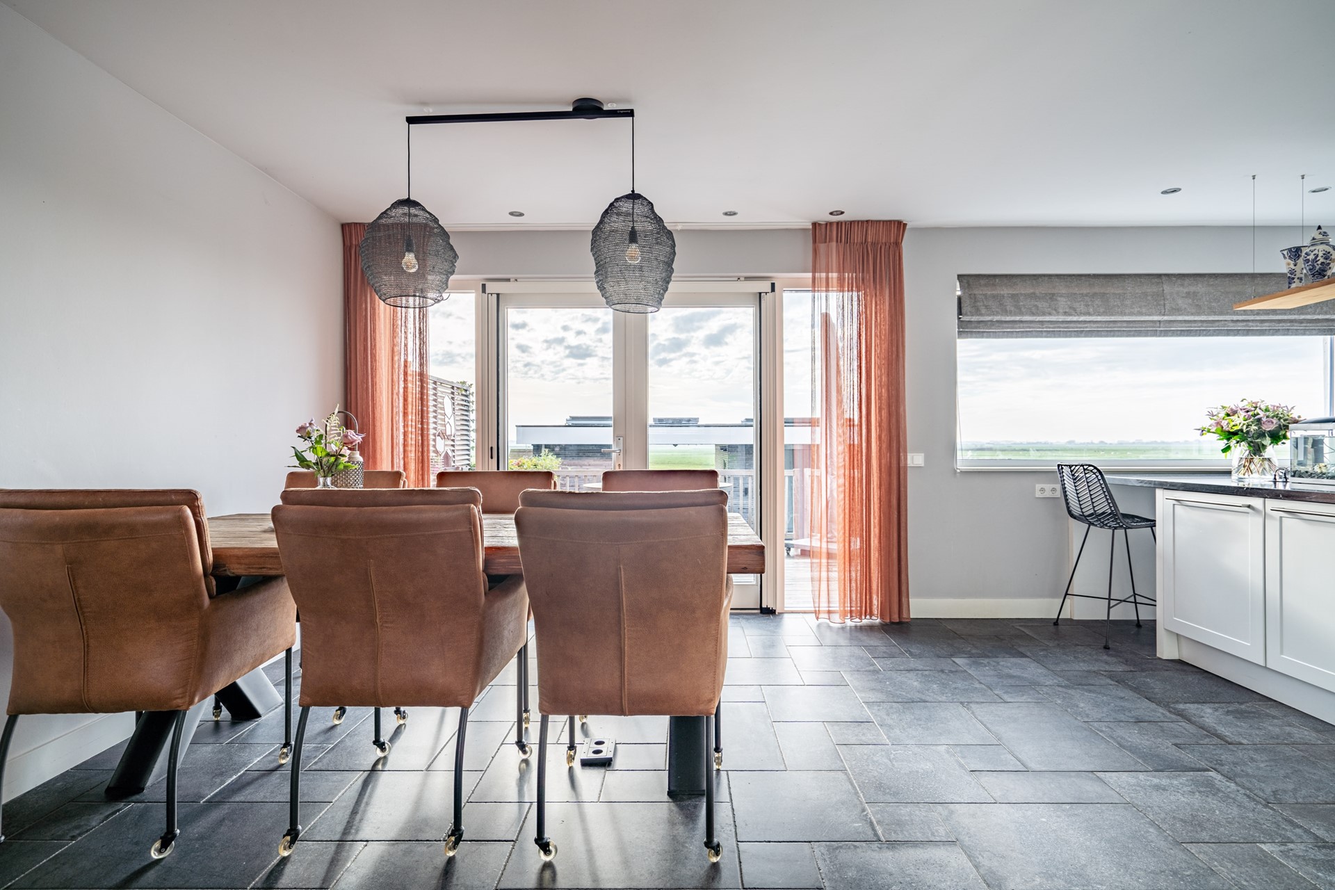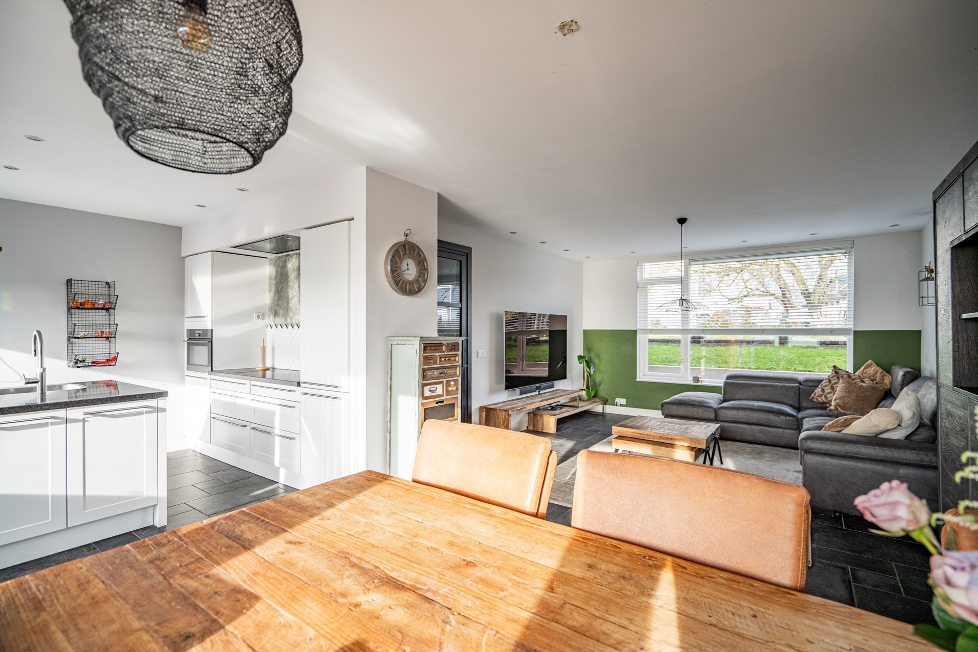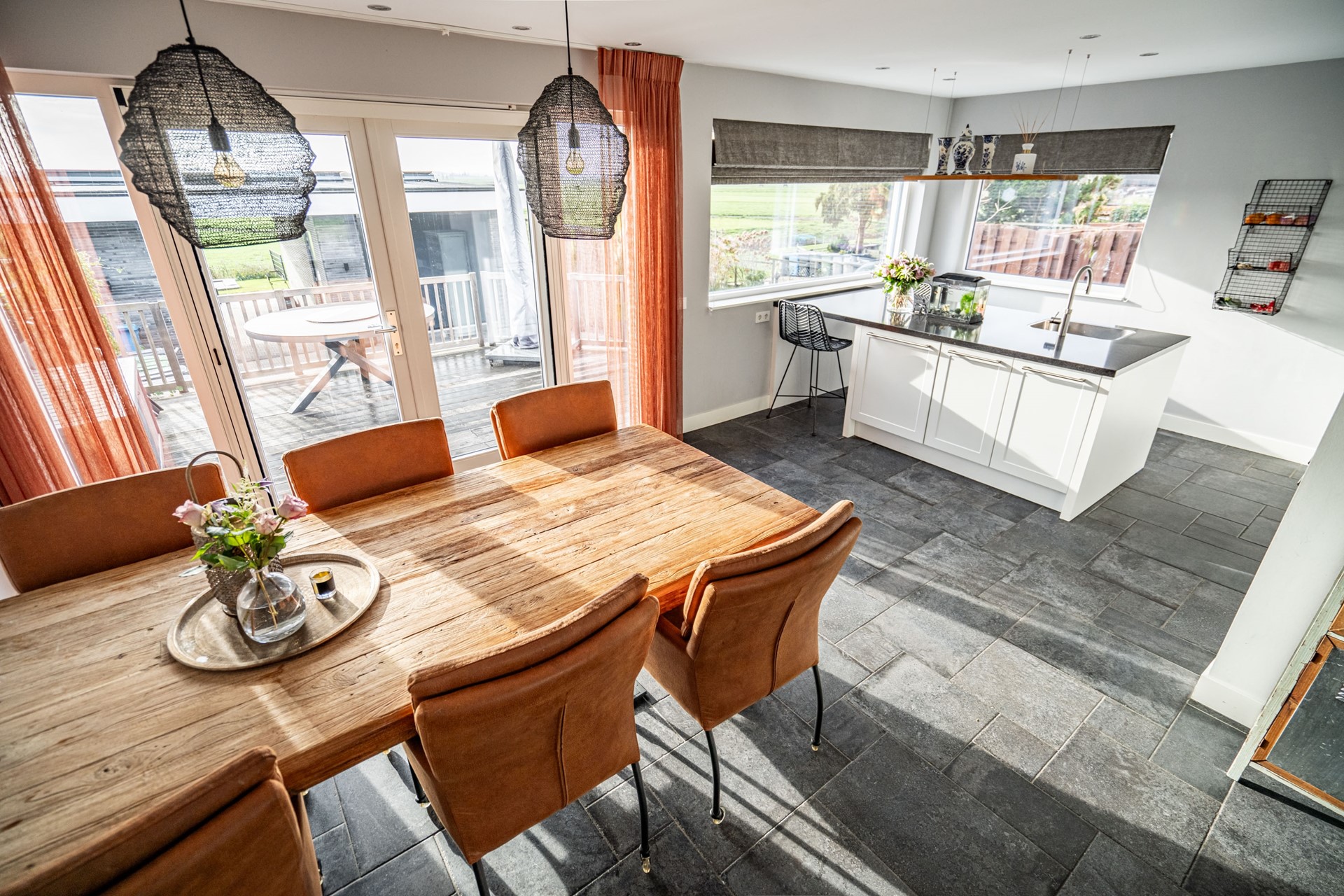 Een heerlijk lichte woonkamer met fantastisch vrij uitzicht op de weilanden aan de achterzijde.