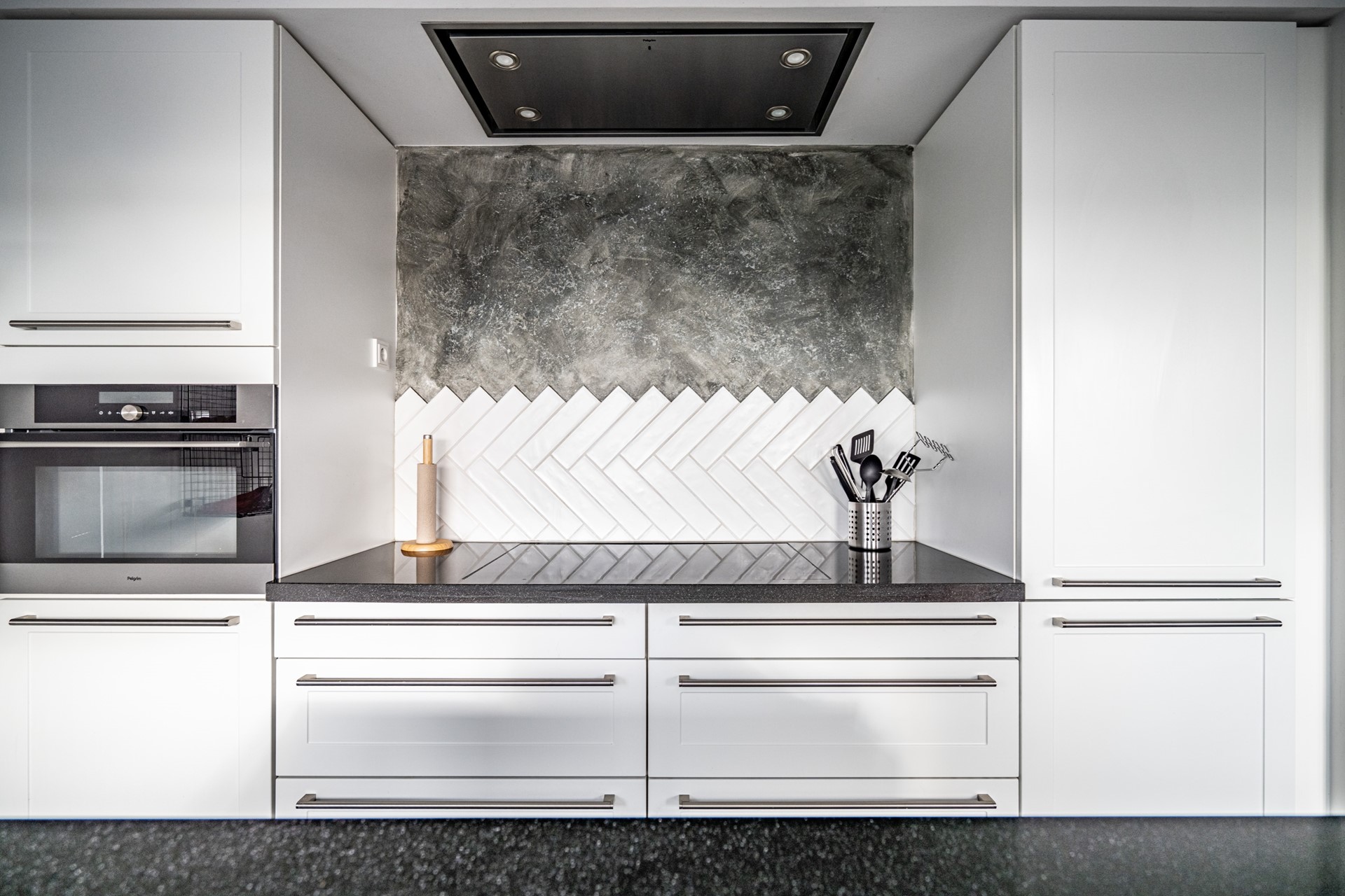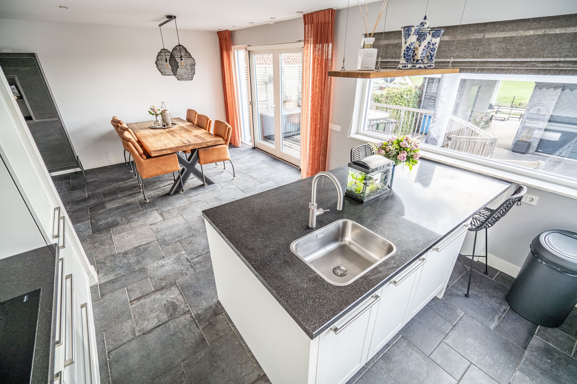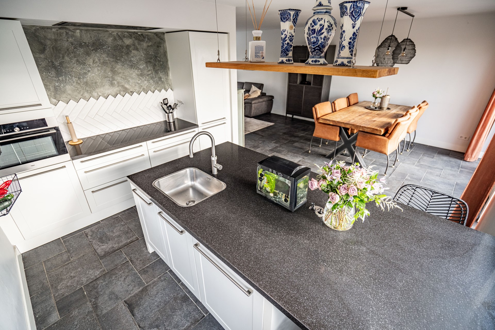 Een fraaie keuken voorzien van spoeleiland, diverse inbouwapparatuur, zoals een koel/vriescombinatie, inductiekookplaat, RVS afzuigkap, vaatwasser en inbouwoven.
