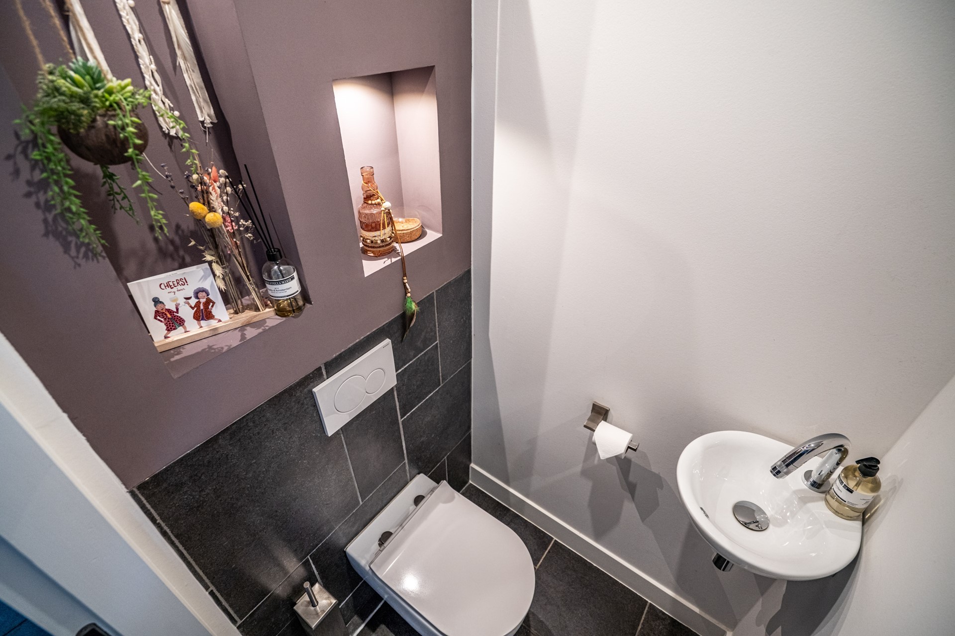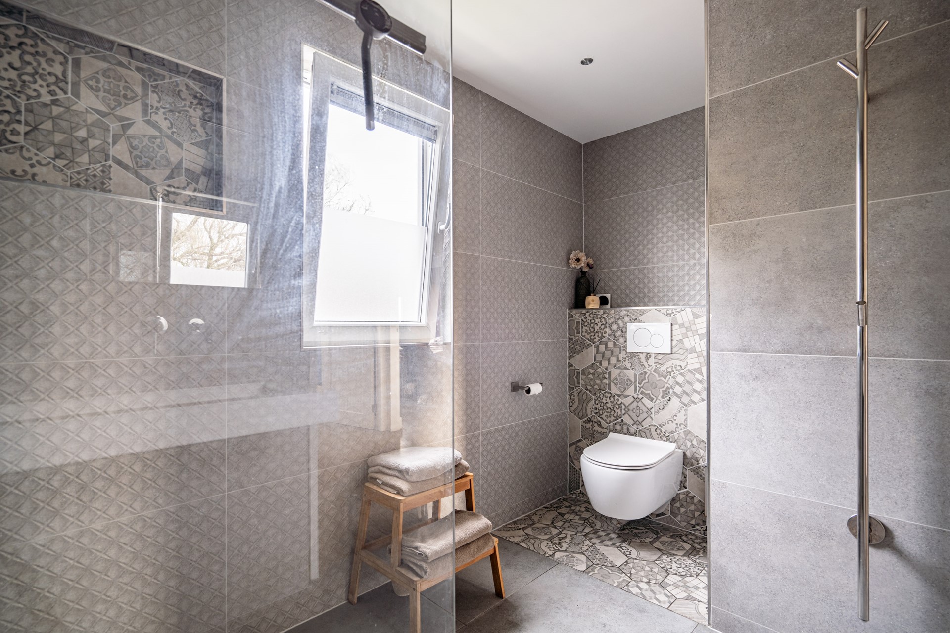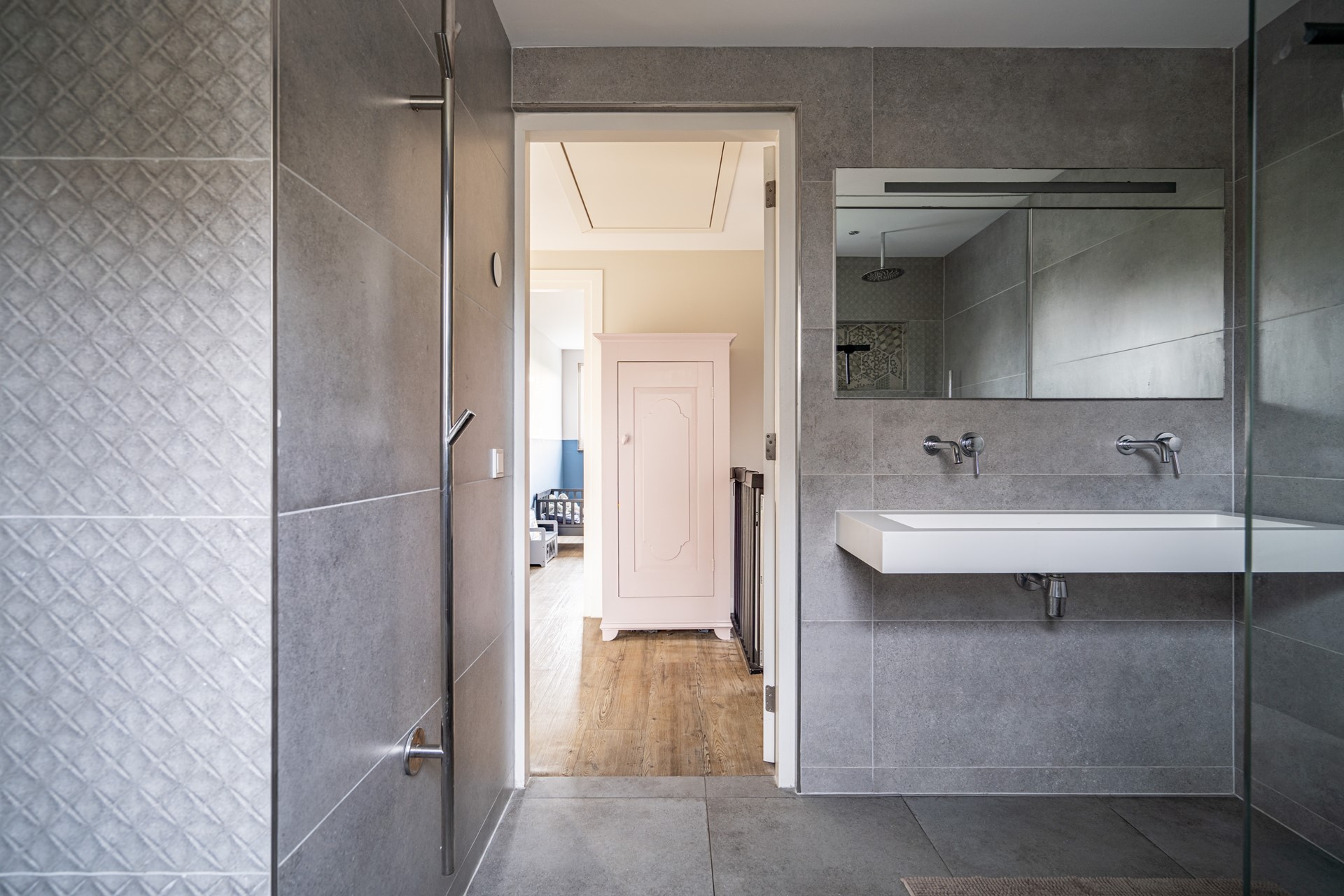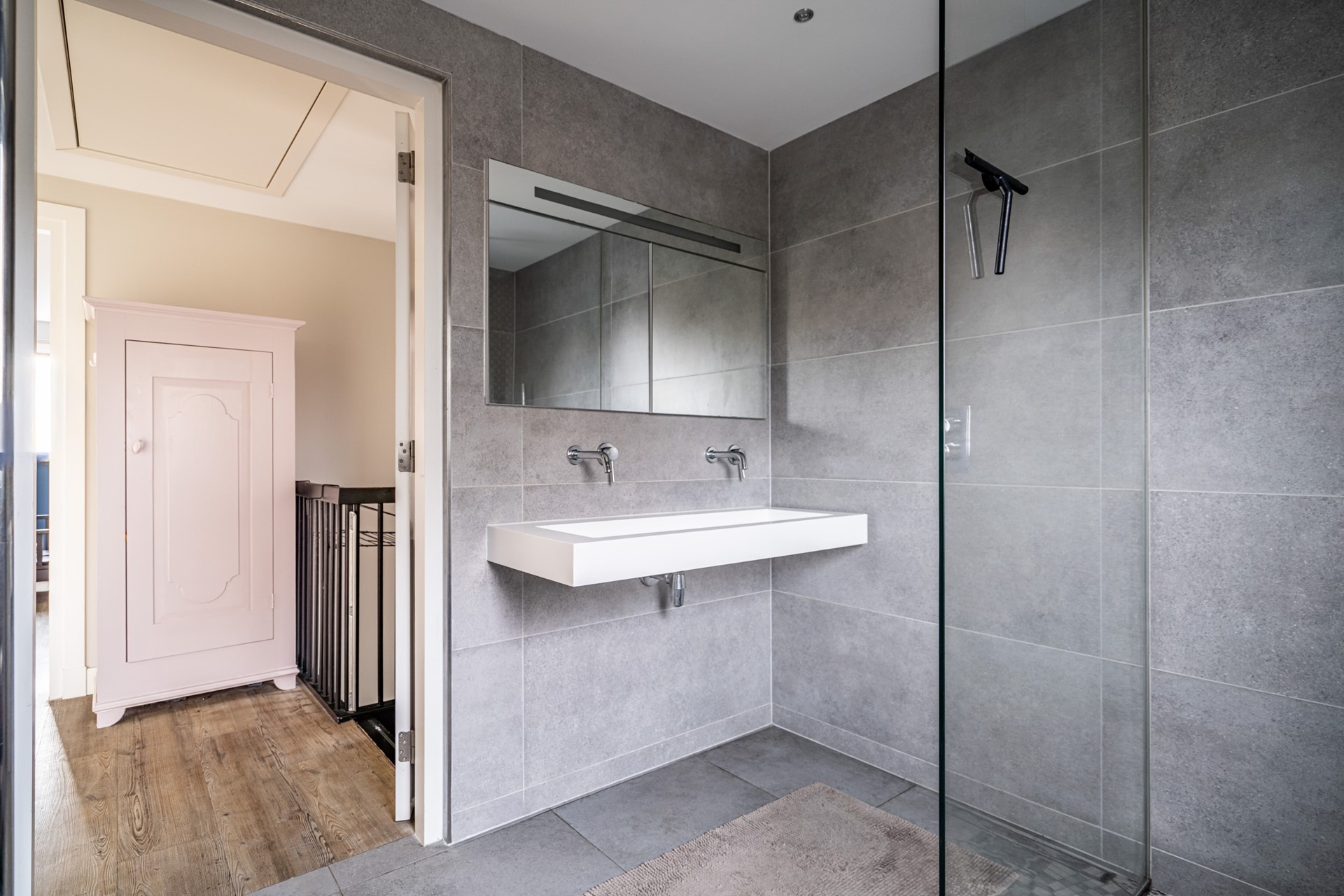 De badkamer is volledig en smaakvol betegeld, voorzien van 2e toilet en riante inloopdouche.