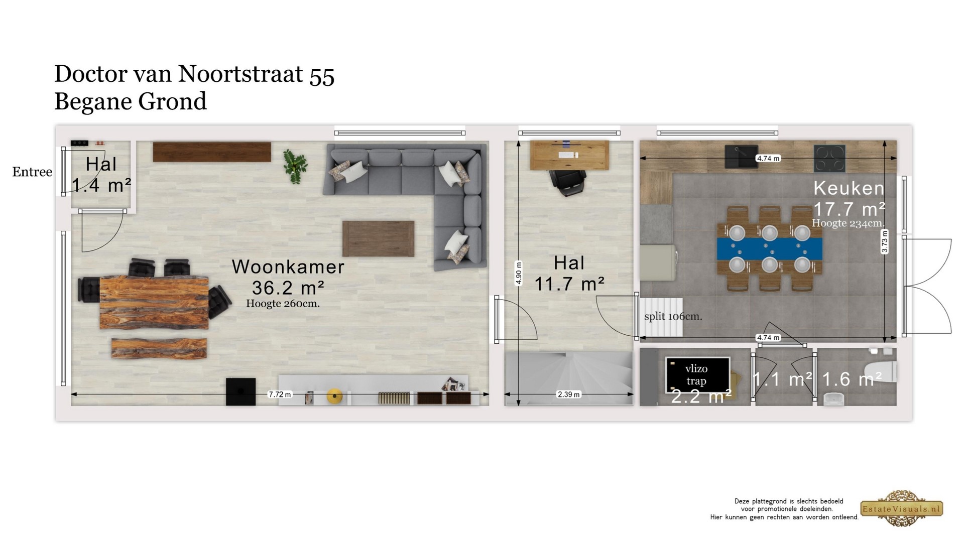 Begane grond – warm, licht en sfeervol. Bij binnenkomst betreedt u direct de woonkamer. De houten vloer, strak gestucte wanden
