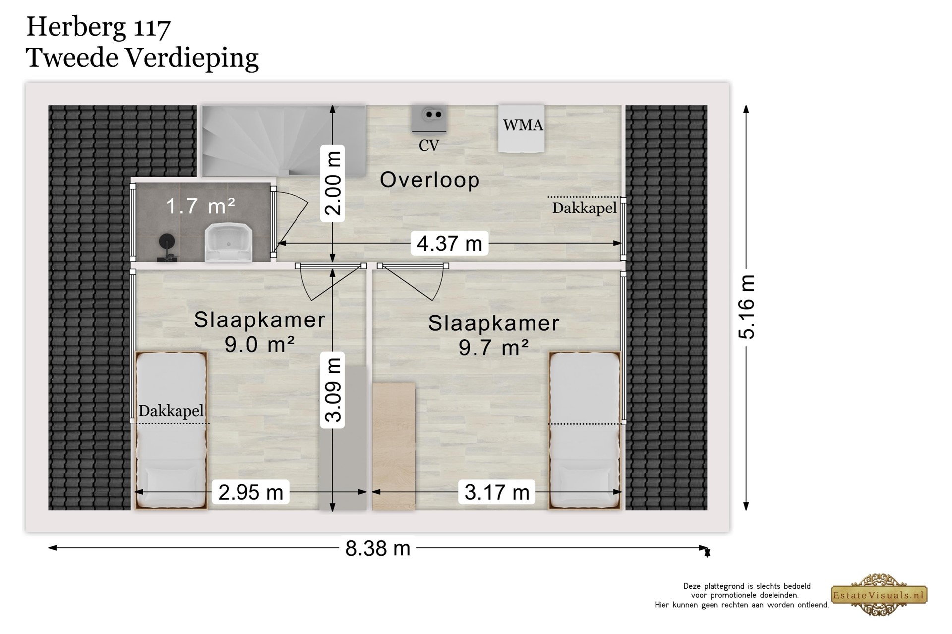 Overloop met opstelling van de Remeha cv-ketel (2017), een ruime slaapkamer aan de voorzijde met dakkapel en bergruimte in de kap, en een tweede slaapkamer aan de achterzijde eveneens met dakkapel. Daarnaast is er een eenvoudige tweede douche met wastafel en veel extra opbergruimte.