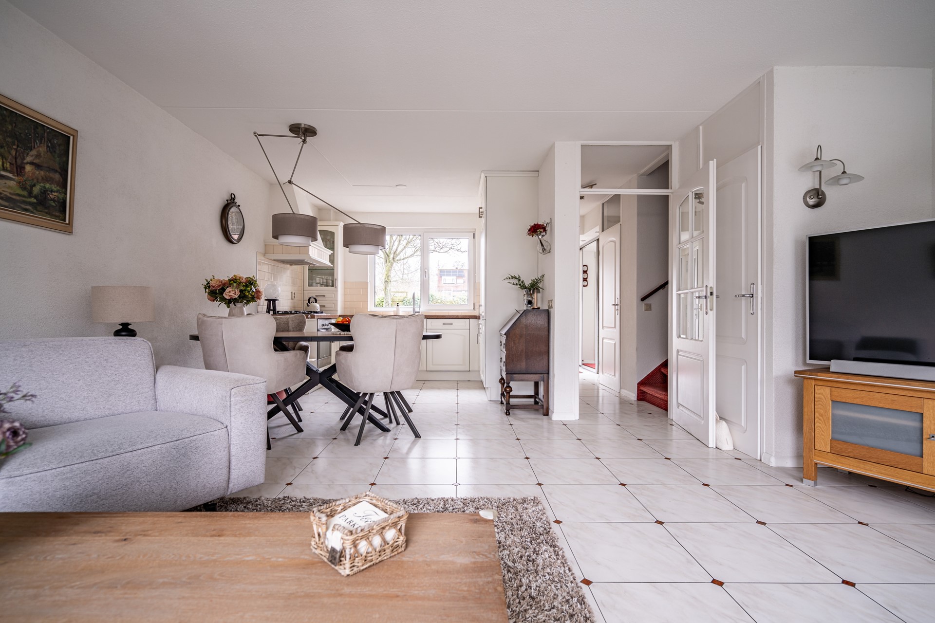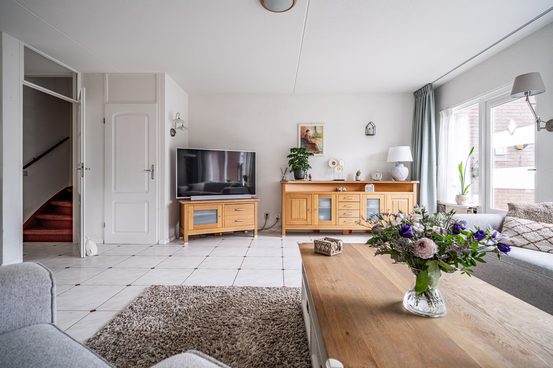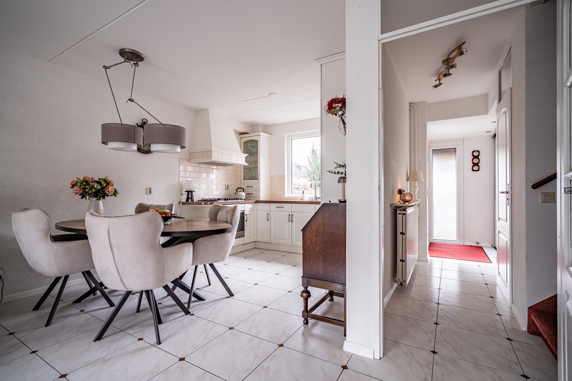 Voortuin met carport, ruime hal met meterkast, toilet met fonteintje en een lichte woon-eetkamer met trapkast. De keuken bevindt zich aan de voorzijde van de woning en biedt veel kastruimte en alle benodigde inbouwapparatuur. De gehele begane grond is voorzien van een fraaie tegelvloer.